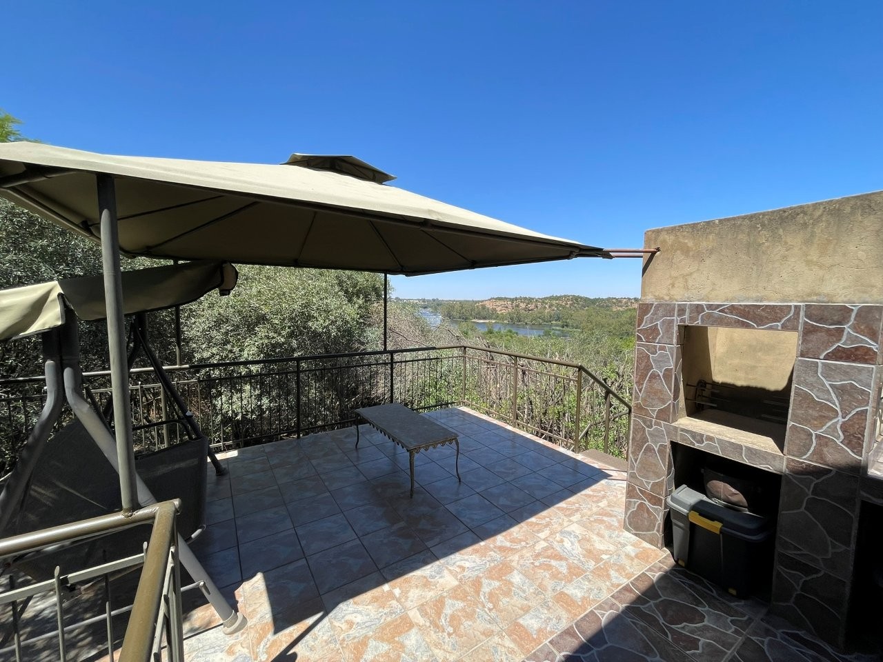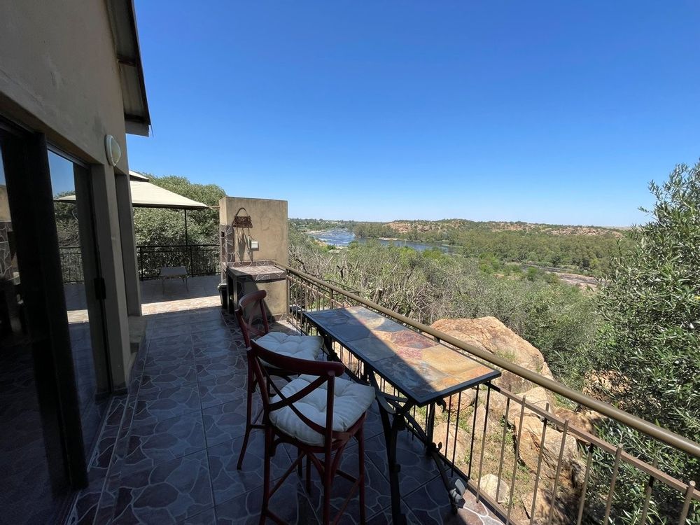 The main bedroom, featuring a luxurious full en-suite bathroom, offers wheelchair accessibility and serene views. Two upstairs guest bedrooms, each with their own bathrooms, open onto private patios where the panoramic views of the river and landscape stretch endlessly before you. A large upstairs patio with a built-in braai invites you to enjoy your morning coffee or sundowners while watching the ever-changing river scene below.