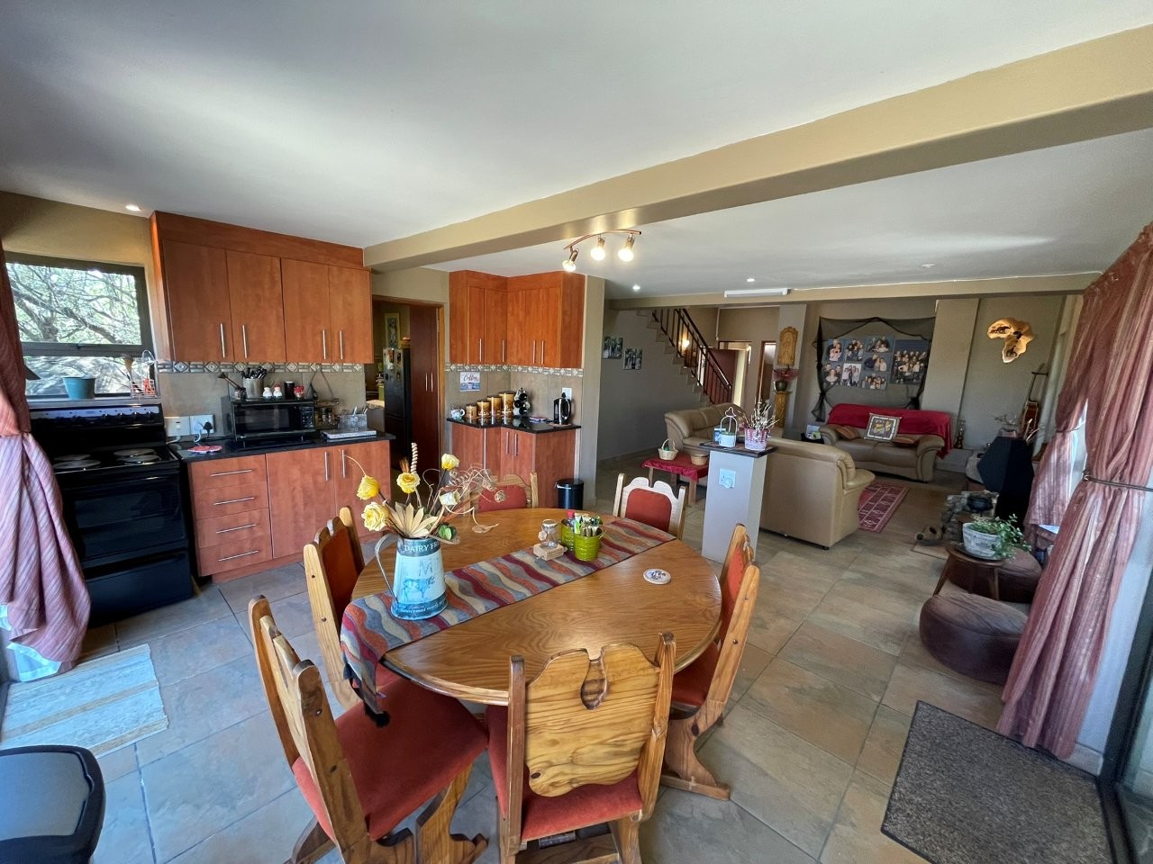 The spacious open-plan lounge, dining area, and kitchen flow effortlessly onto a large covered patio with a built-in braai, ideal for entertaining or quiet moments surrounded by the sights and sounds of the bush. An inviting open-air boma, set among trees and granite rocks, provides the perfect spot for fireside evenings under the stars.