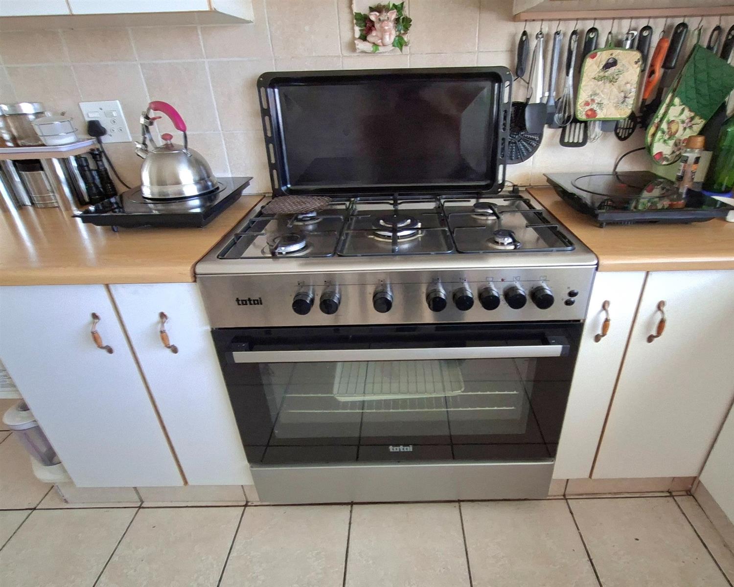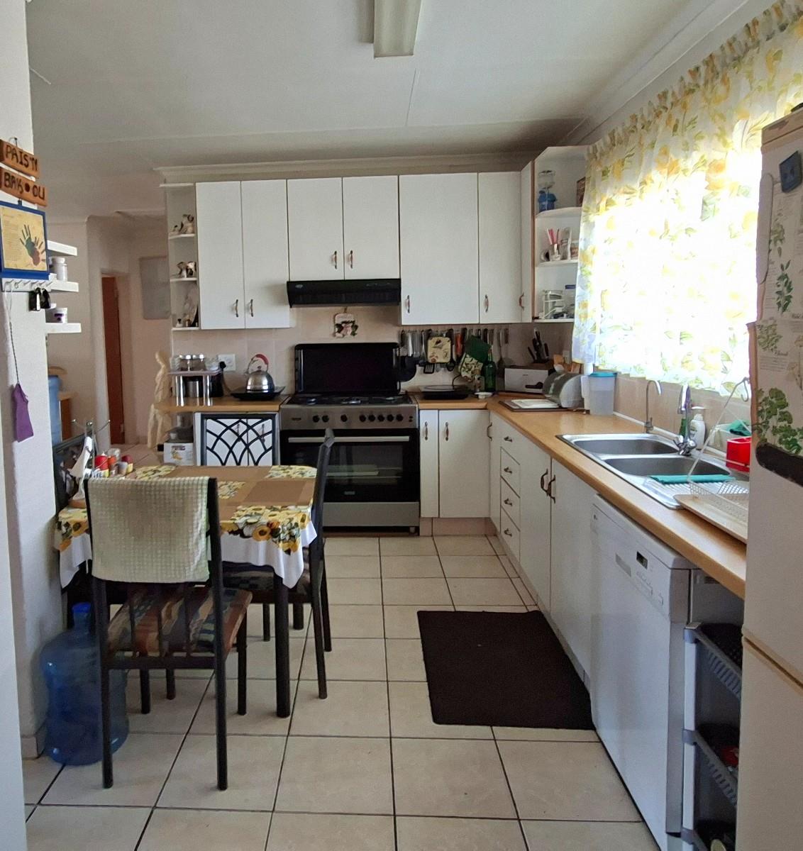 The air-conditioned open-plan lounge and living areas flow seamlessly into the dining area and a stylish, well-equipped kitchen featuring quality built-in cupboards, a gas hob, an electric oven, and dishwasher connections.