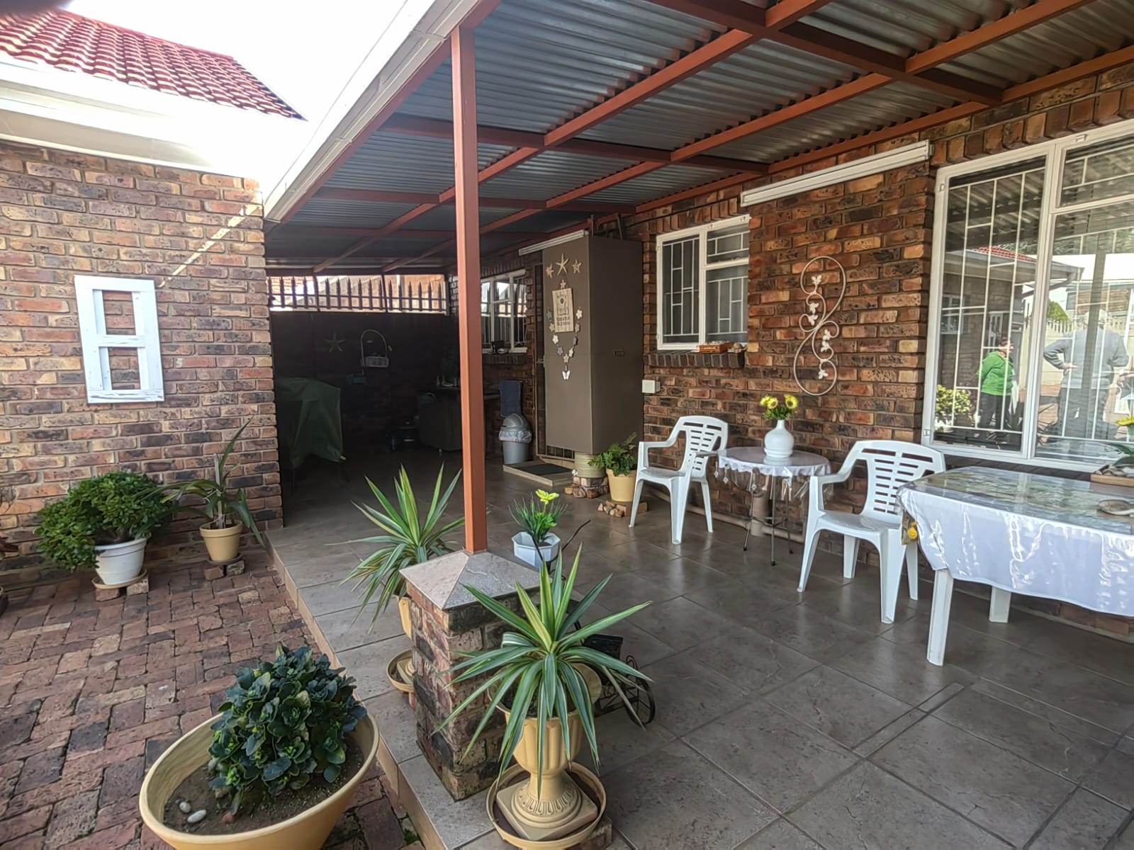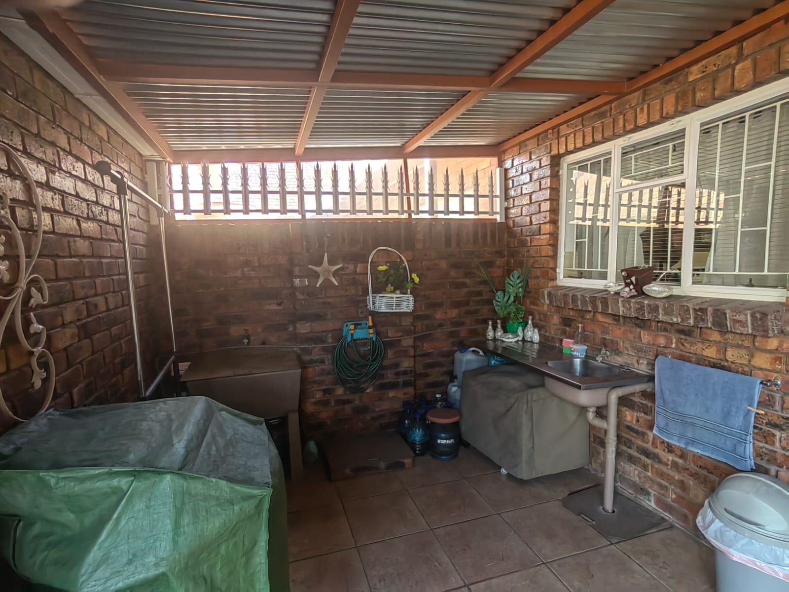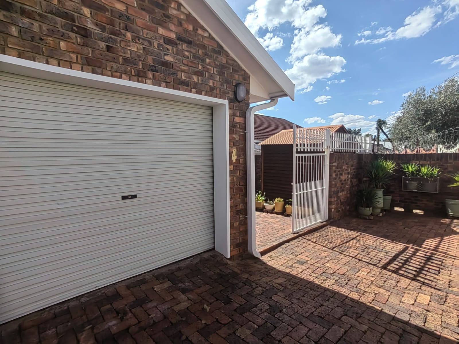 This charming townhouse is one of eight in a well-maintained complex. It features two bedrooms, both equipped with built-in cupboards. The full bathroom has been recently renovated and includes a relaxing corner bath. The open-plan lounge and dining area create a welcoming atmosphere, leading to a delightful sunroom with aluminum windows and a sliding door, secured with trellises for added peace of mind.
