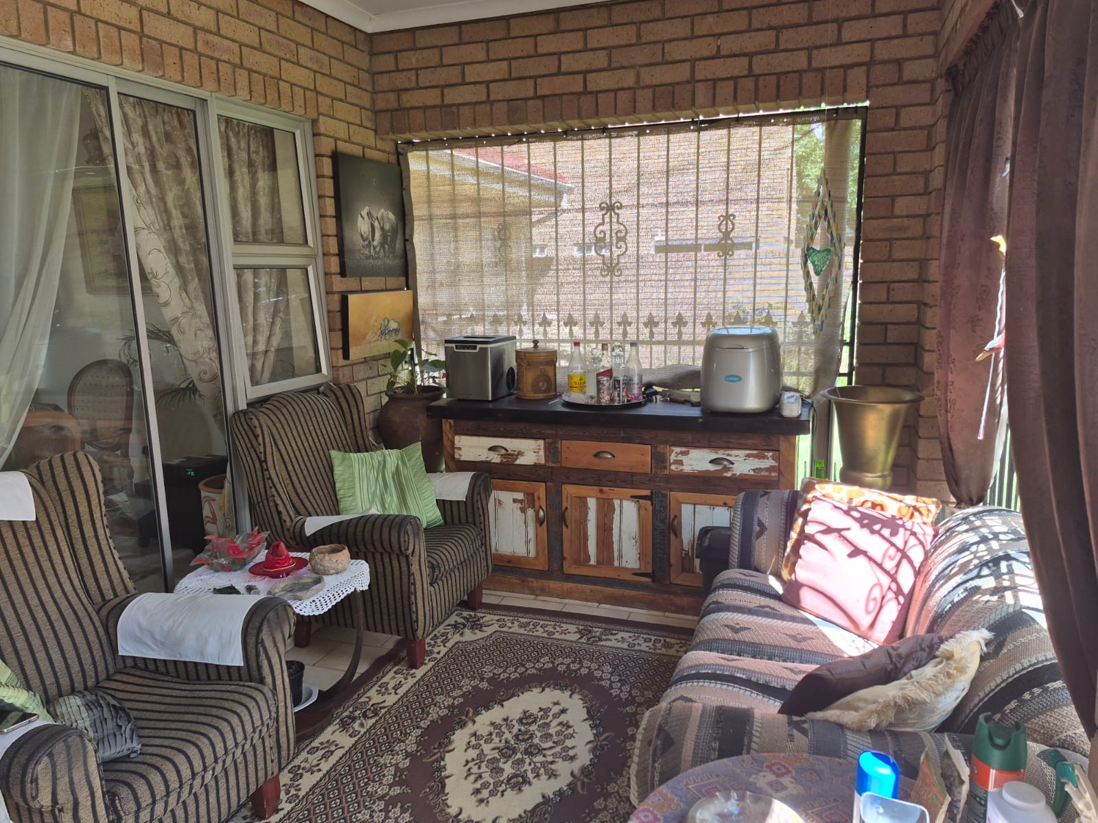 Enclosed front patio that can serve as a cozy TV room, perfect for enjoying the afternoon sun.