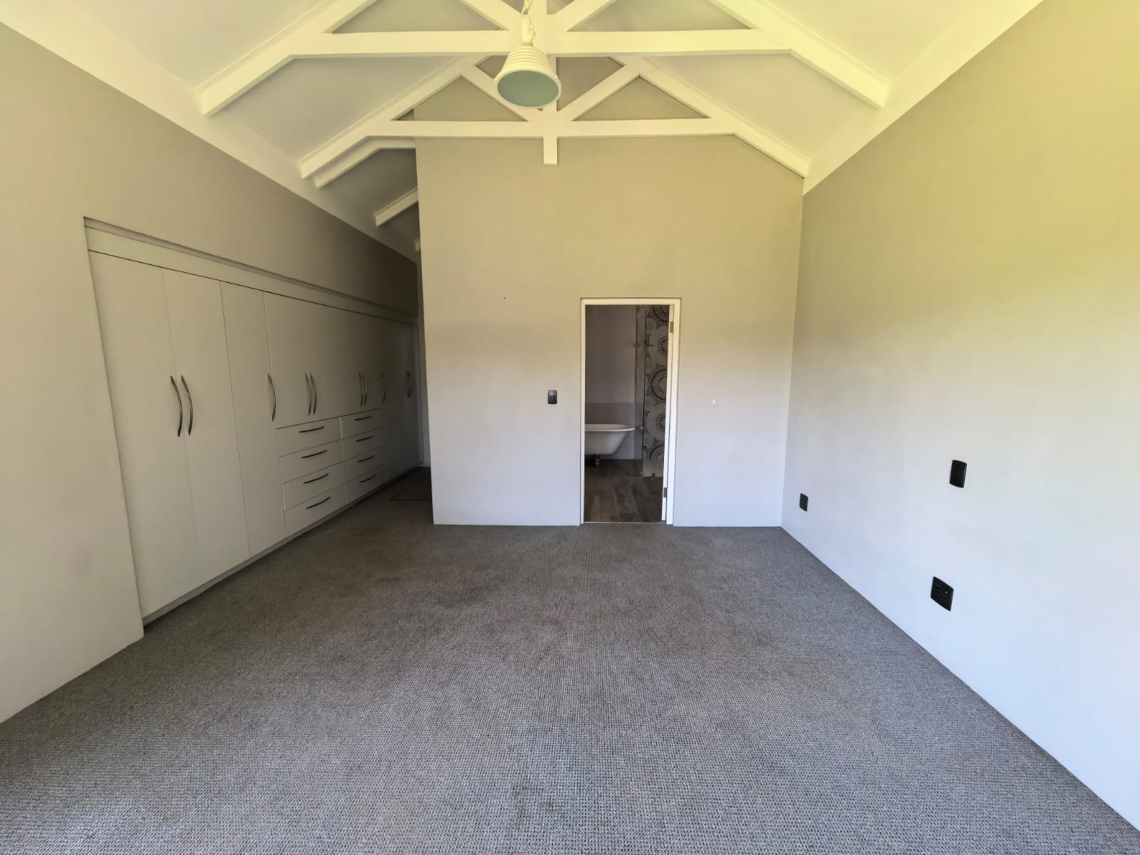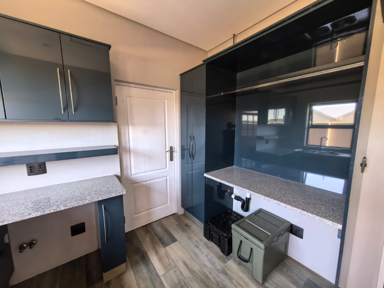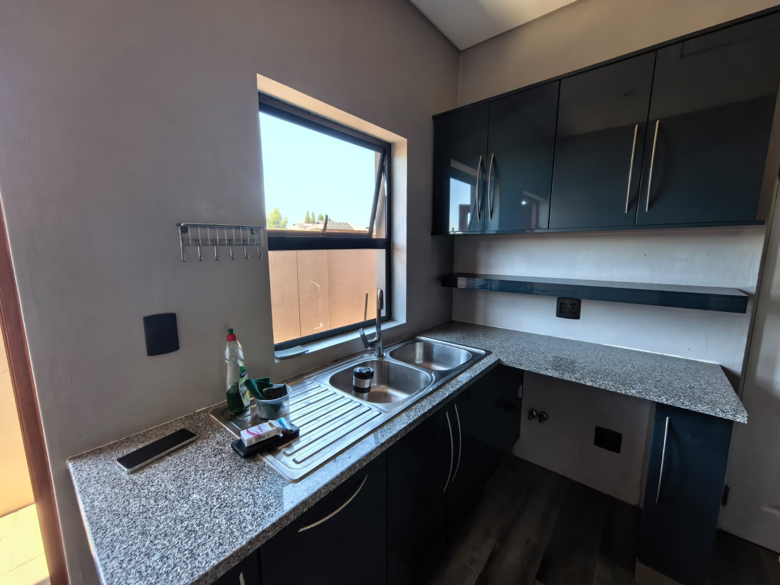 - An open-plan lounge, dining area, and kitchen, complete with a separate scullery. The kitchen features elegant petrol blue cabinetry and has a separate scullery.