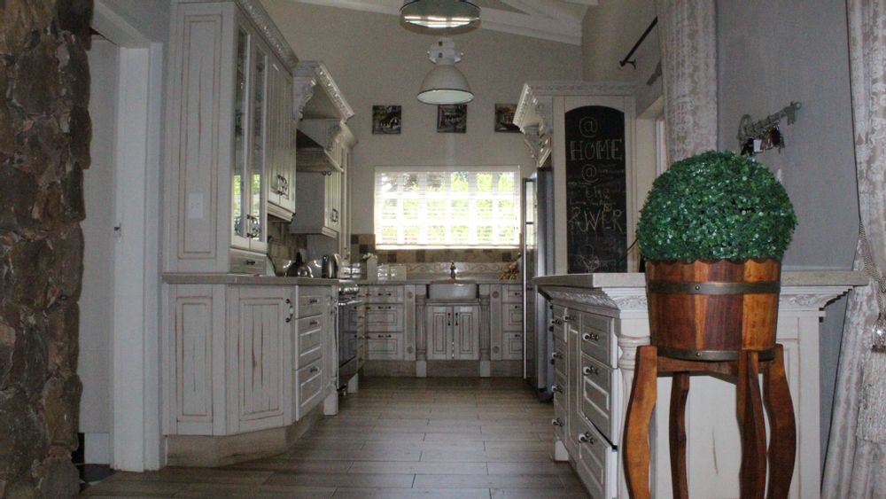 Expect to be impressed the moment you enter the property. Awesome patio overlooking the garden with view of the flowing river, all sliding doors and windows allows for natural light and captures the beauty of the area. A well-proportioned lounge with built-in combustion oven for those cold wintery nights flowing into a dining area and modern kitchen with separate pantry and scullery area. Smeg stove and ceaser stone tops contributes to the magic of the kitchen.