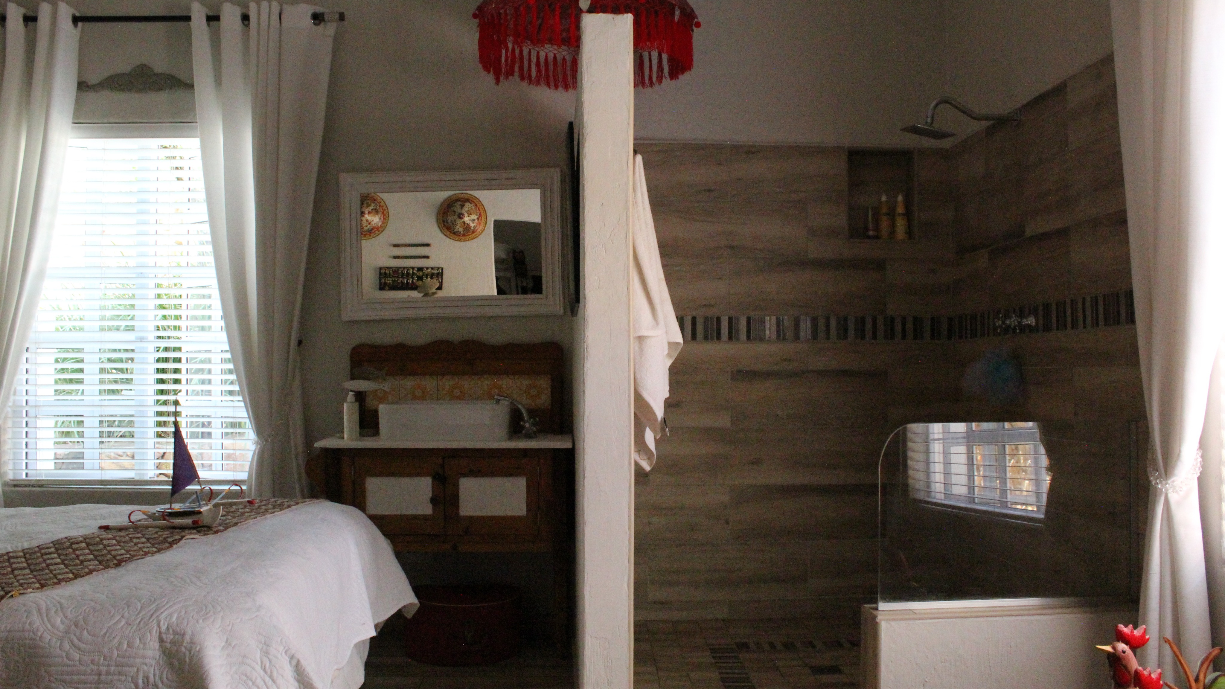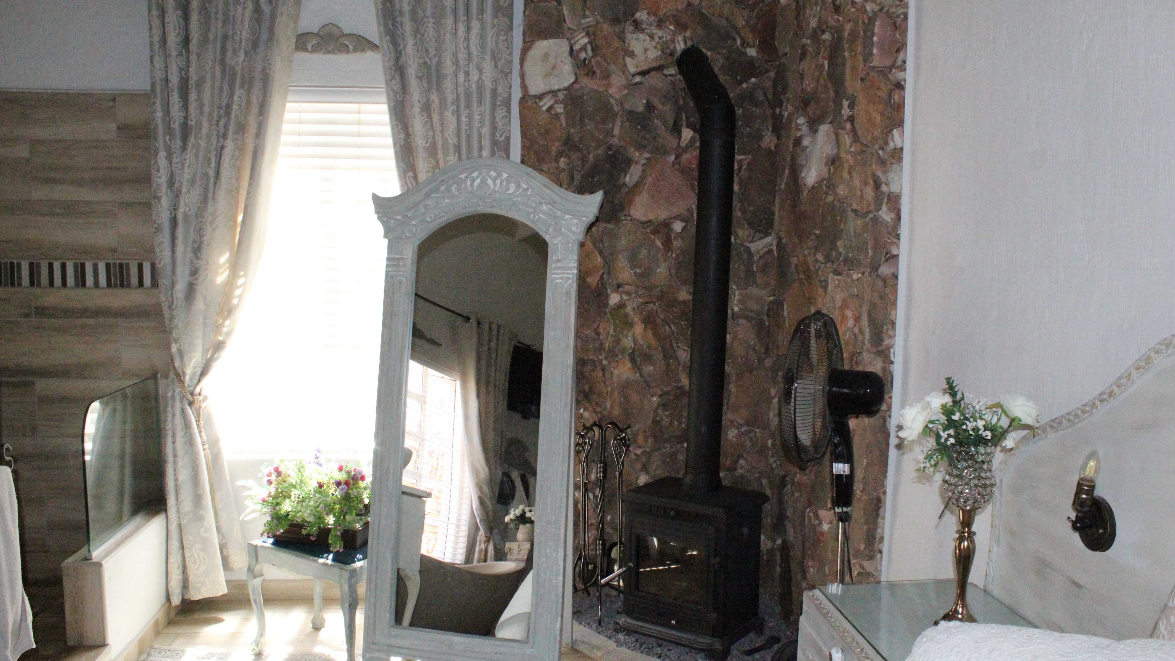 The bedroom wing consists of a sumptuous main bedroom with a walk-in closet and full modern bathroom as well as a fireplace by way of a combustion oven. The second bedroom has a built-in cupboard and modern bathroom.