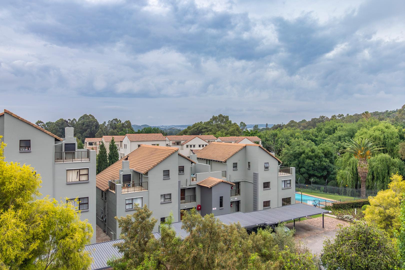 Covered carport, pool in complex, lovely park/ kids play area.