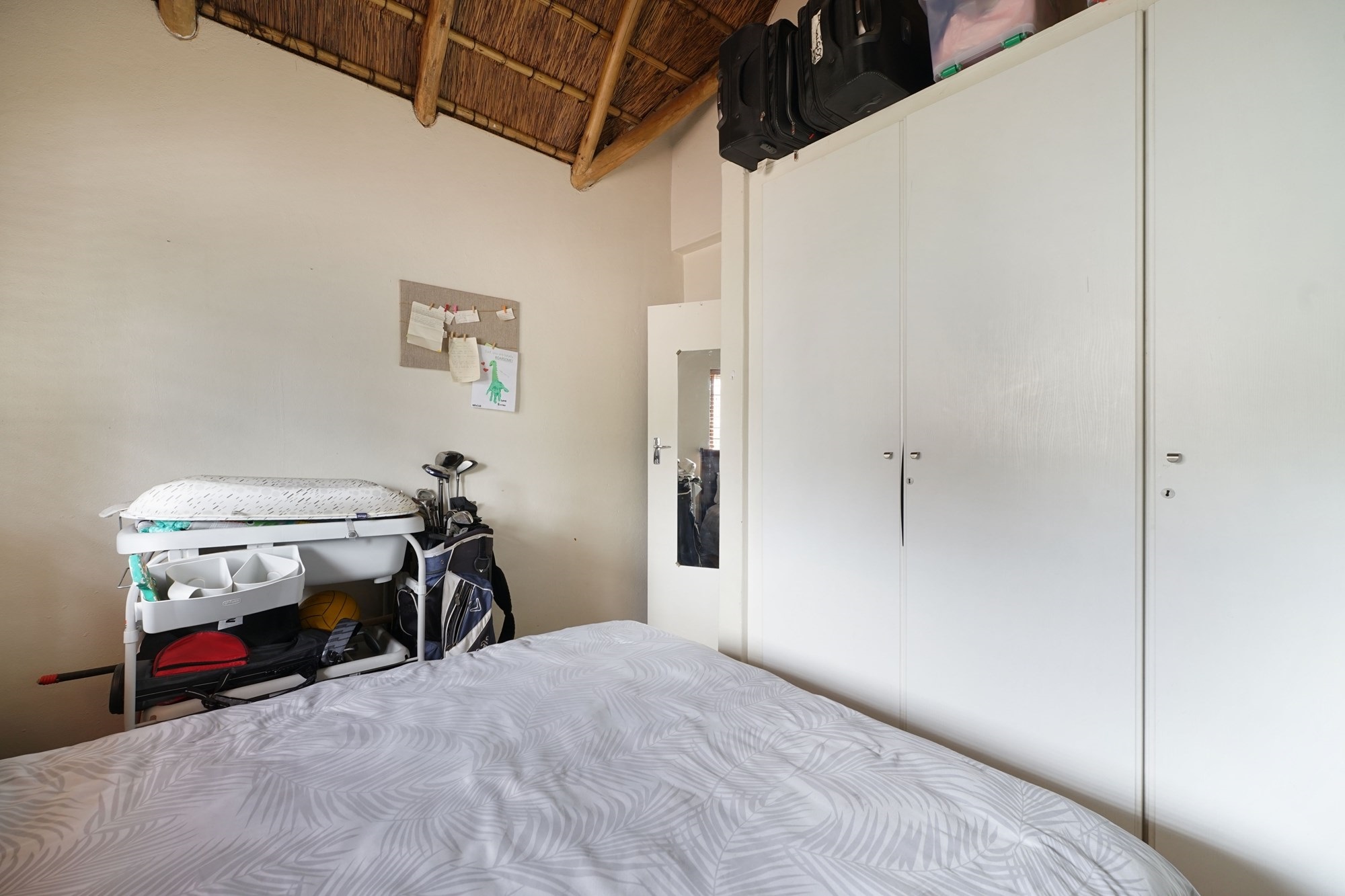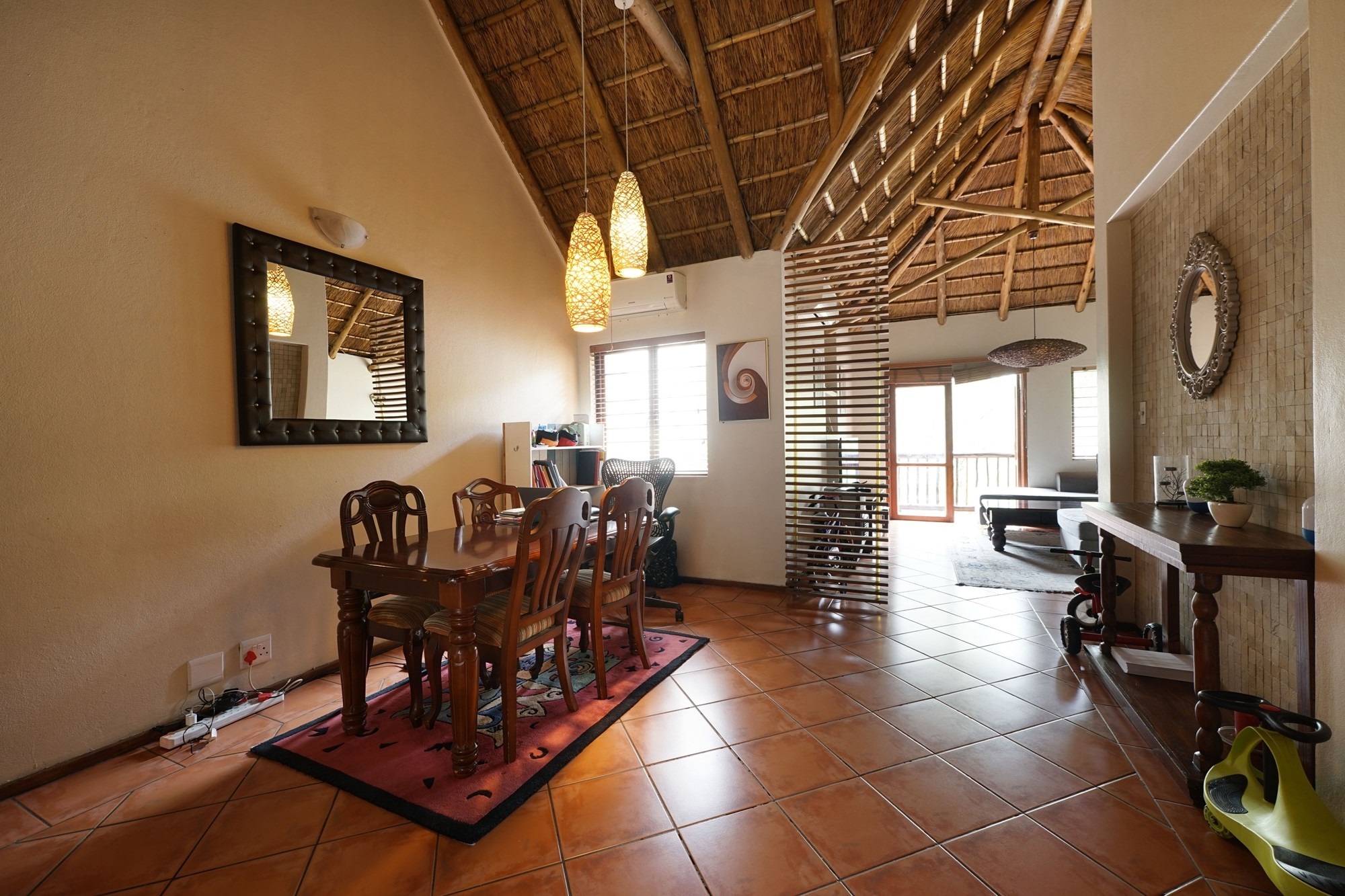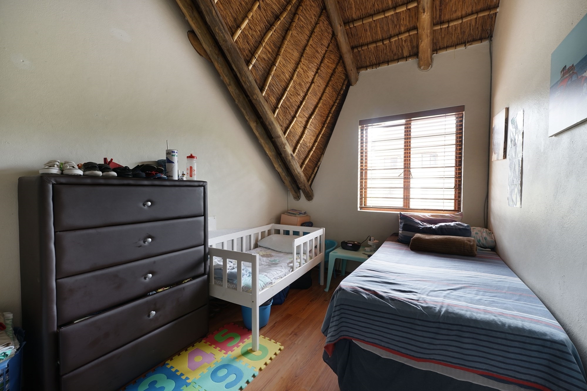 Key Features:Open-Plan Living:The modern kitchen boasts ample cupboard space, seamlessly flowing into the dining area and reception, which lead to a cozy lounge – perfect for entertaining or relaxing.Master Bedroom Oasis:The spacious master bedroom features an en-suite bathroom with a bath and toilet.Guest-Friendly Design:A full guest bathroom with a bath, shower, and toilet caters to family and visitors alike.Comfortable Guest Rooms:Two additional bedrooms with built-in cupboards provide versatility for family, guests, or a home office.Rustic Charm:The thatched roof and high ceilings create a warm and inviting ambiance throughout the apartment.Ample Parking:Includes two covered parking bays for your convenience.