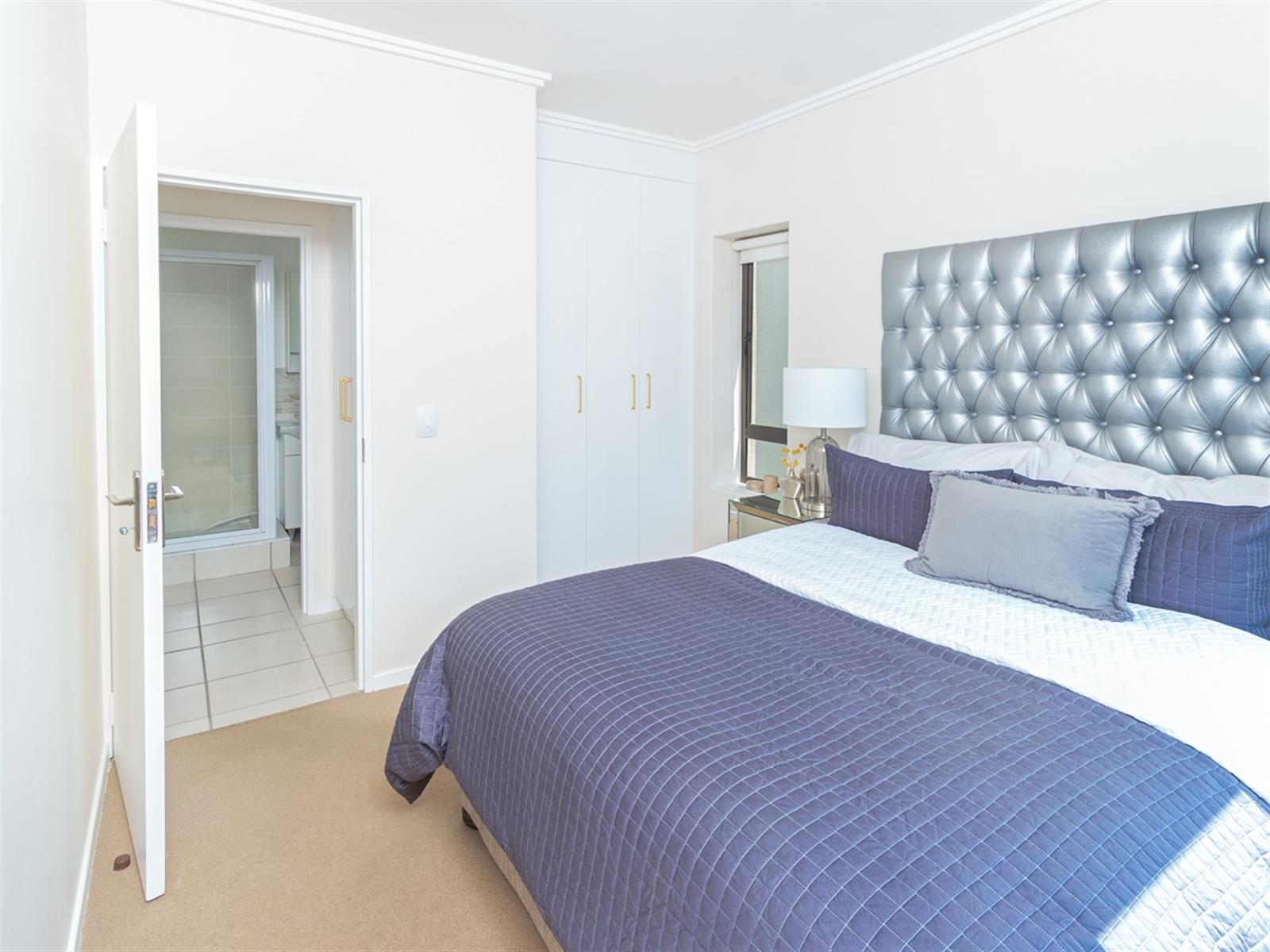 The bedroom is serene and sun-drenched, featuring ample built-in cupboards, with a full bathroom, offering modern convenience and comfort.