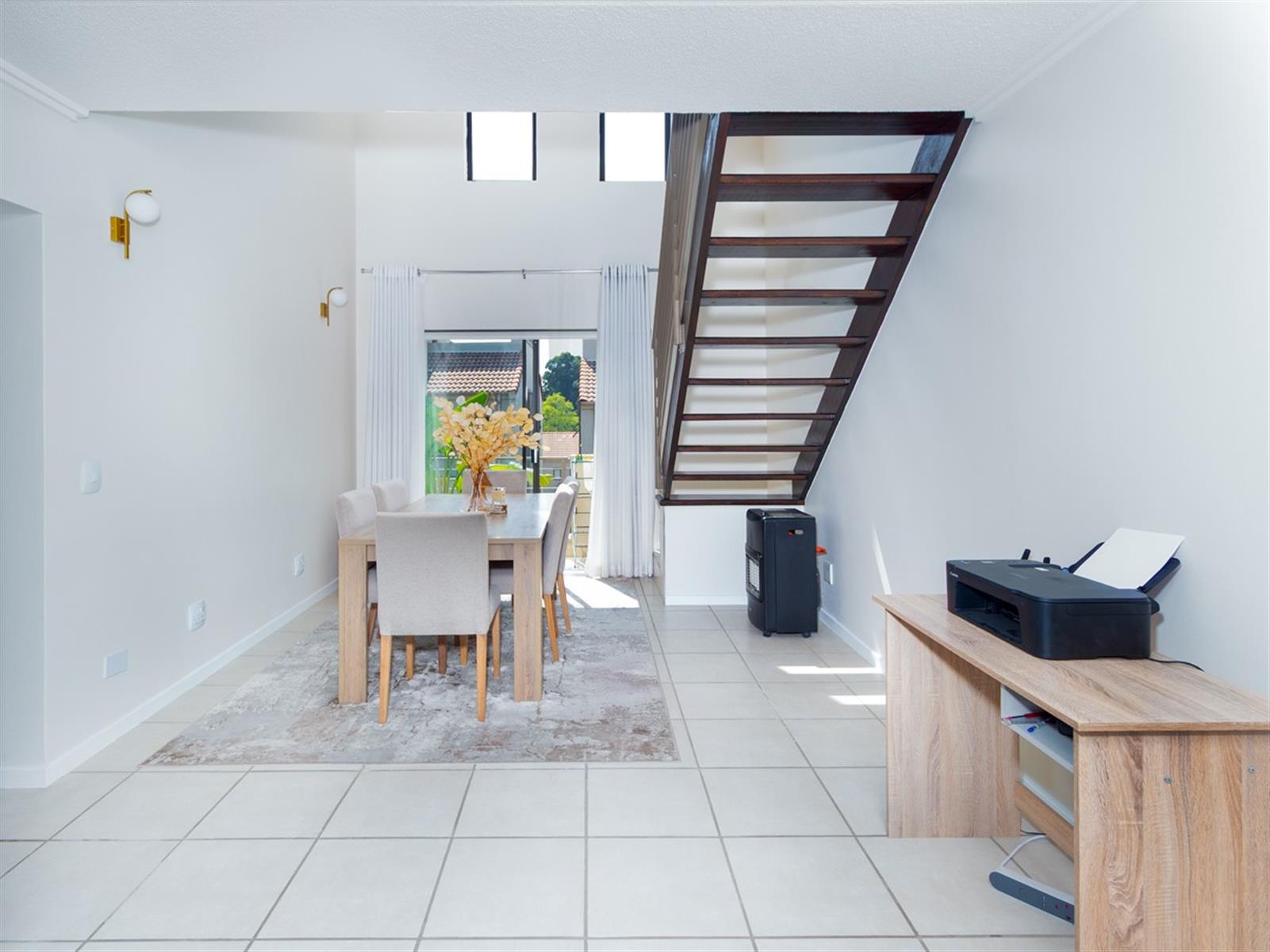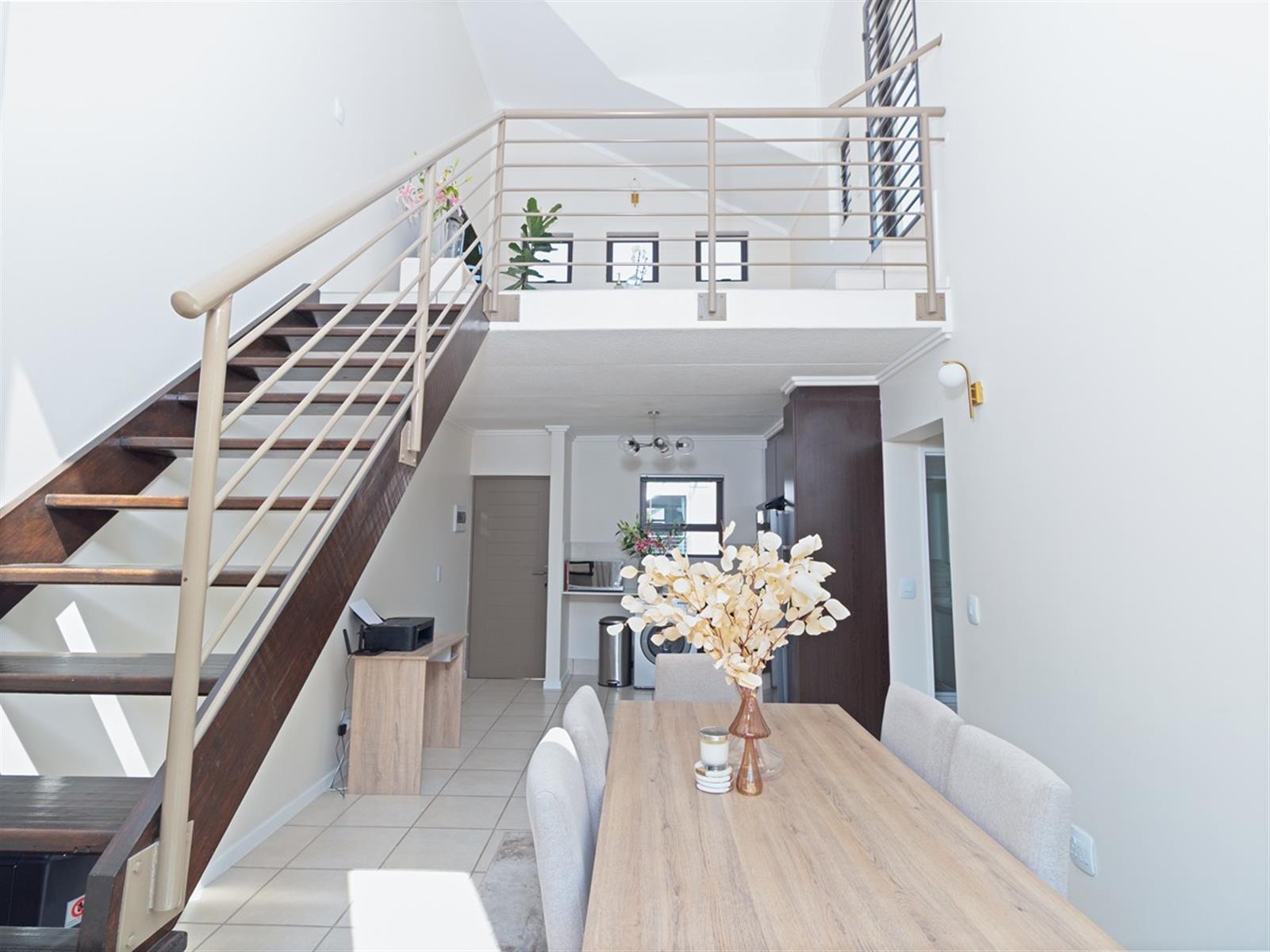 On the lower level, a bright and airy open-plan kitchen and dining space welcomes you with Caesarstone countertops, an electric hob, and room for two wet appliances, making it as functional as it is elegant. The dining area boasts double-volume ceilings and celestial windows, opening onto a private balcony that invites morning coffees and sunset views.