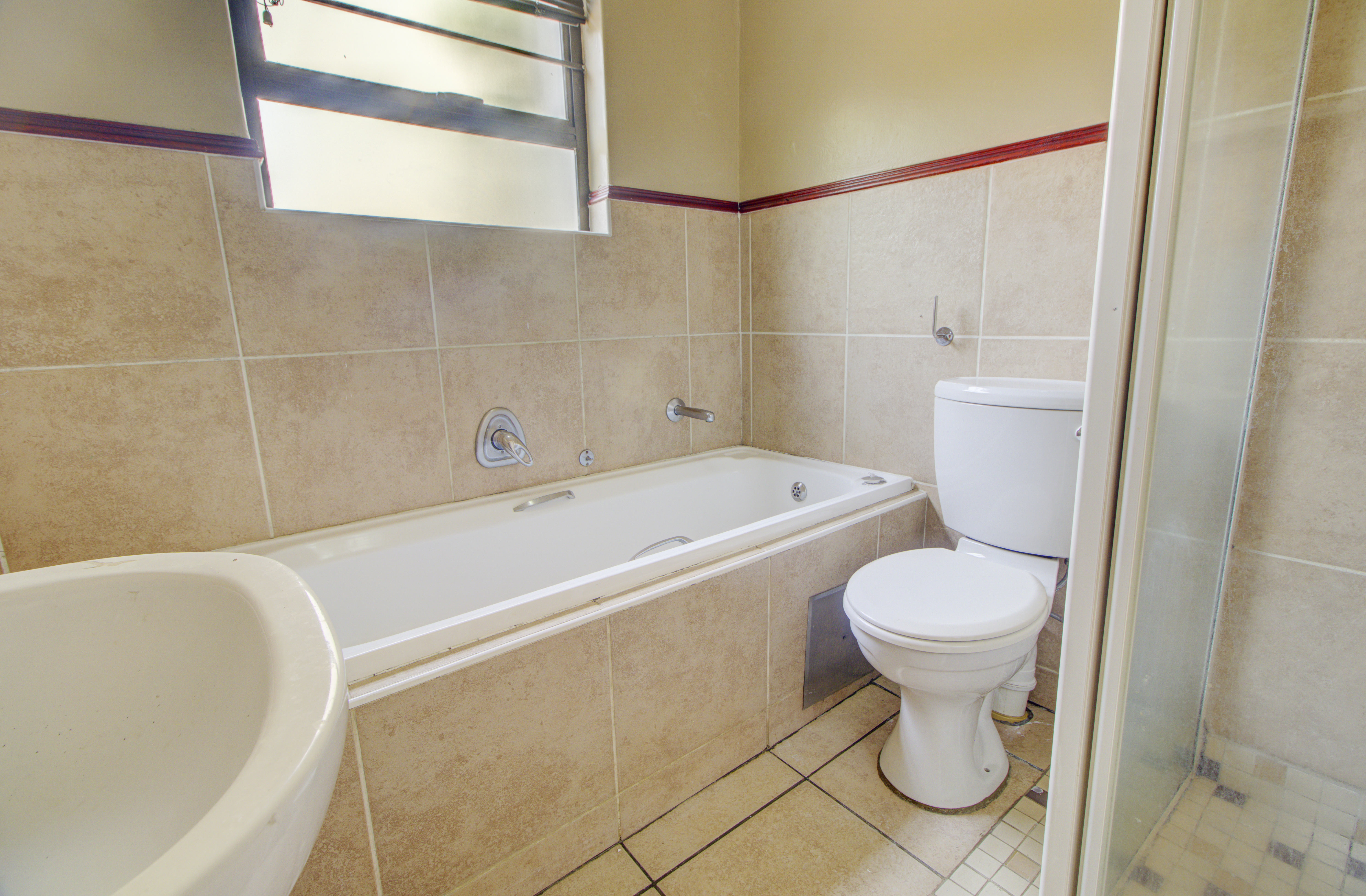 The apartment includes a full bathroom equipped with both a bath and a separate shower.
