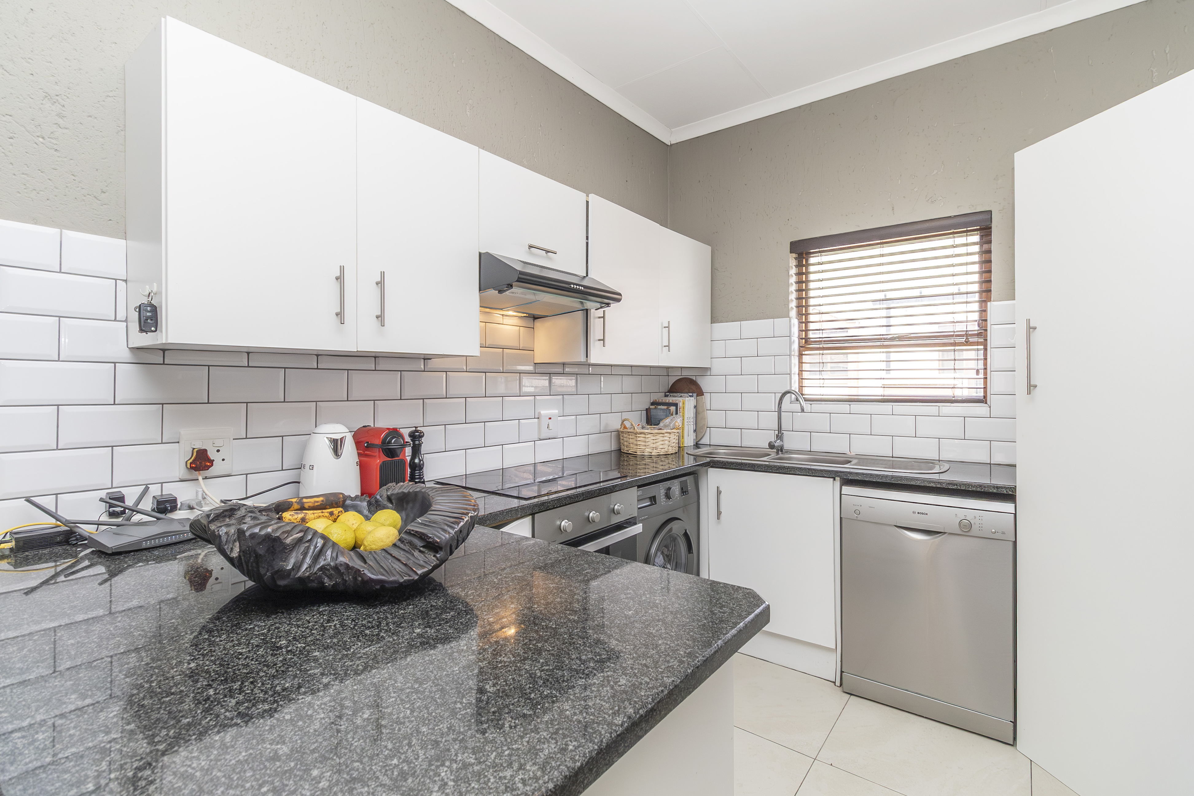 - A contemporary modern kitchen featuring a pantry, double sink, space for two under-counter appliances, granite countertops, an electric hob, oven, extractor fan, and stylish blinds.