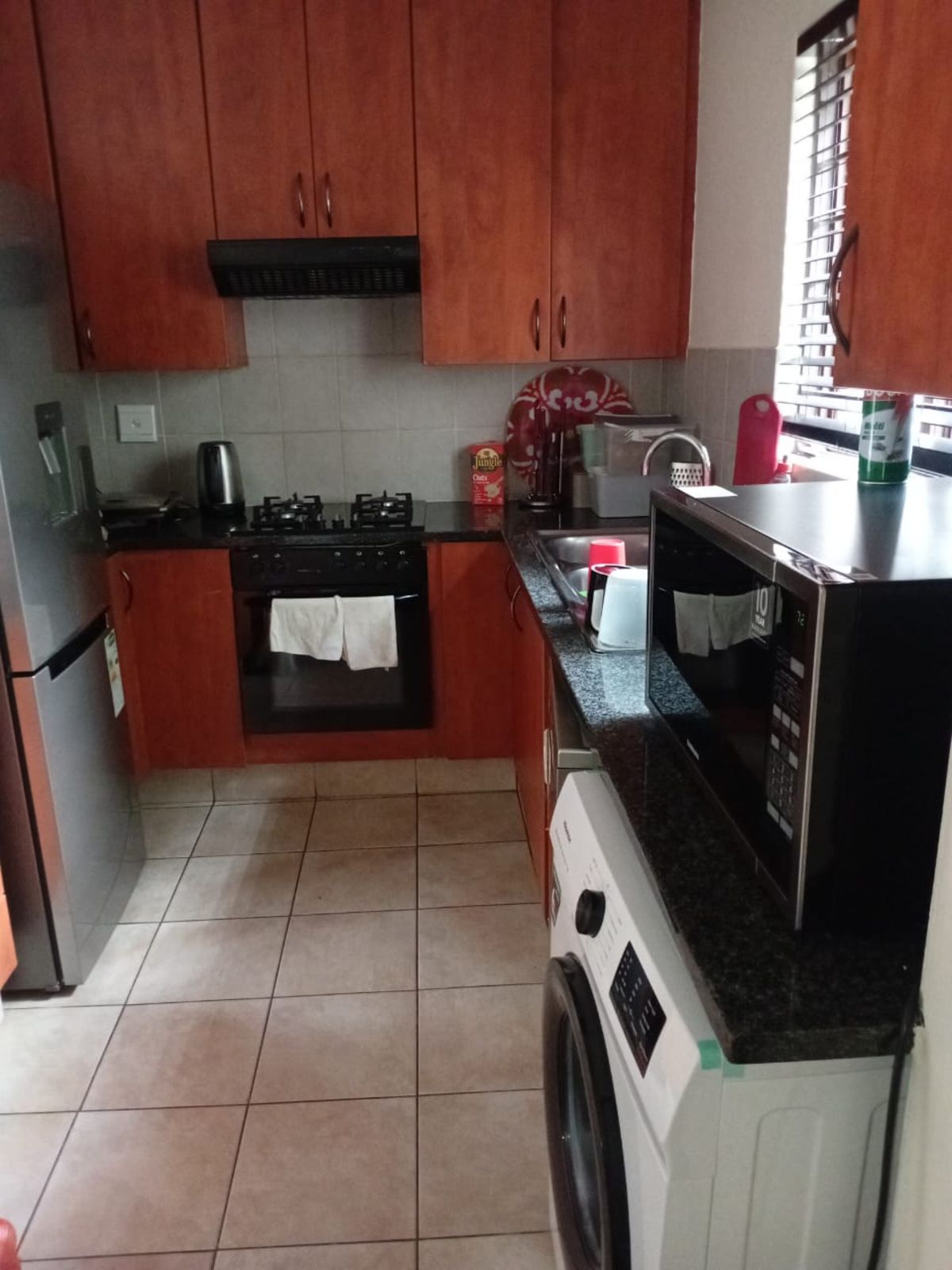 The cabinetry is a warm wood tone, giving the space a cozy and inviting feel. The countertops are dark granite, which complements the warm wood cabinets, a gas stove with an oven below it, and a range hood above. There’s also a washing machine integrated under the counter, right next to the microwave. The kitchen is well-equipped with essential appliances like a refrigerator, a kettle, and some basic kitchenware. Overall, it’s a practical and efficient space, perfect for cooking and daily use.