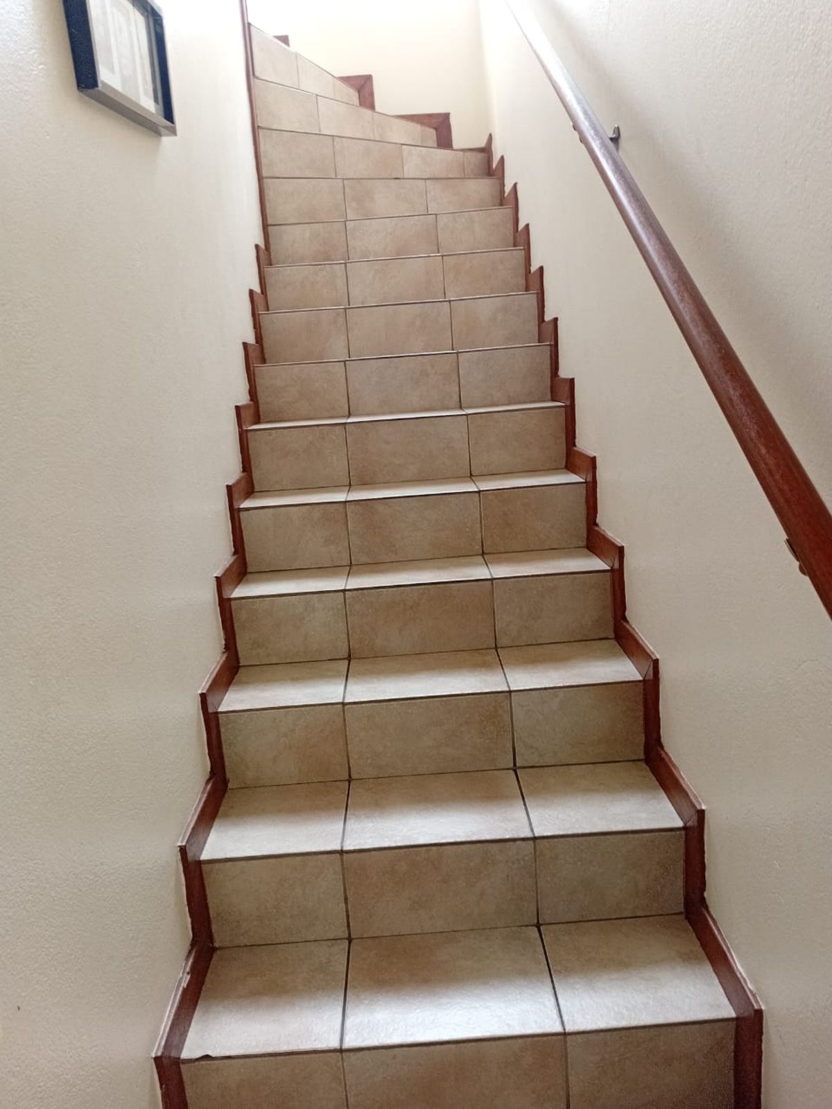 A stairway with warm-toned tiles that match the rest of the home. The wooden handrail and the natural light coming in from the window at the top of the stairs give the space