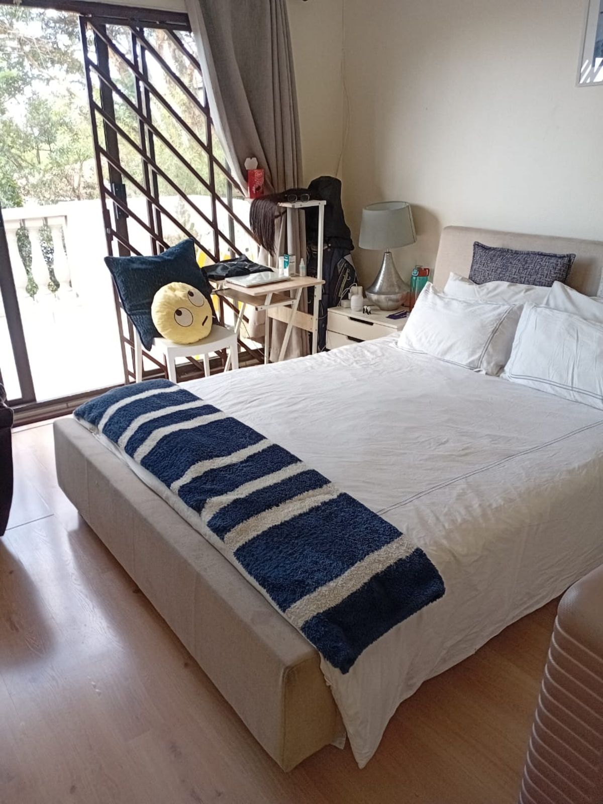 a bedroom with a light and airy feel. The bed has a simple, upholstered headboard and crisp white bedding, complemented by a navy blue and white striped throw blanket. There’s a chair near the window with a fun emoji pillow, and a small bedside table with a lamp. The room opens up to a balcony, allowing plenty of natural light and a lovely view of the outdoors. It’s a peaceful and comfortable space.