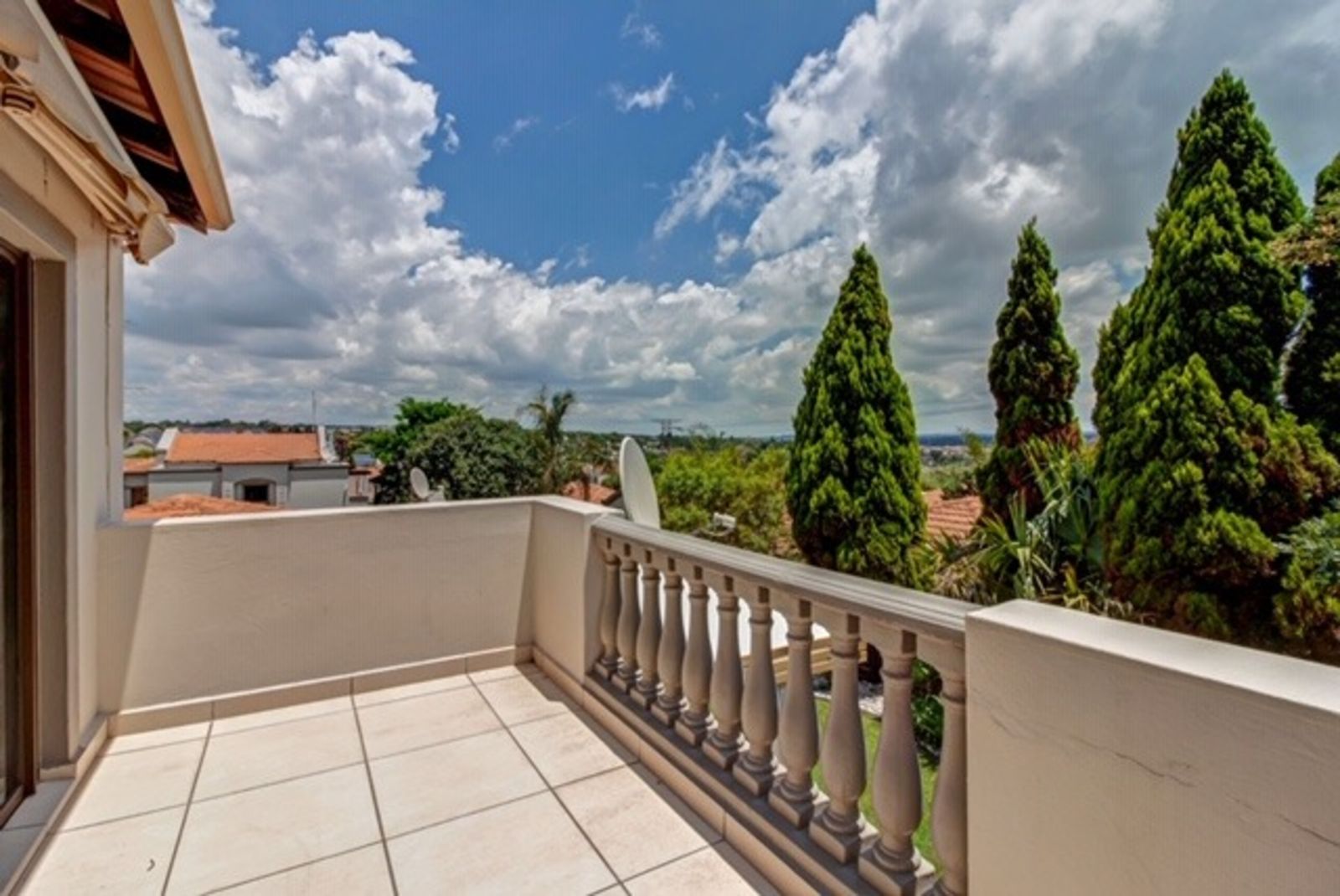 a charming balcony area. The balcony is adorned with a few potted plants, including succulents and small greenery, giving it a cozy and inviting vibe. The tiled floor and the classic balustrade railing add a touch of elegance. The background features a lovely sunset and some greenery, making it a perfect spot to relax