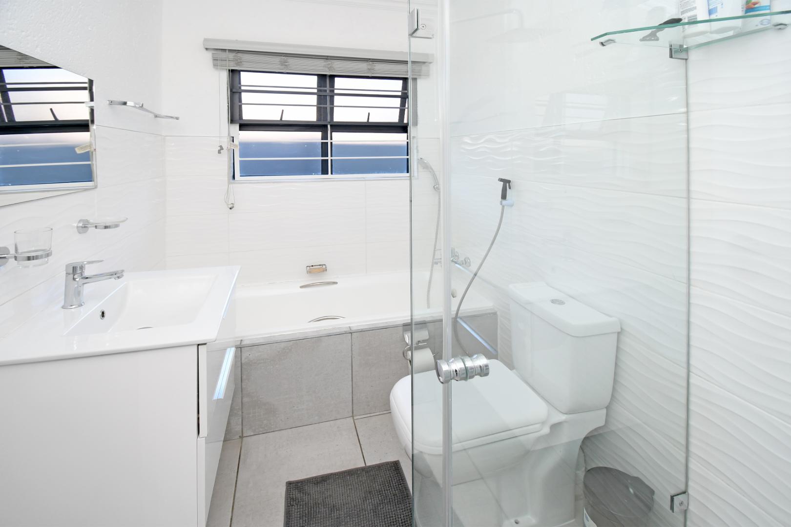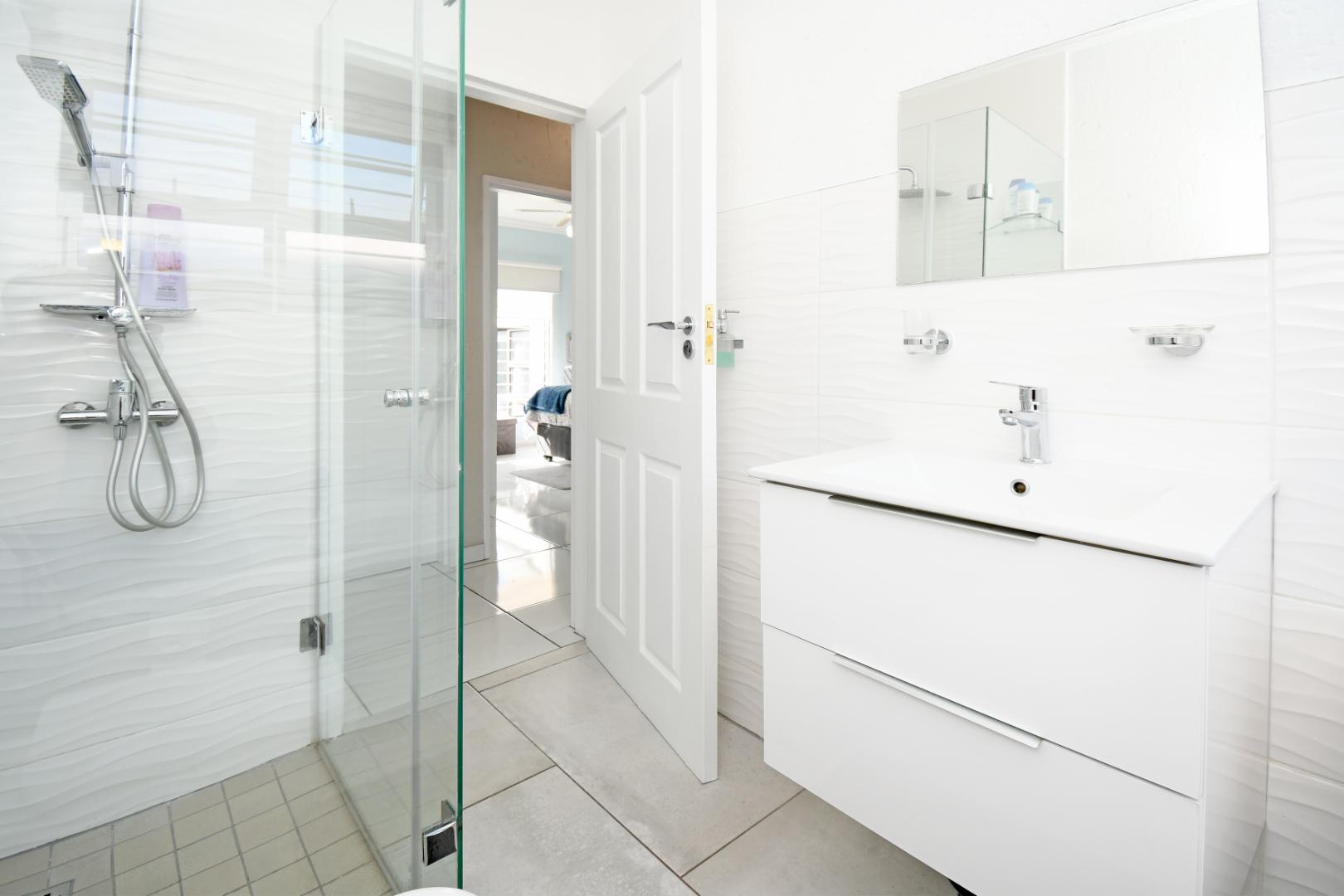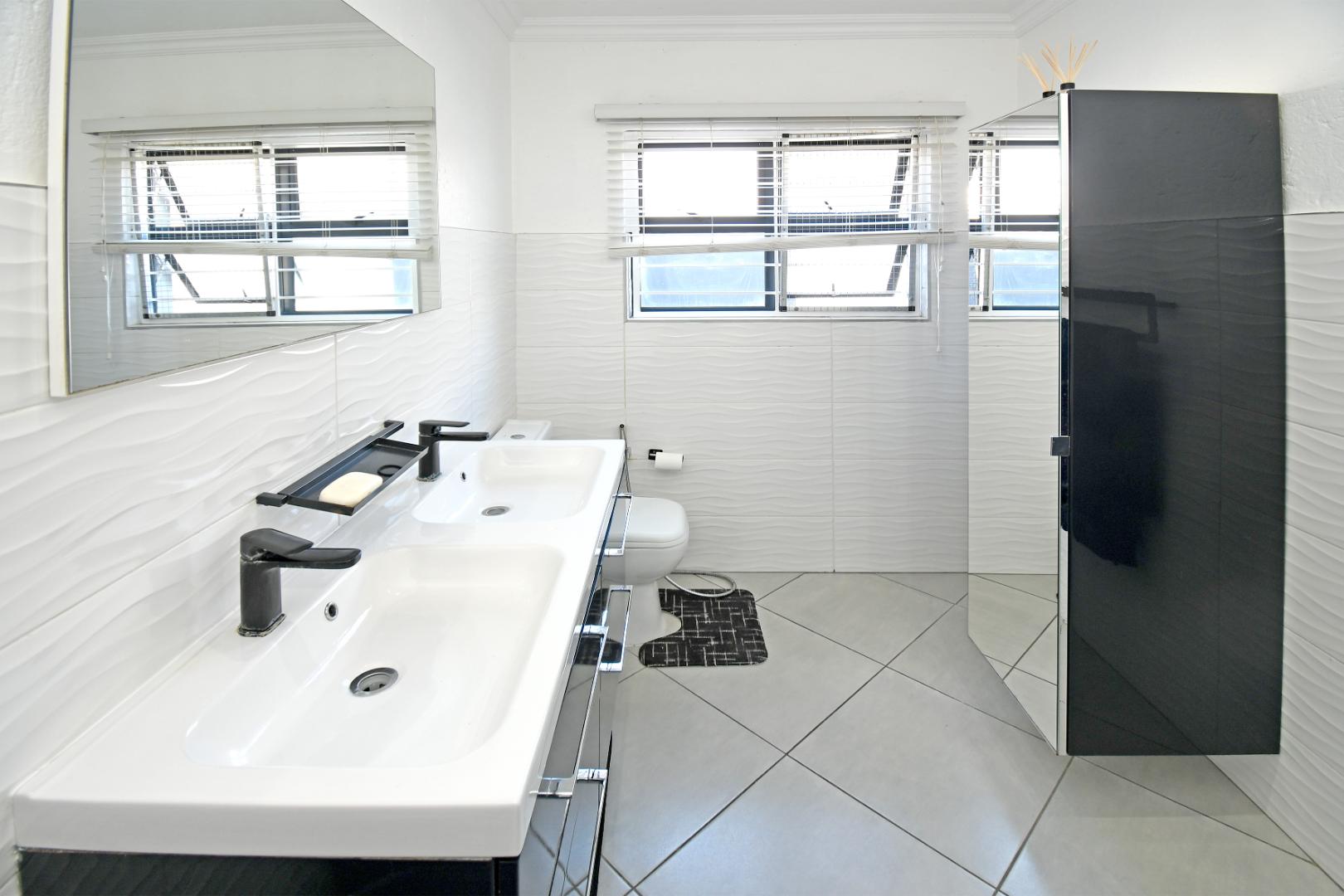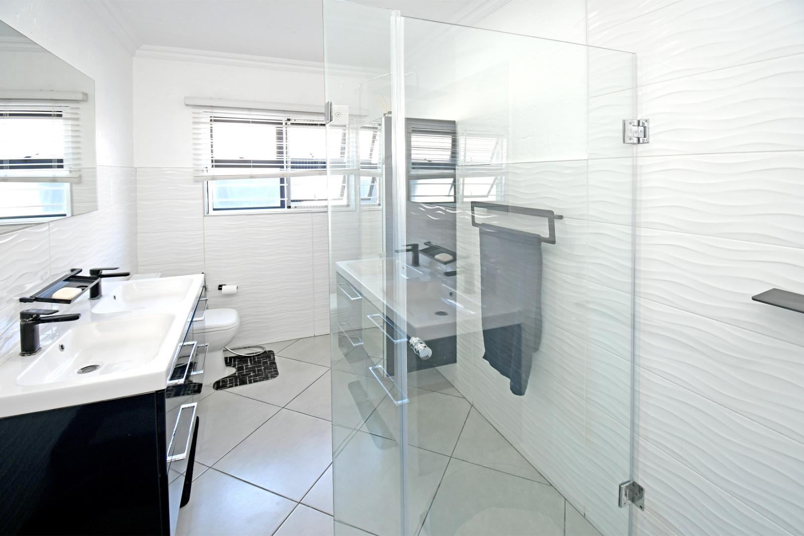 The home boasts three well-sized bedrooms, including a spacious main bedroom with a stylish en-suite bathroom featuring a large shower and double vanity. The second bathroom is equally modern, fitted with a shower and single vanity.