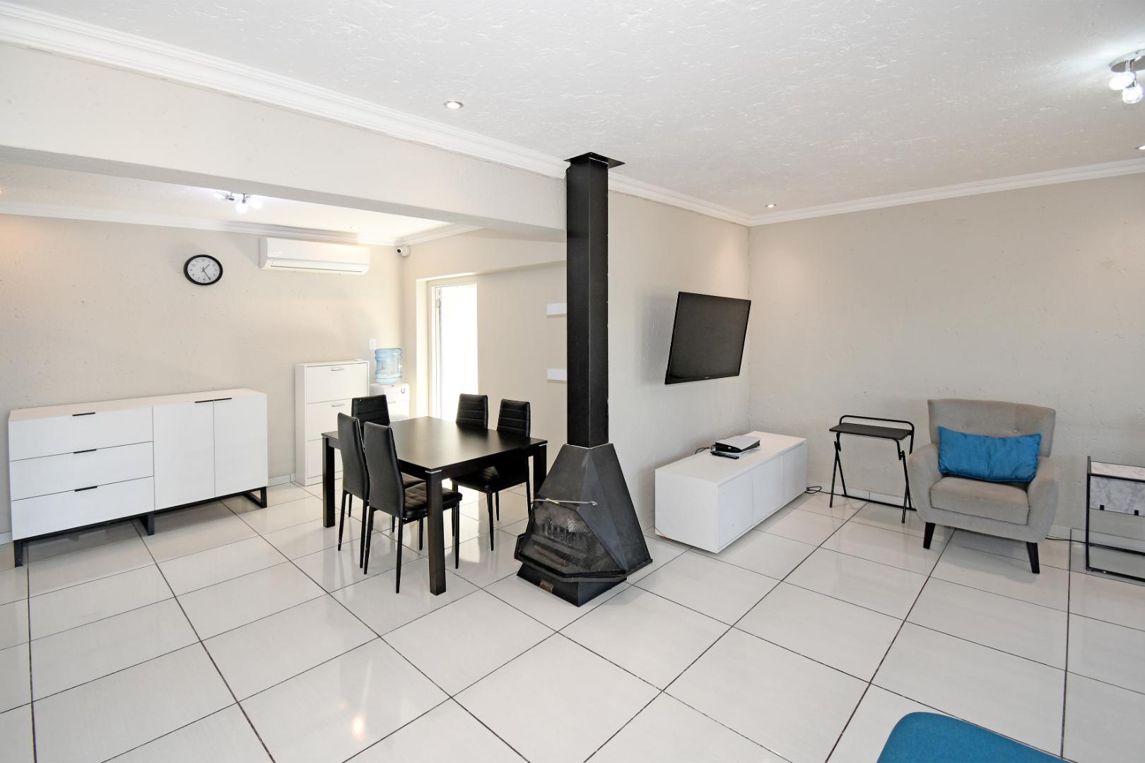 Step inside to a generous open-plan lounge and dining area, complete with a cozy wood-burning fireplace—perfect for chilly evenings. The well-appointed kitchen features sleek granite countertops, modern cabinetry, ample workspace, and room for a double-door fridge.
