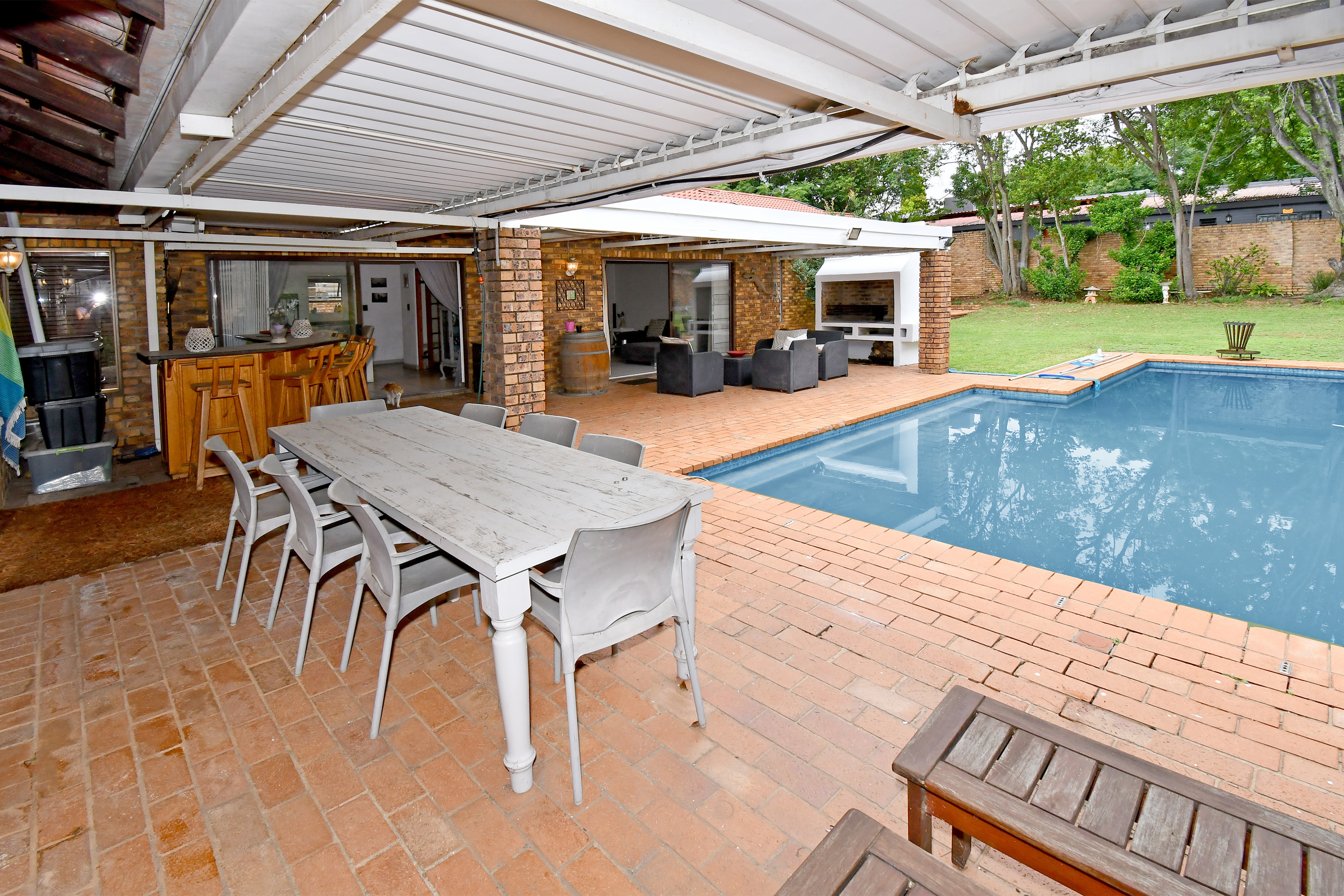 Outdoor living is a highlight, with a large, leafy garden, sparkling pool, and an entertainment bar area ideal for hosting.