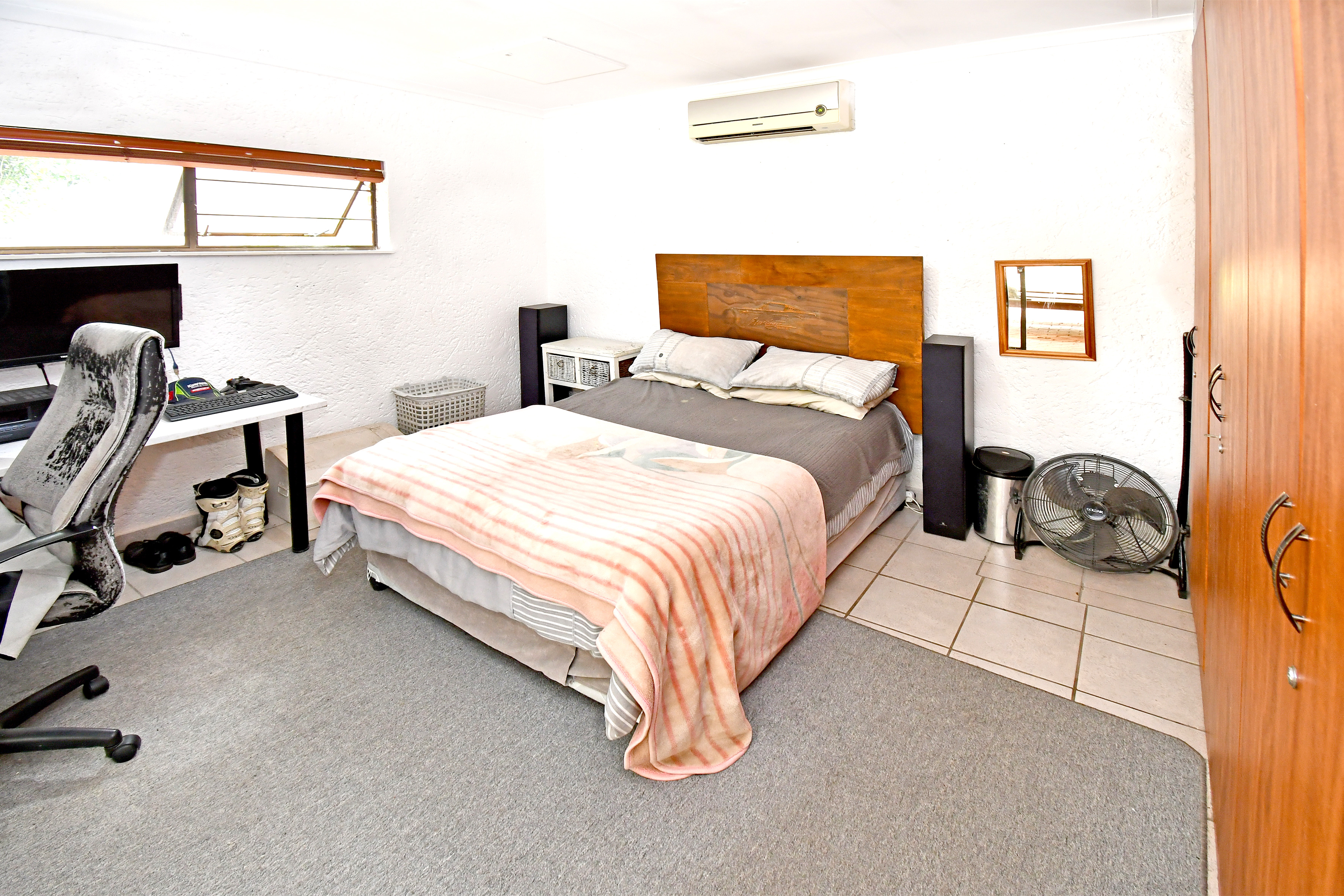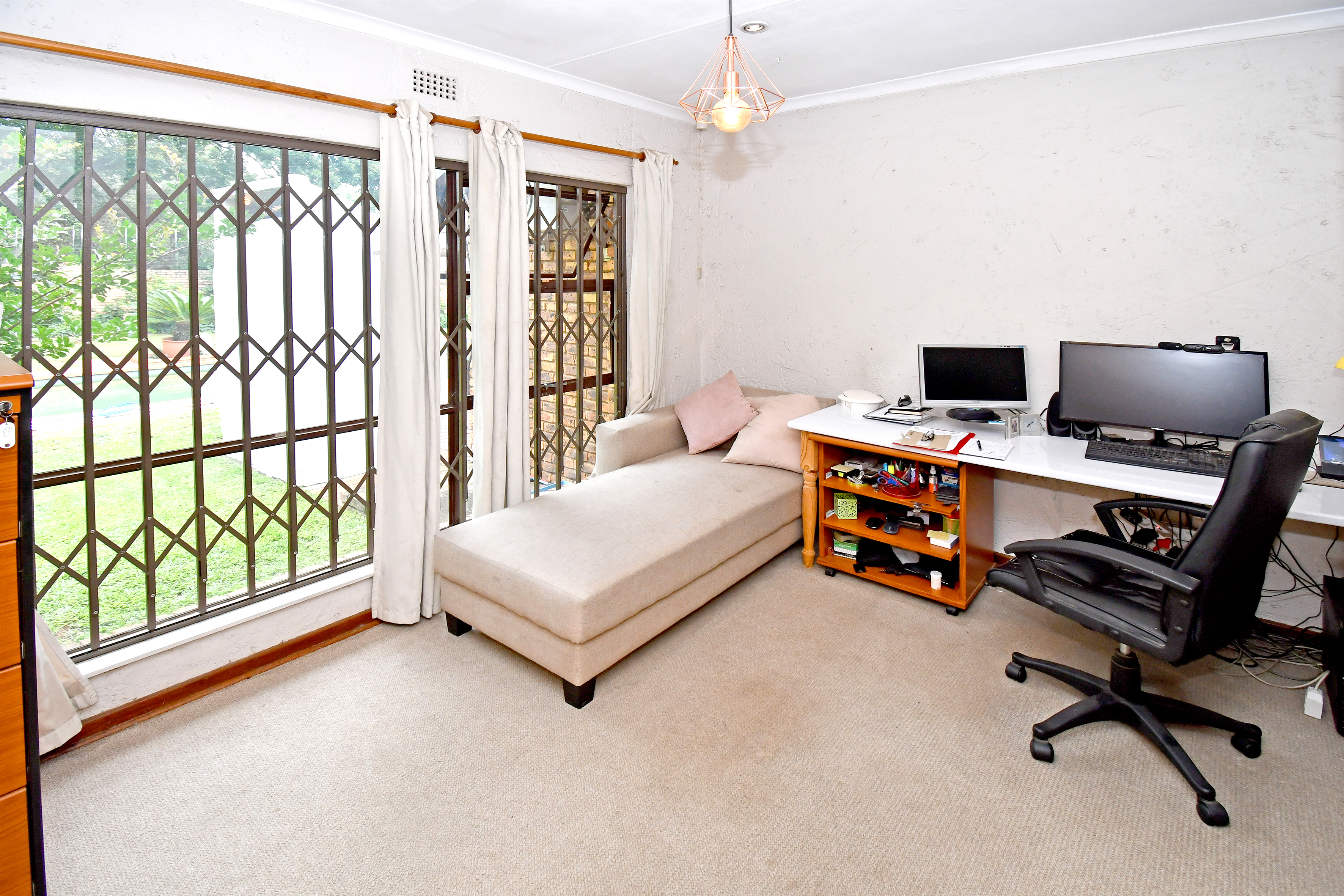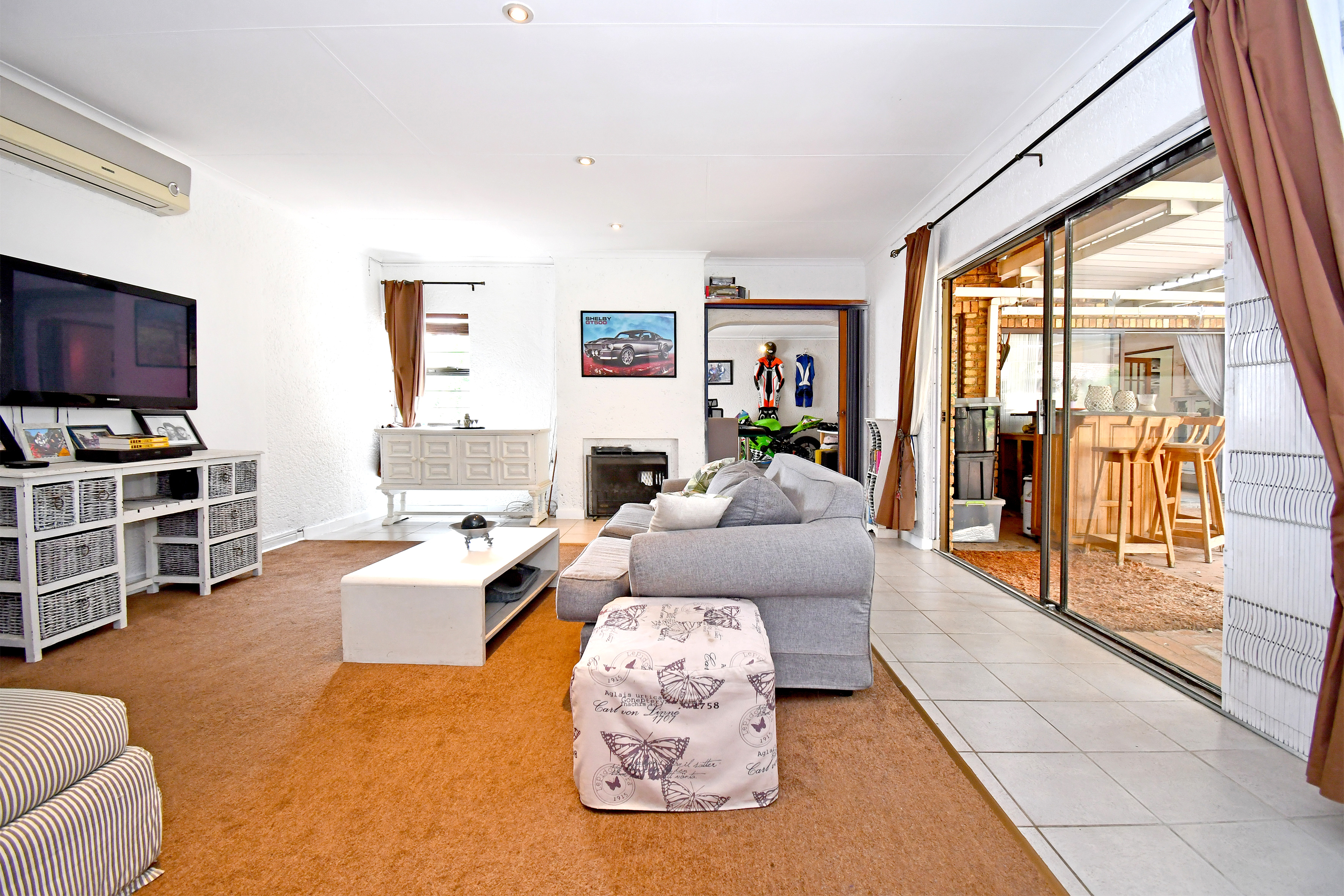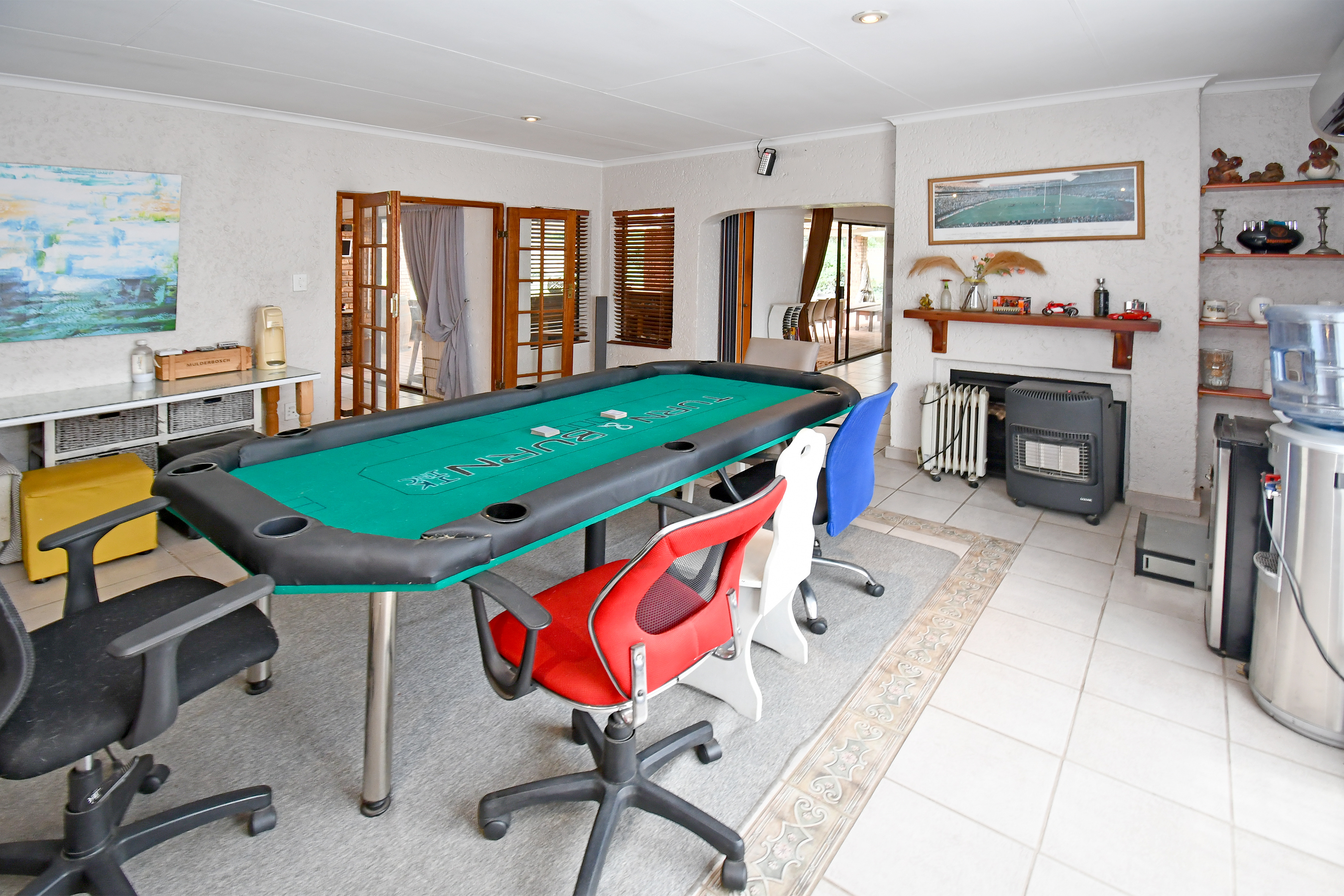 Living spaces are generous and inviting. The large lounge, complete with a gas fireplace, flows seamlessly out to the patio, as does the elegant dining room—perfect for effortless entertaining. A huge family/games room features air-conditioning and a double-sided fireplace, providing a cosy retreat for any season. An additional sizeable room leading to the patio presents exciting flatlet potential or an ideal work-from-home space.