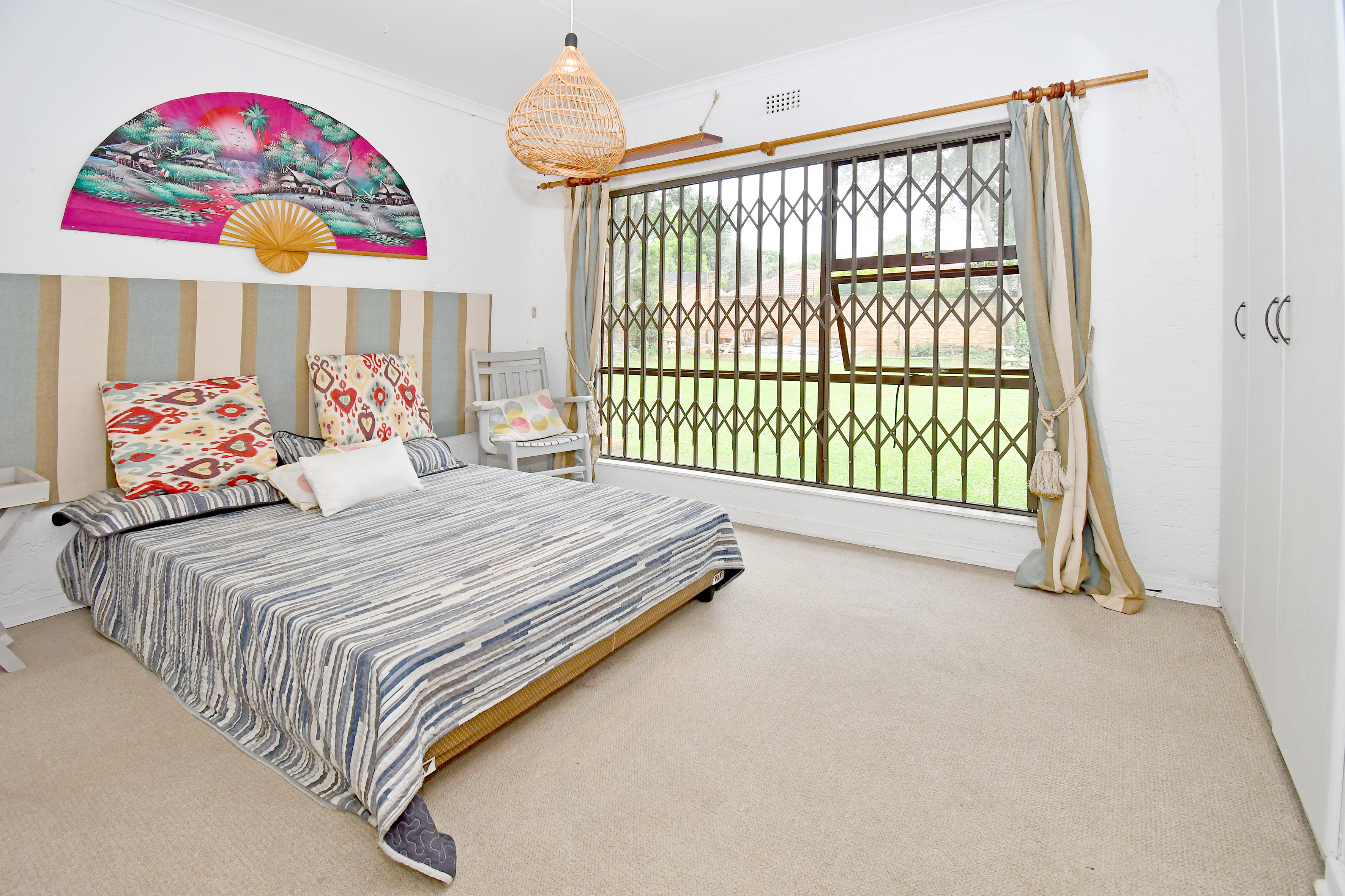The well-appointed kitchen boasts granite countertops, a gas hob, and a sizeable scullery with ample space for all appliances.