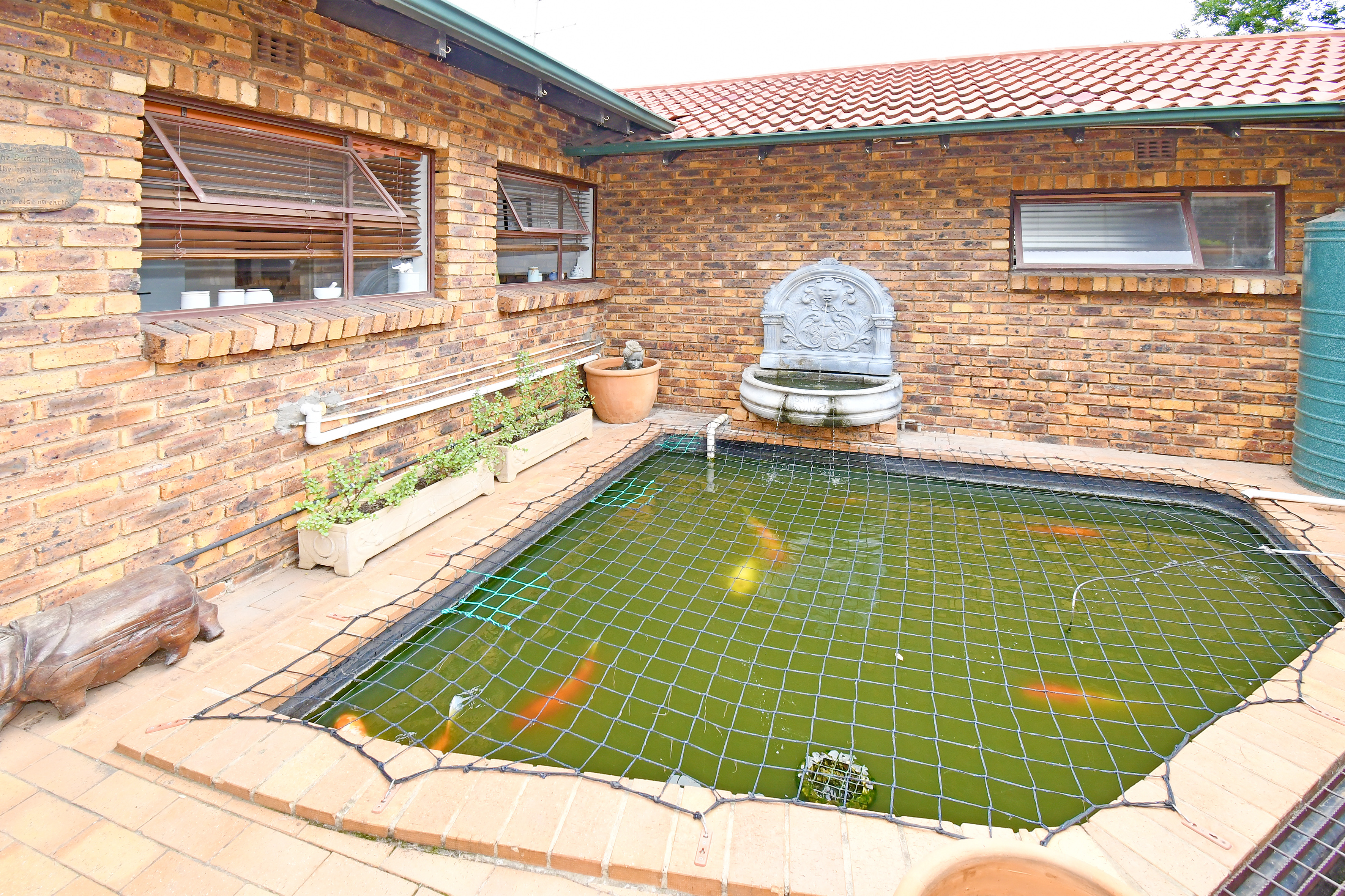 A tranquil koi pond with impressive, mature koi completes the garden’s serene ambience.
