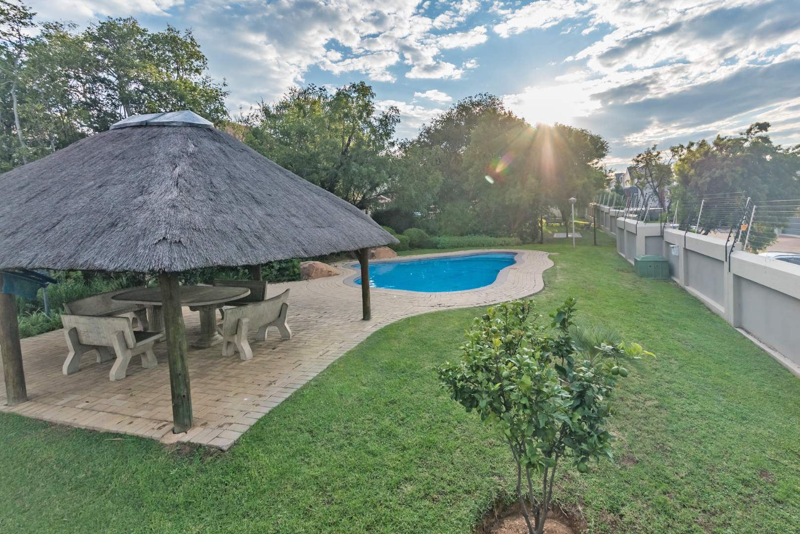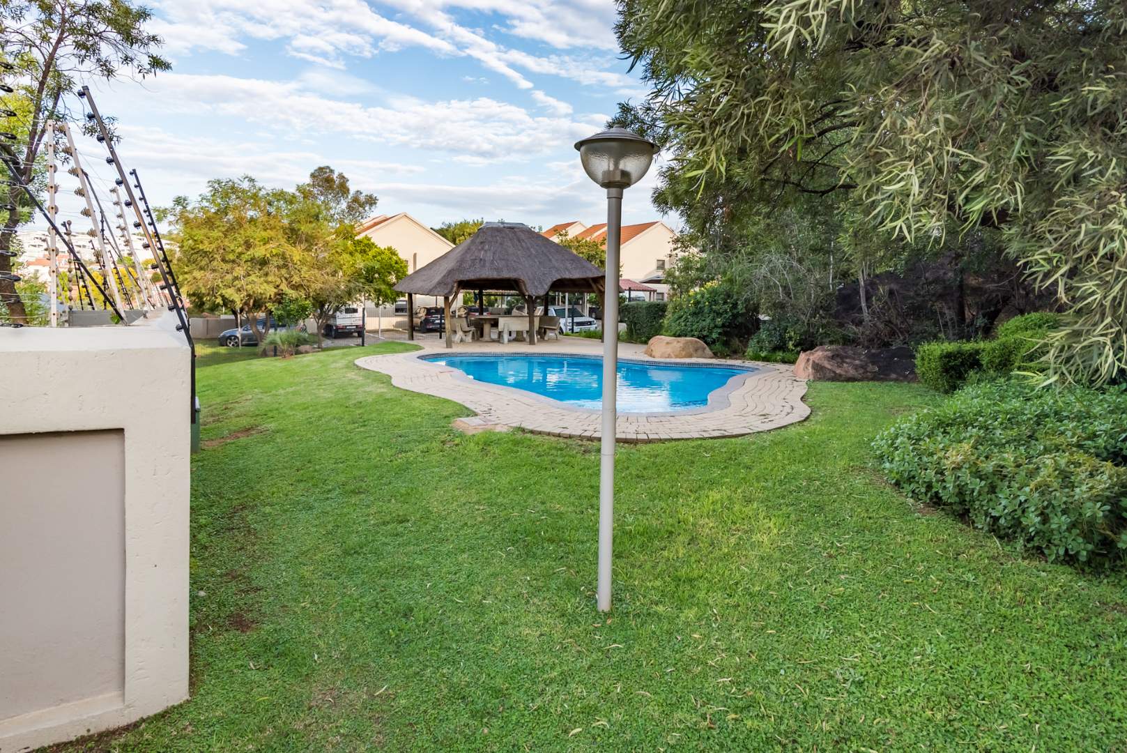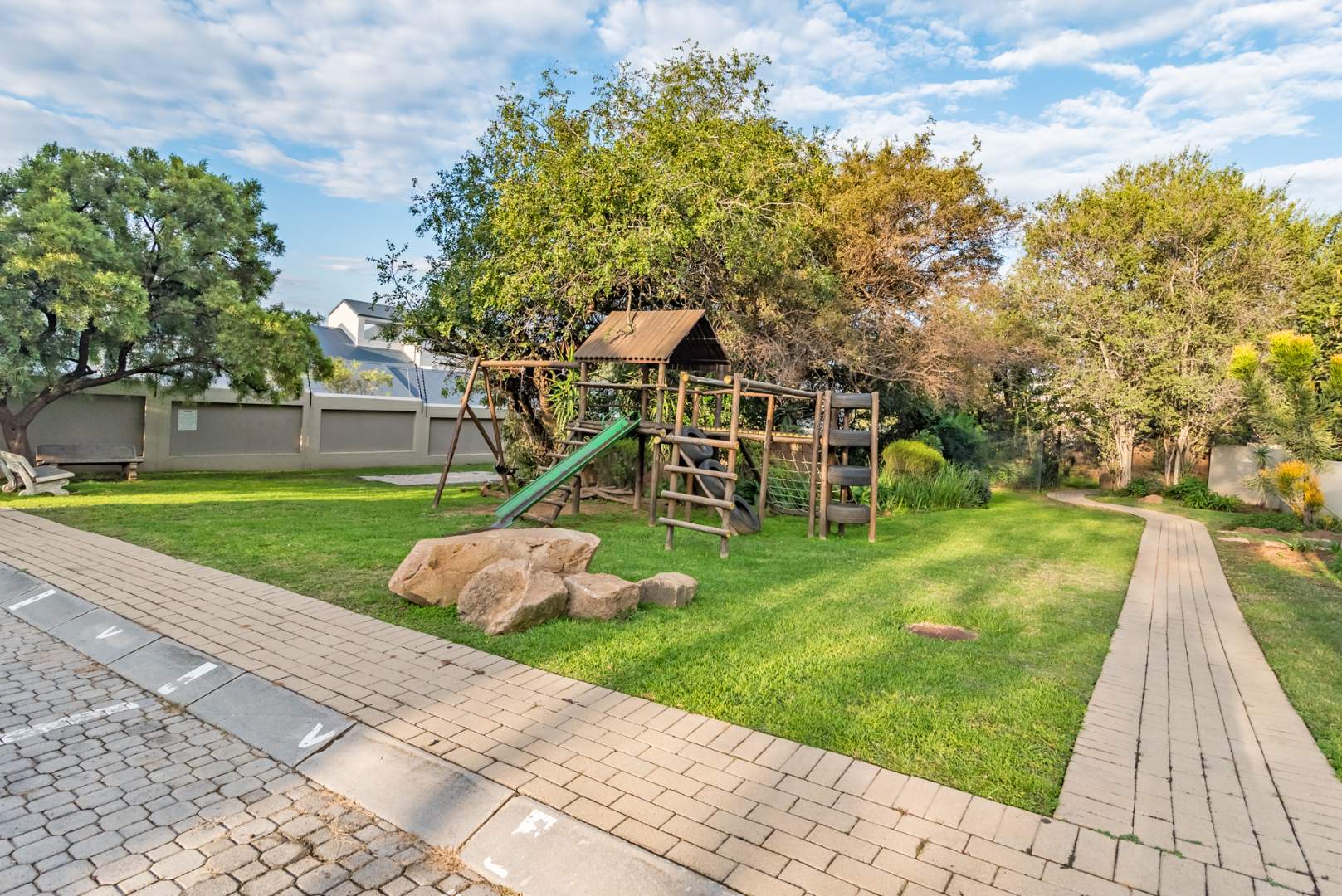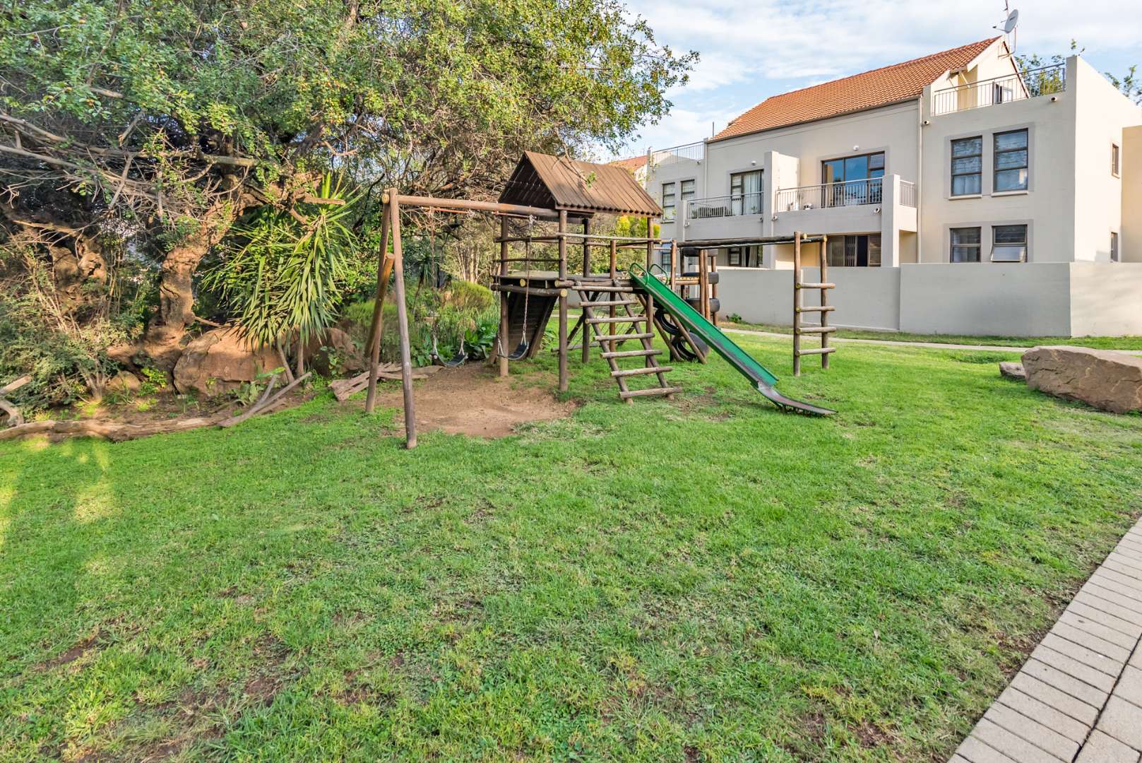 Secure complex with communal pool and kids' play park with jungle gym