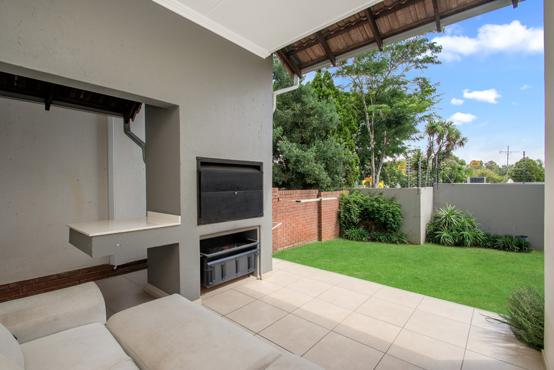 Built-in braai on the covered and tiled patio flowing through to the garden