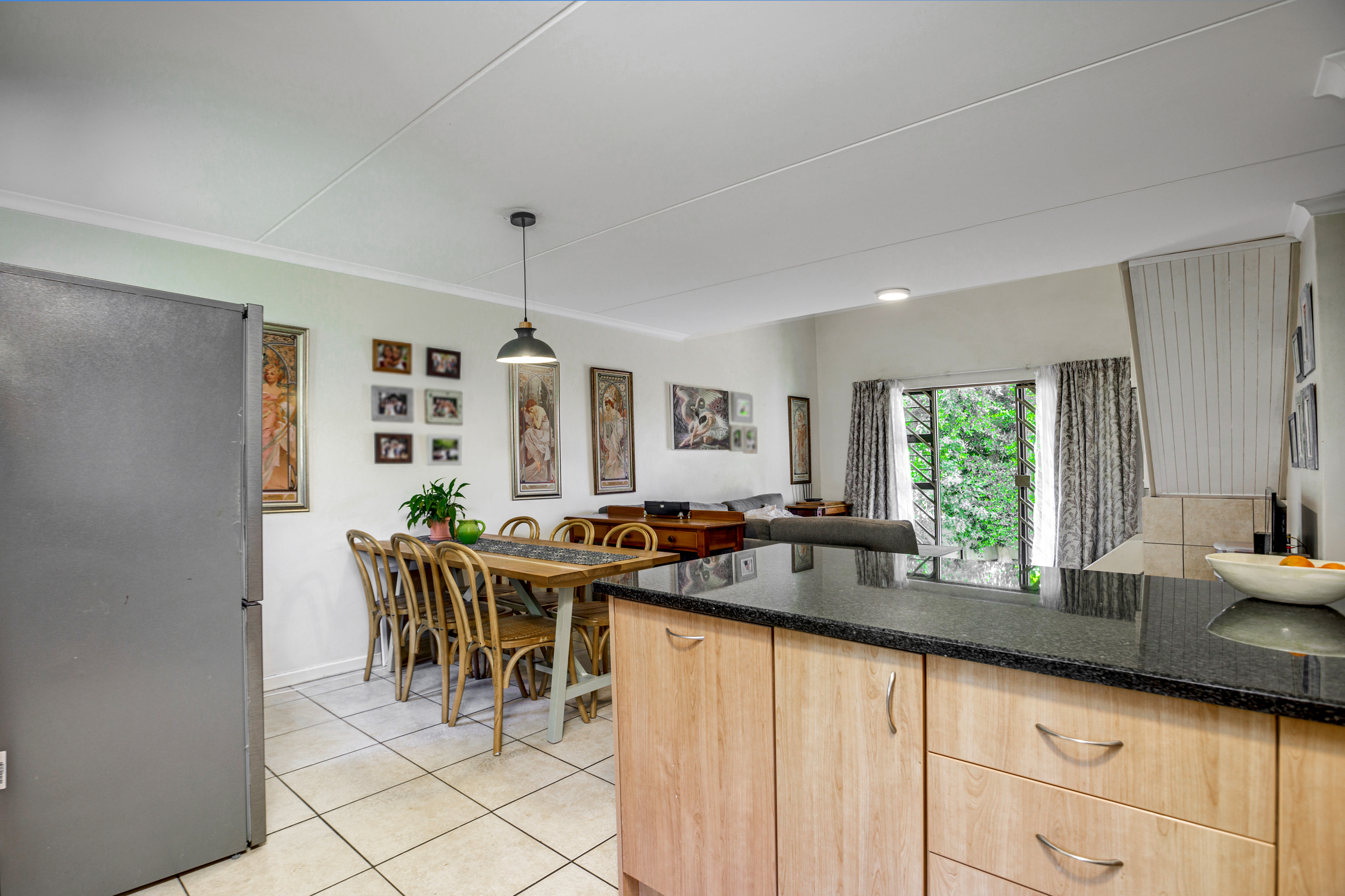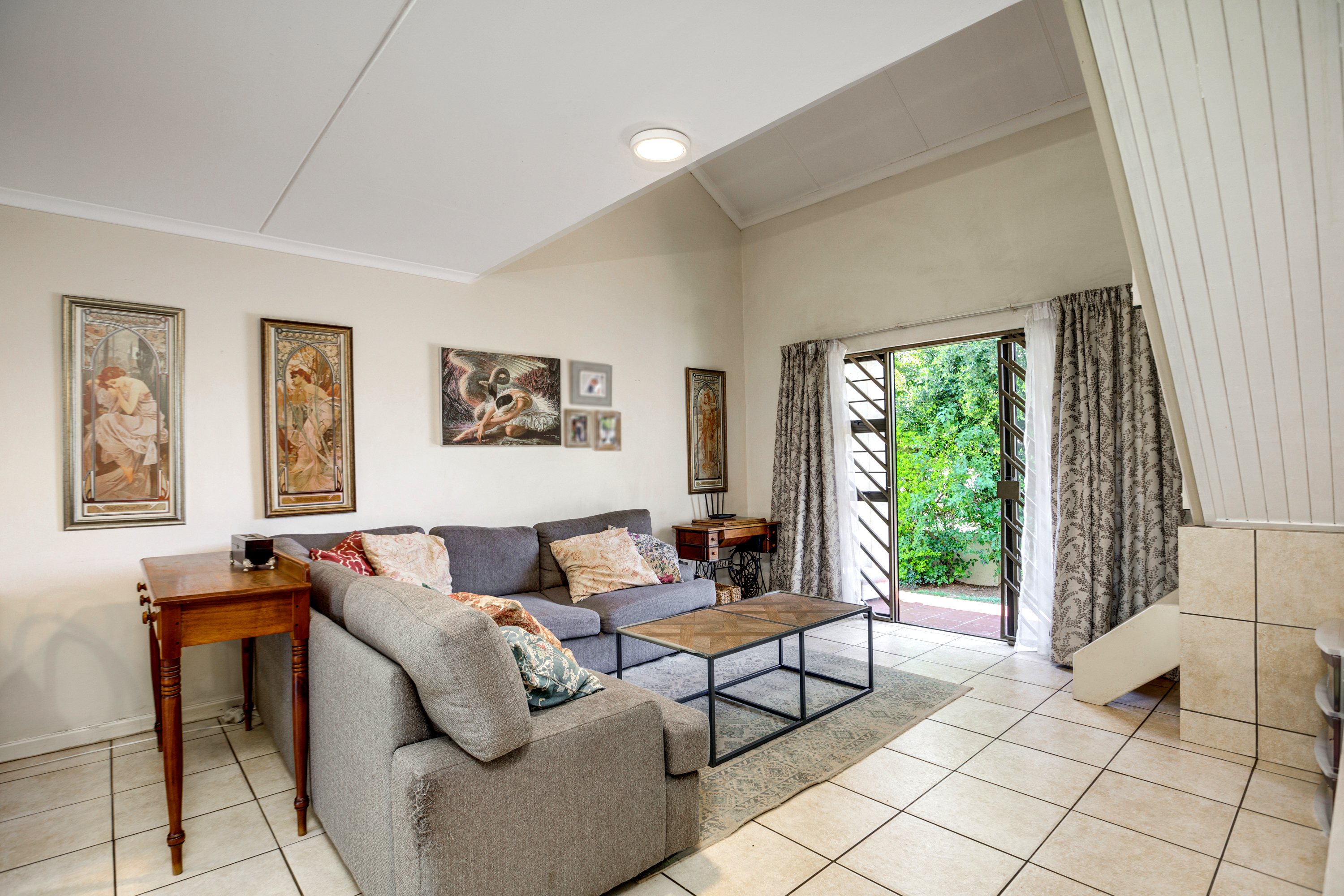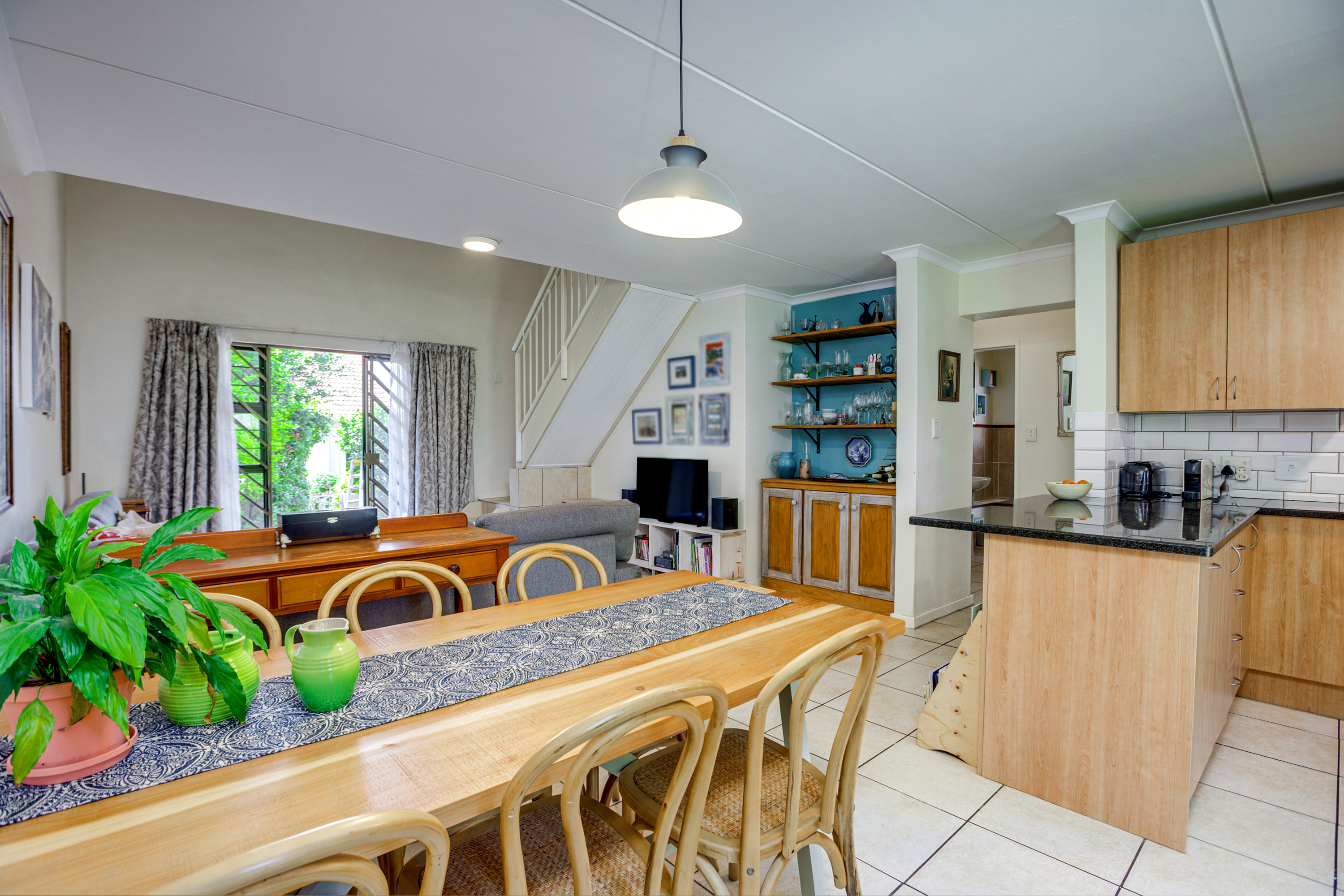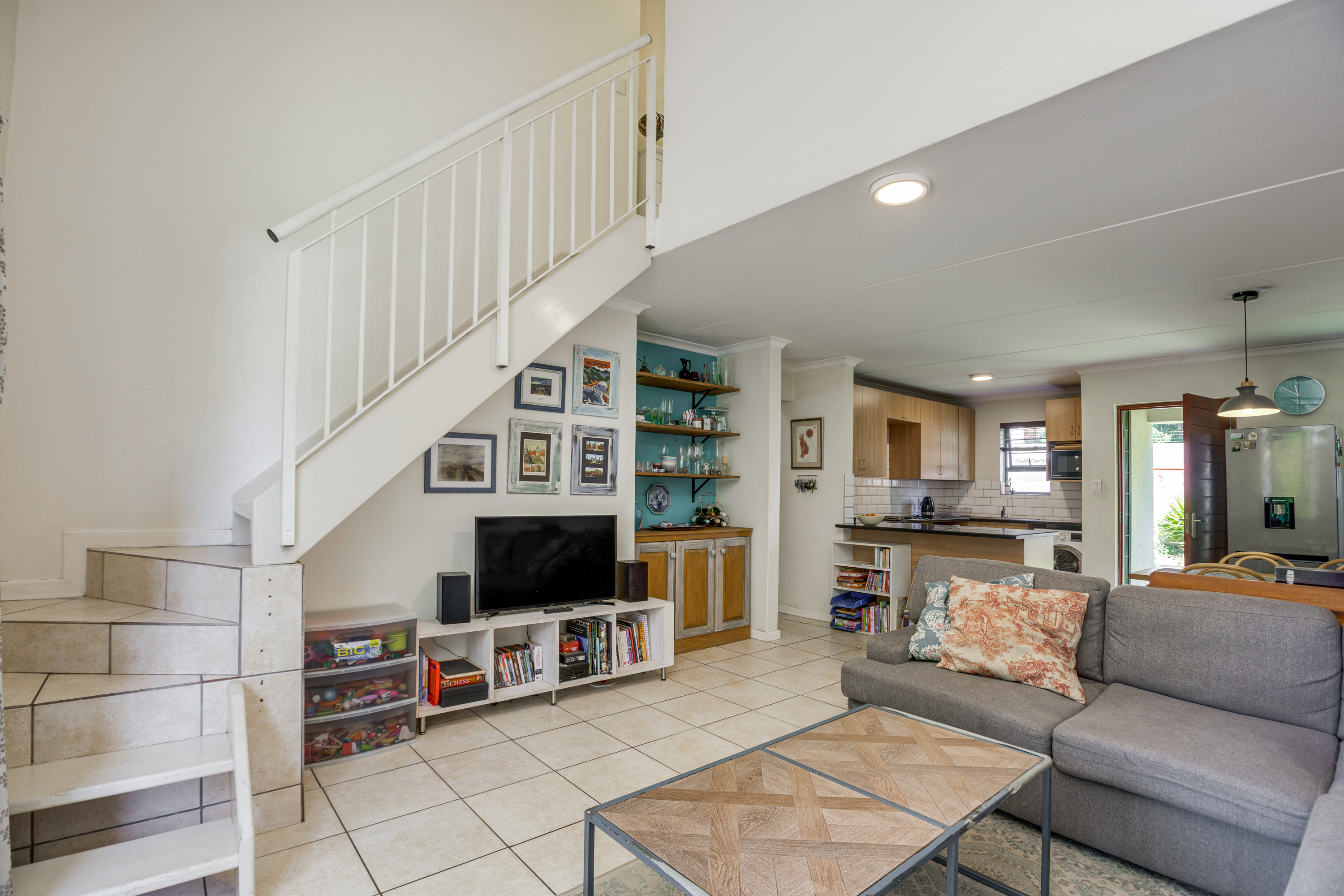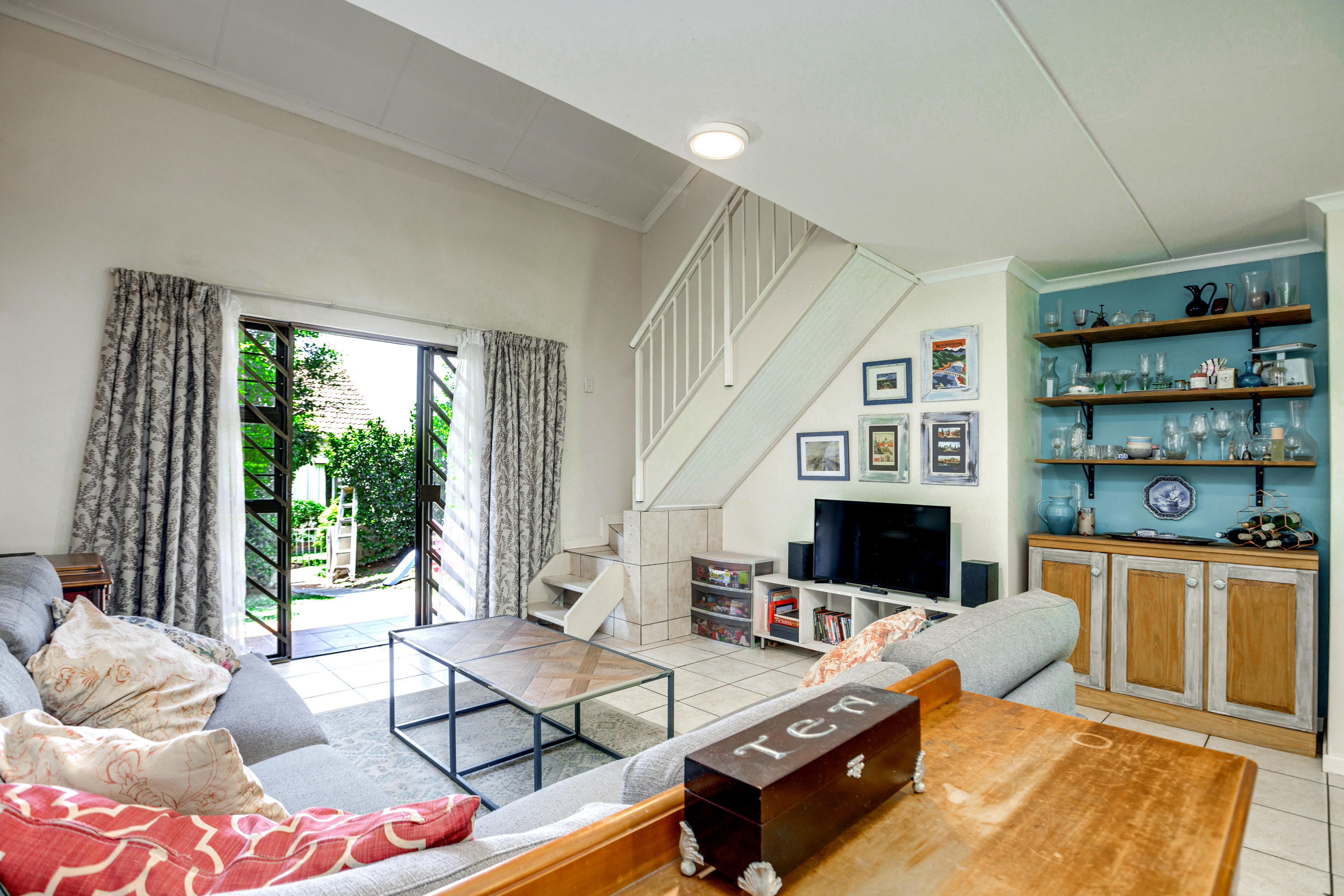 The lounge opens up onto a covered patio, creating a natural flow between indoor and outdoor living. It’s the perfect spot for relaxing with a cup of coffee, enjoying weekend braais, or watching the kids play in the garden.