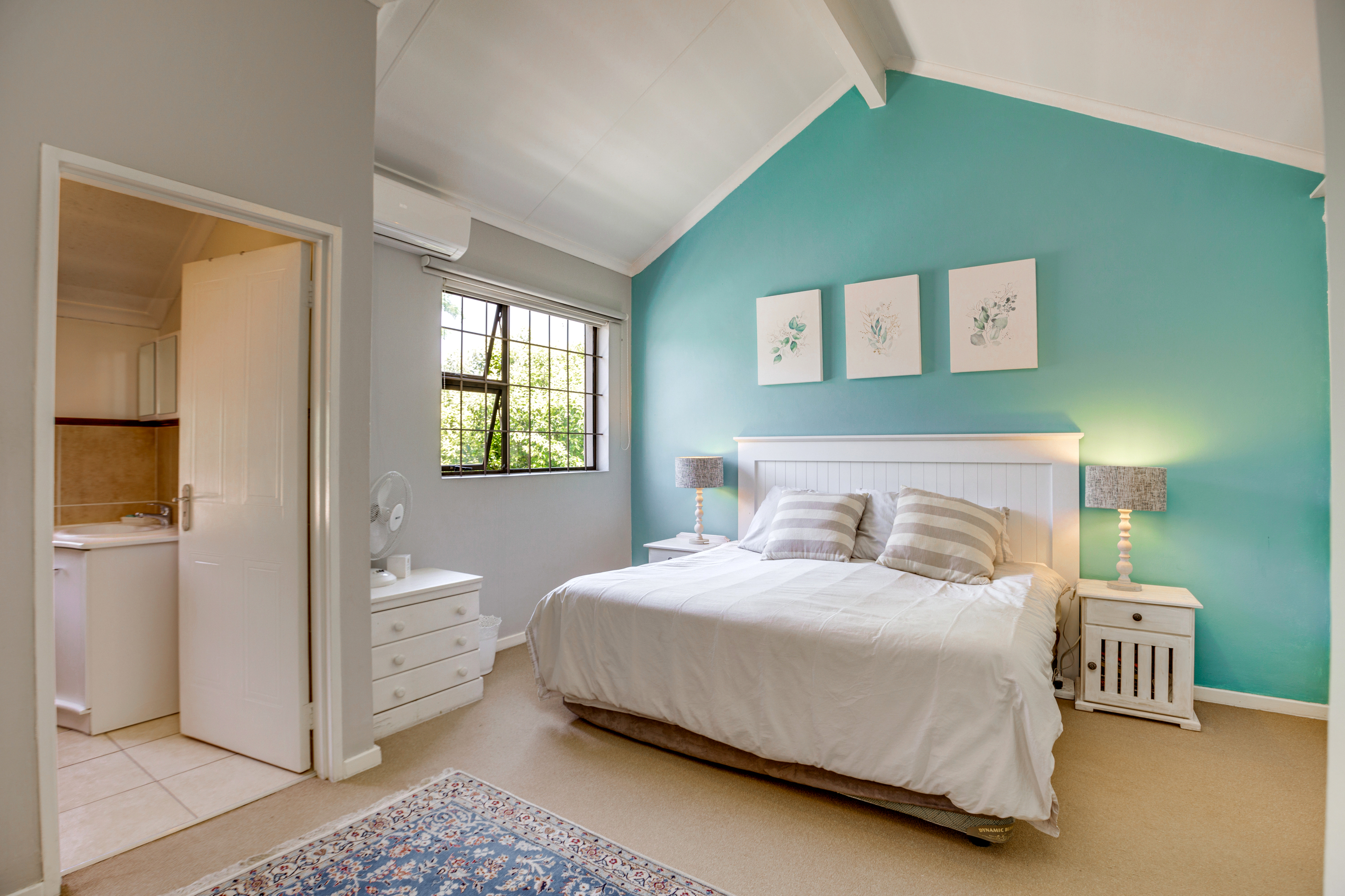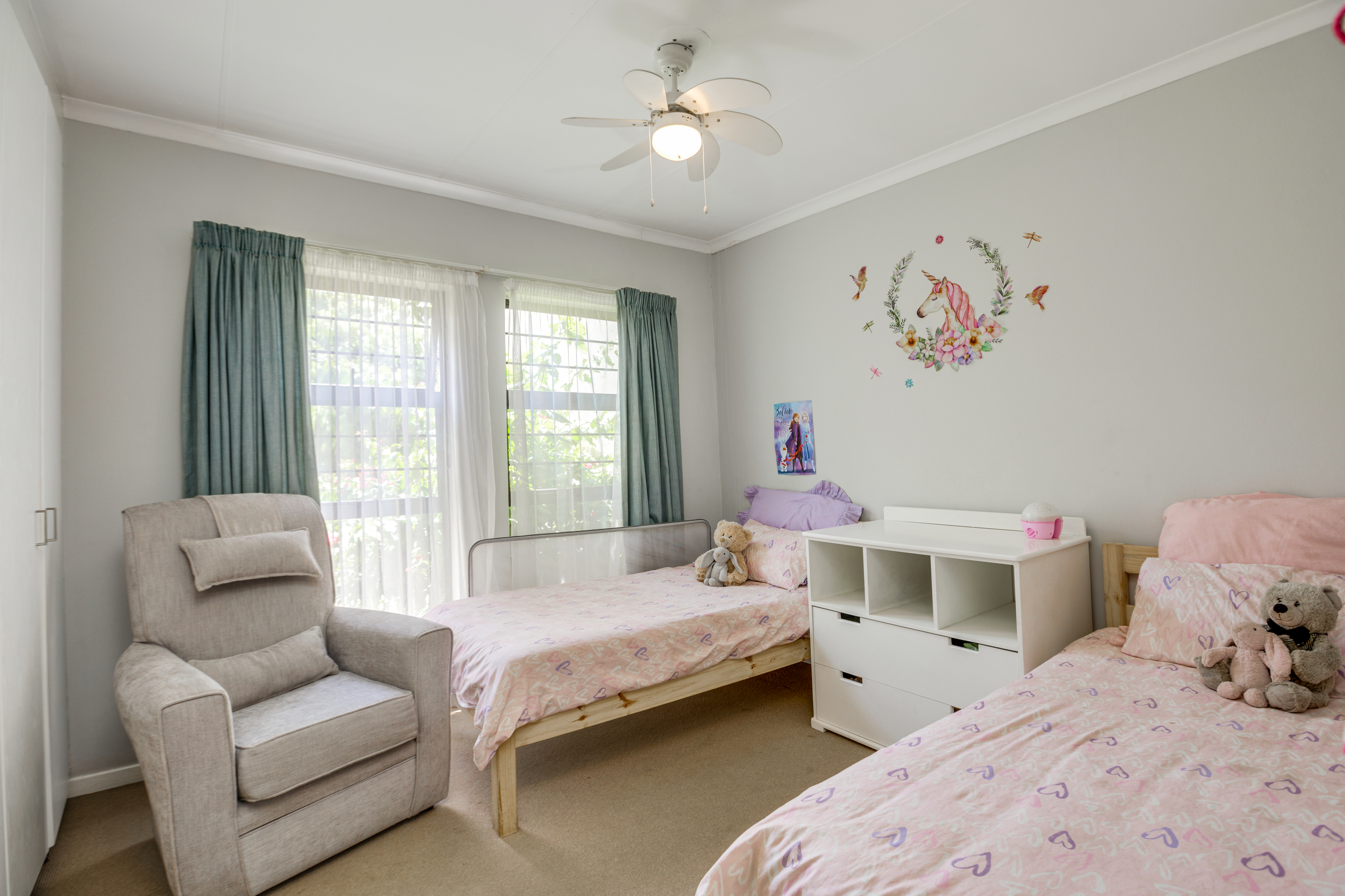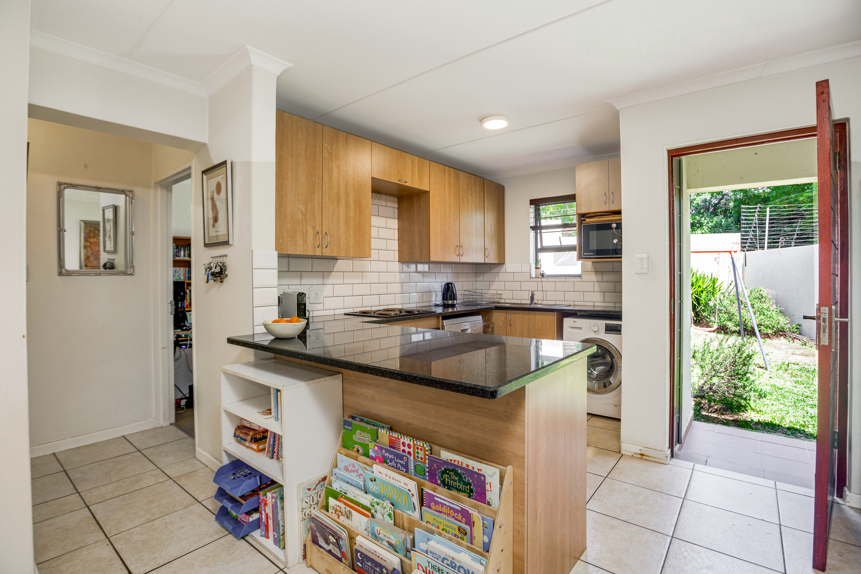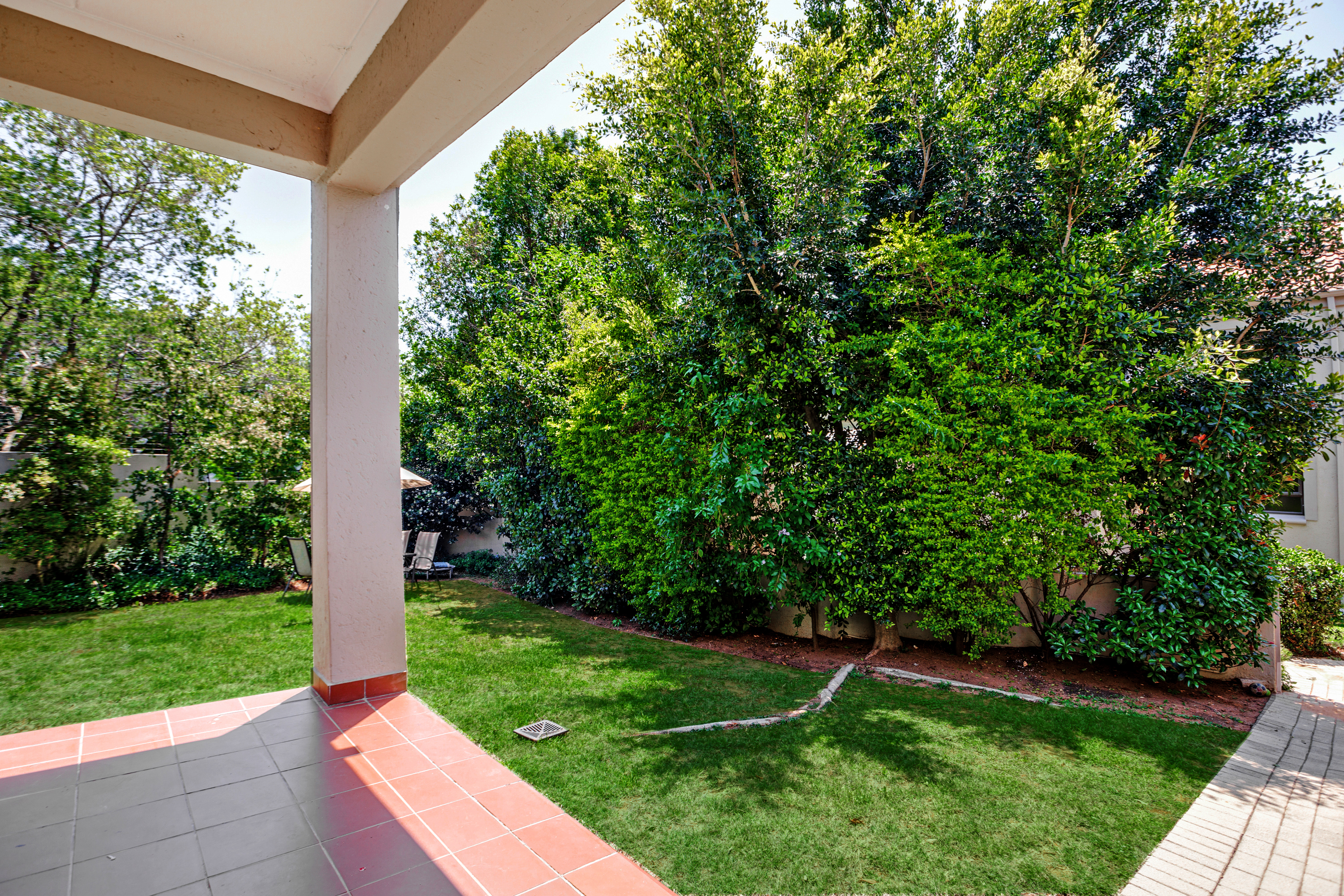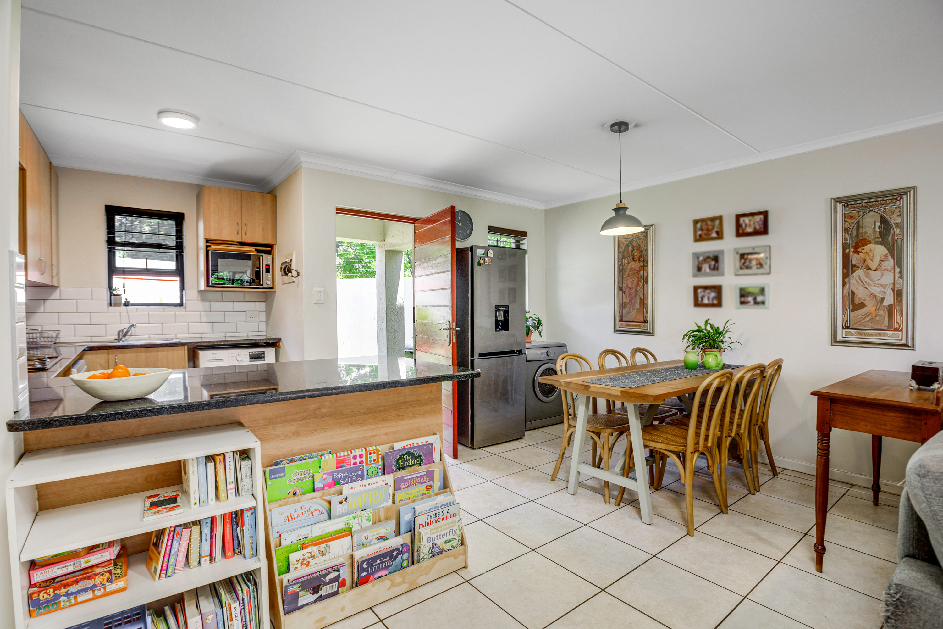 The lounge opens up onto a covered patio, creating a natural flow between indoor and outdoor living. It’s the perfect spot for relaxing with a cup of coffee, enjoying weekend braais, or watching the kids play in the garden.