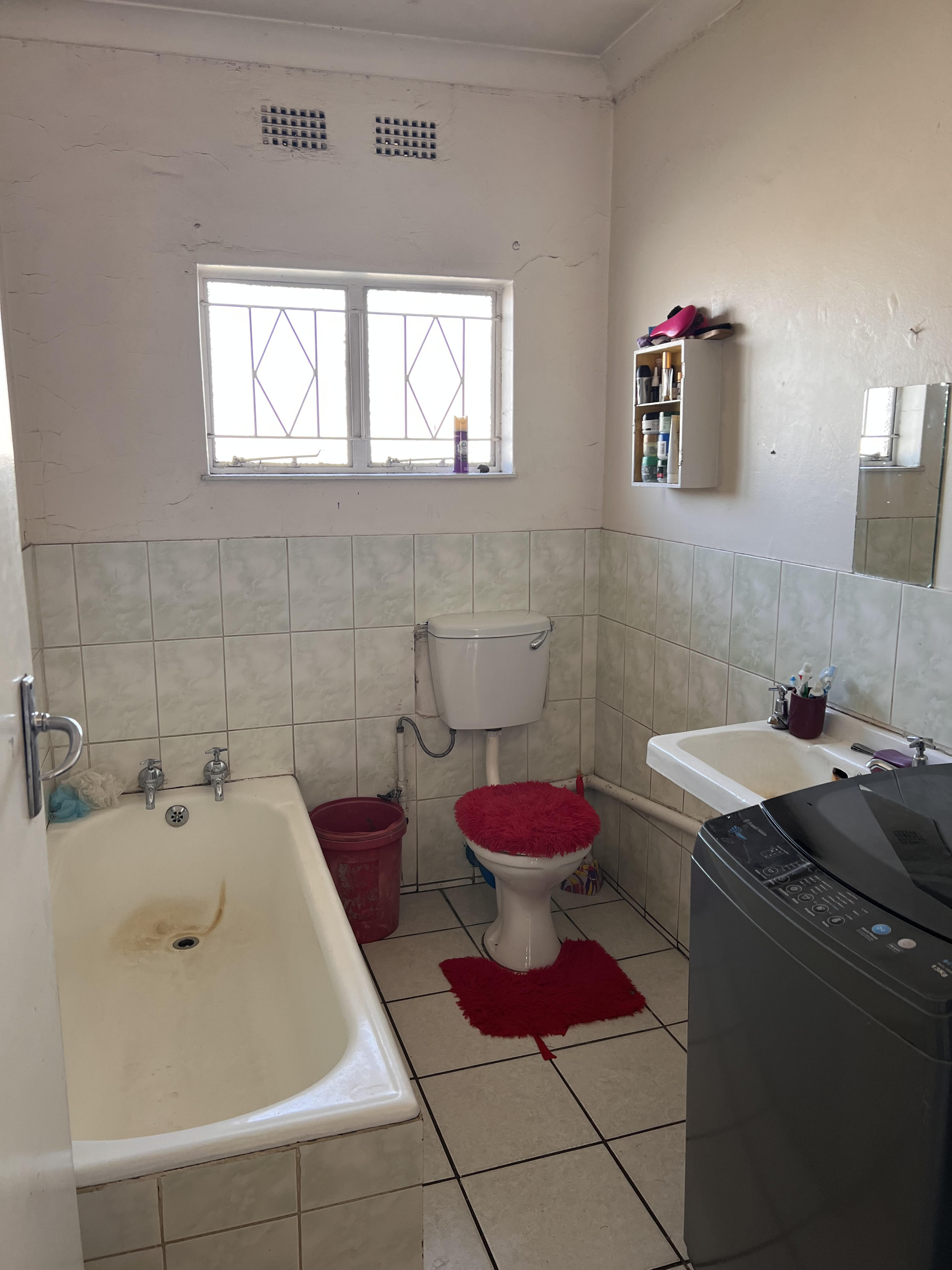 Neat bathroom with bath, basin, toilet, and space for a washing machine