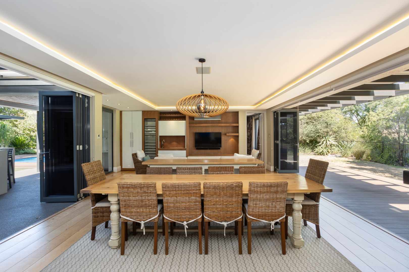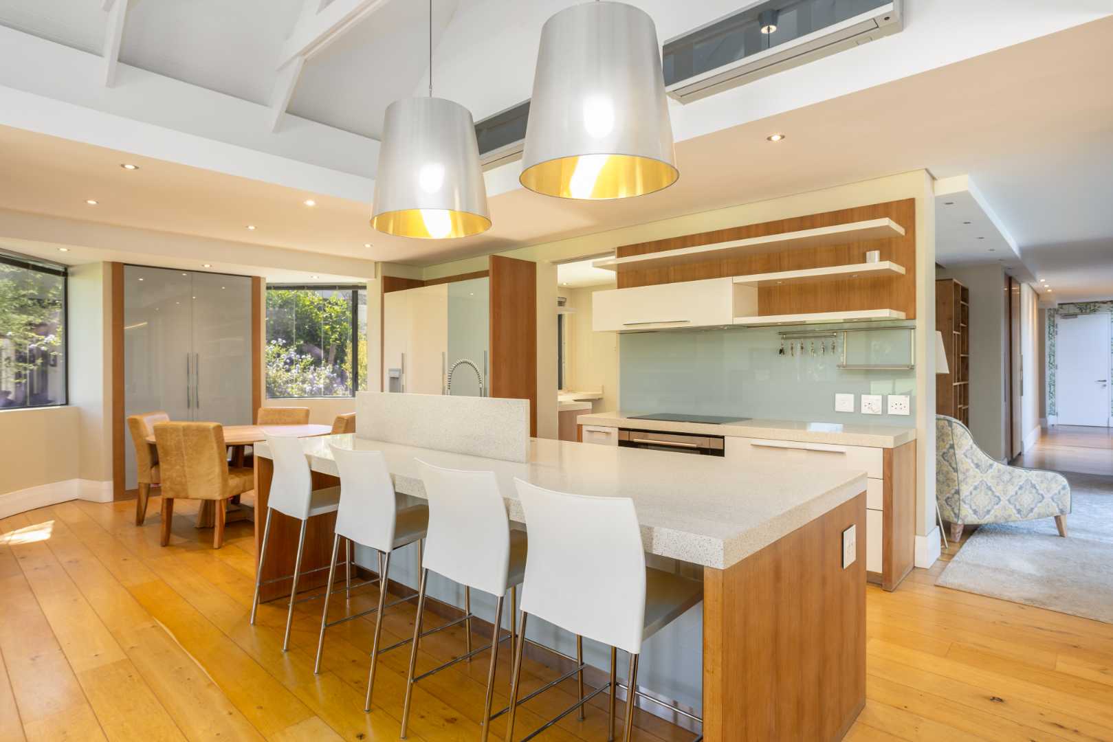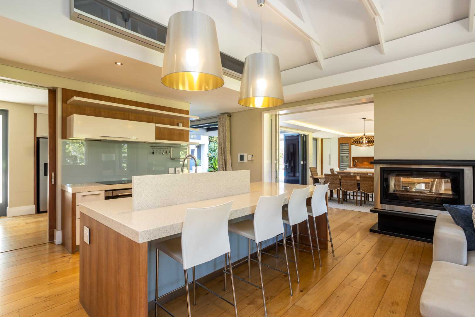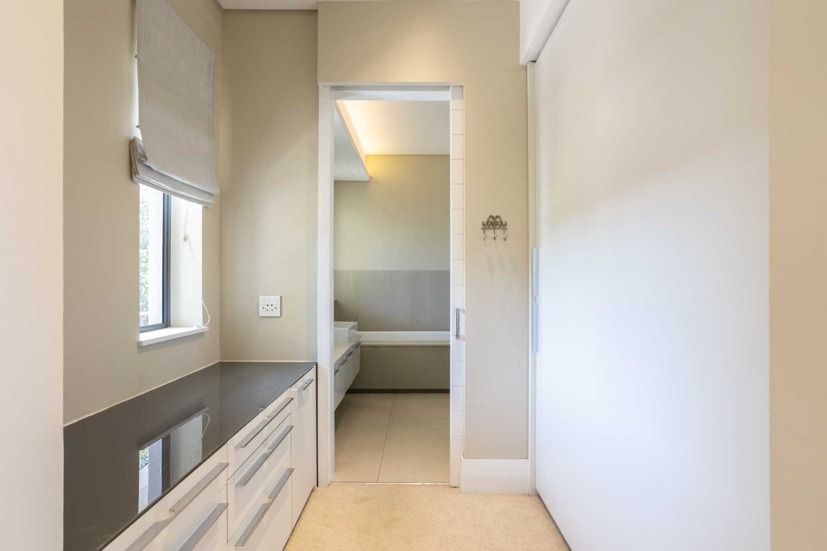 The spacious kitchen is thoughtfully designed for modern family living. It flows into a relaxed breakfast nook, a formal dining area and an outdoor braai patio, creating an inviting space for hosting and everyday moments alike. A separate scullery enhances the practicality of the space, offering ample storage and premium integrated appliances.
