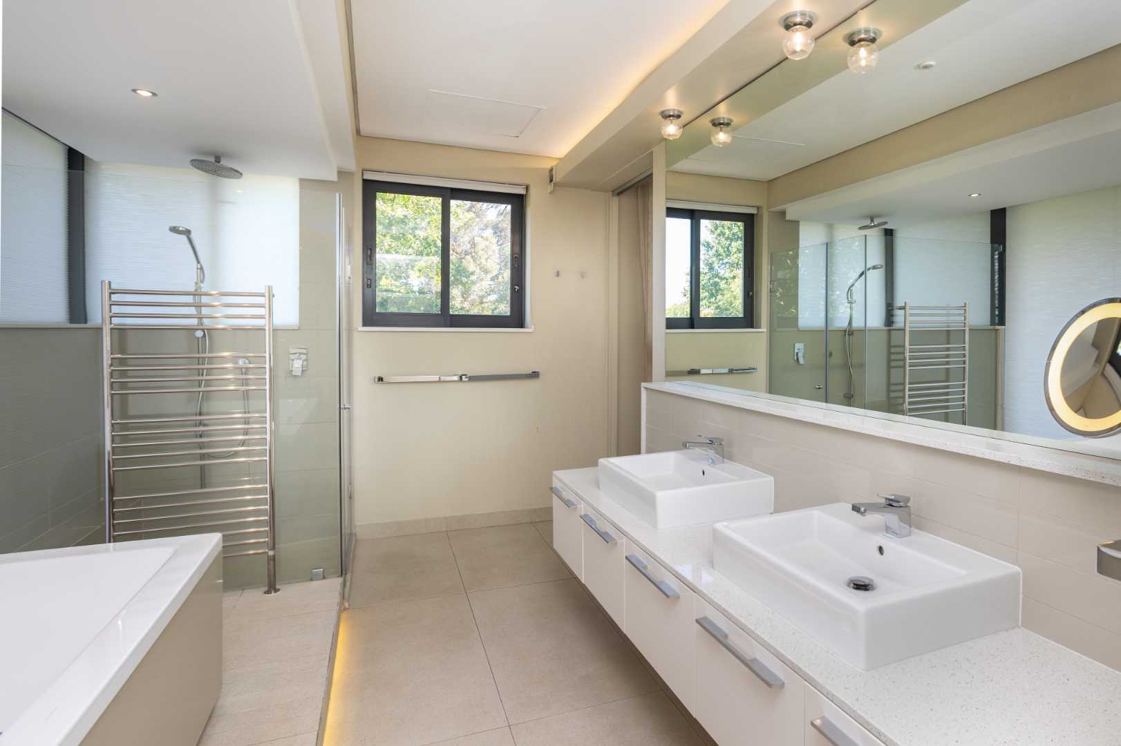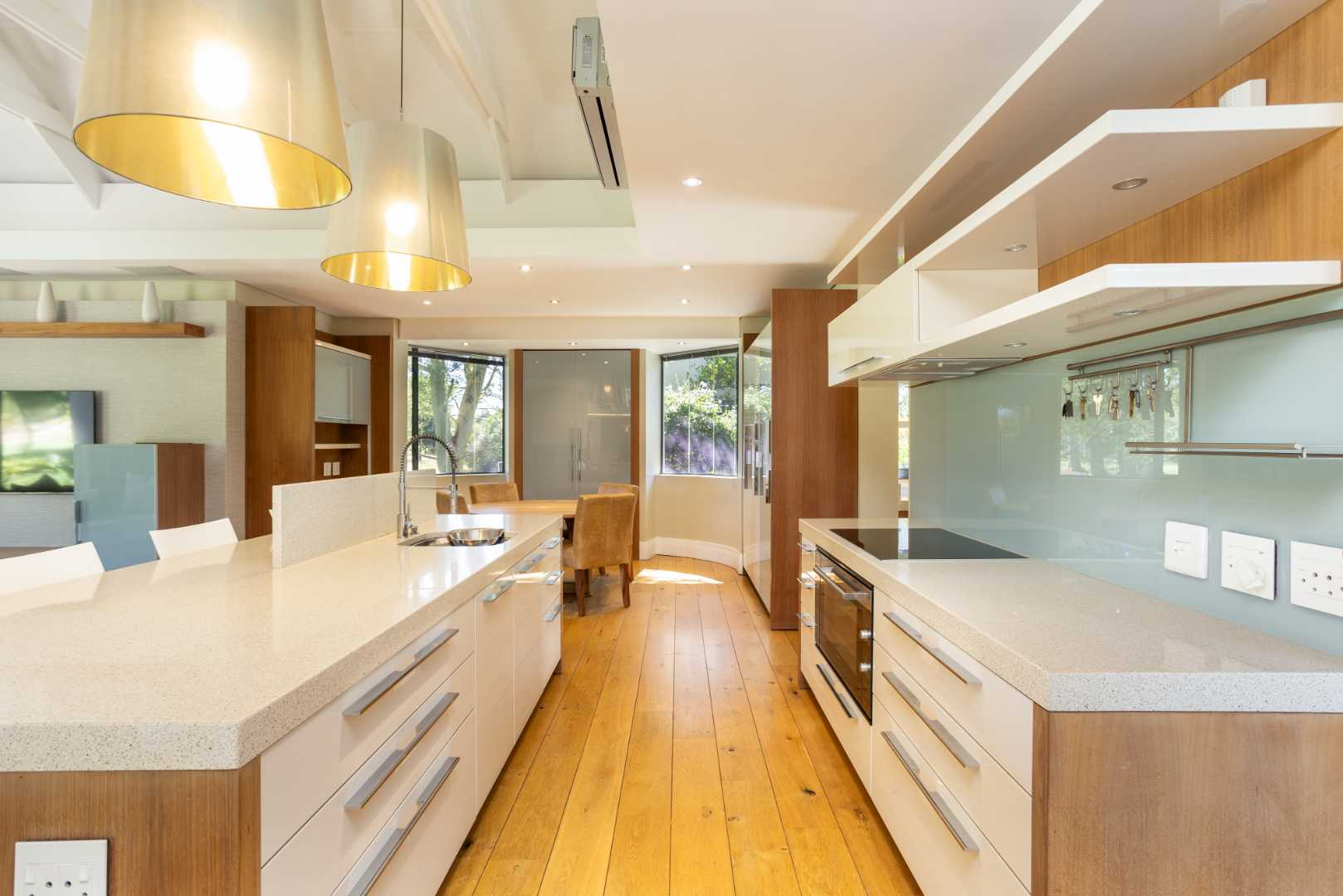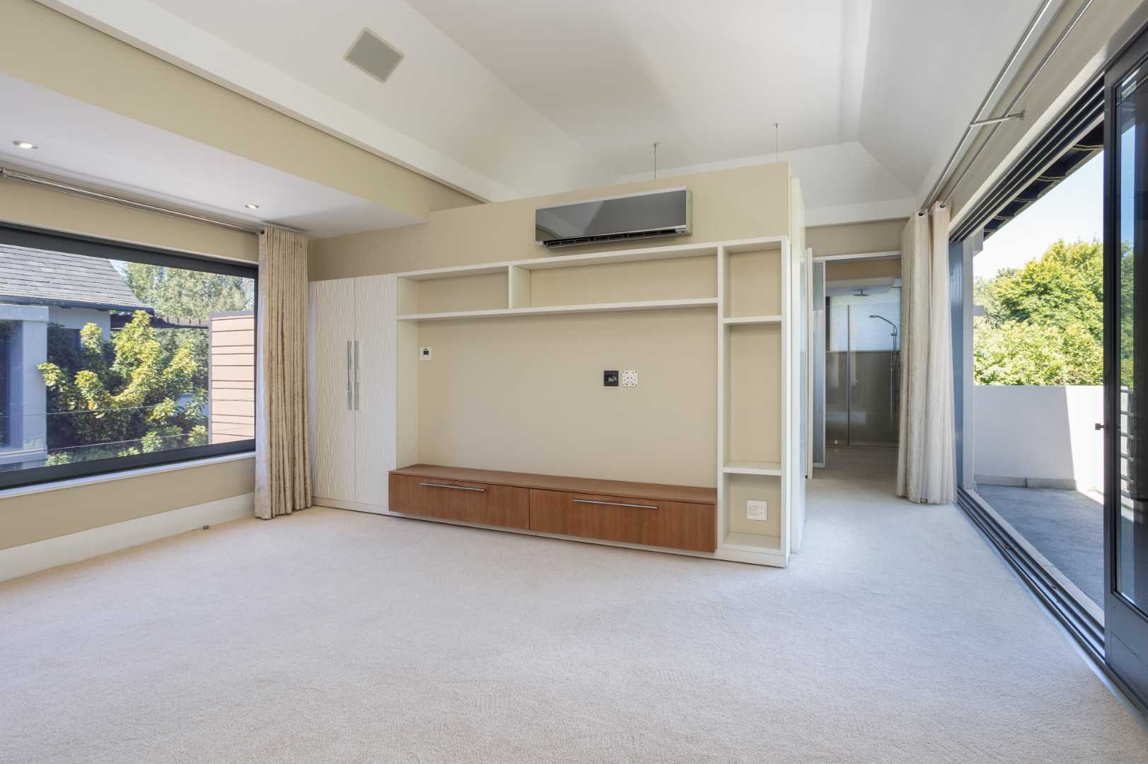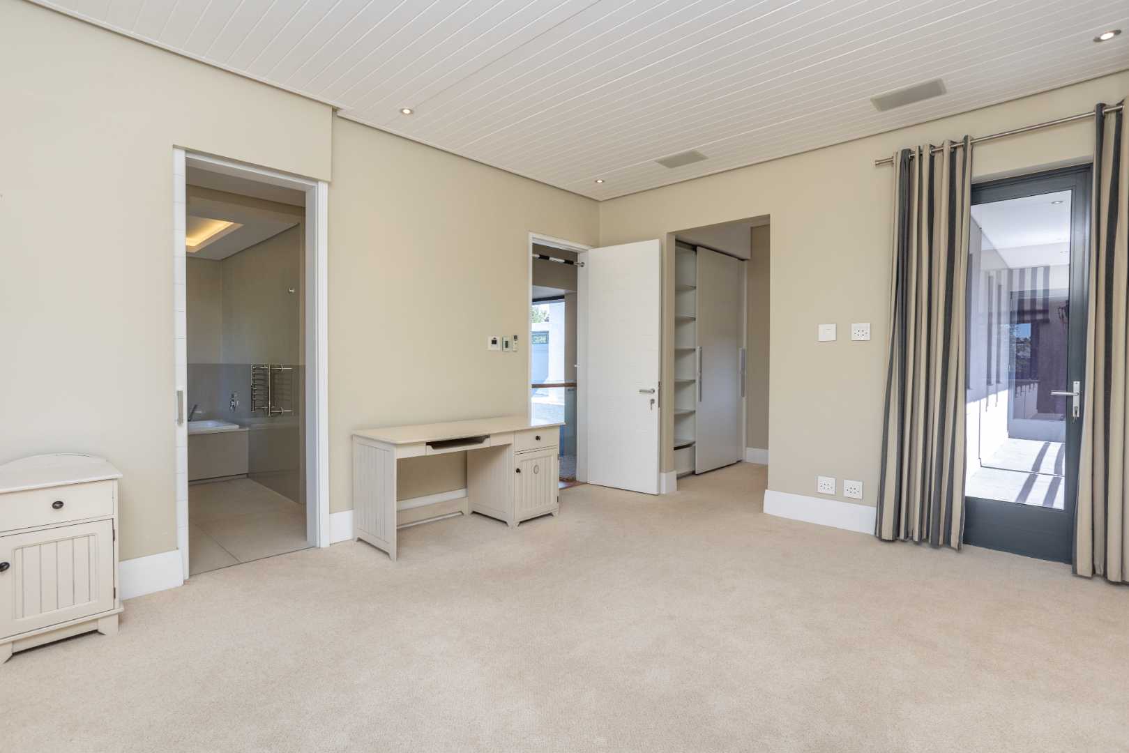 The spacious kitchen is thoughtfully designed for modern family living. It flows into a relaxed breakfast nook, a formal dining area and an outdoor braai patio, creating an inviting space for hosting and everyday moments alike. A separate scullery enhances the practicality of the space, offering ample storage and premium integrated appliances.