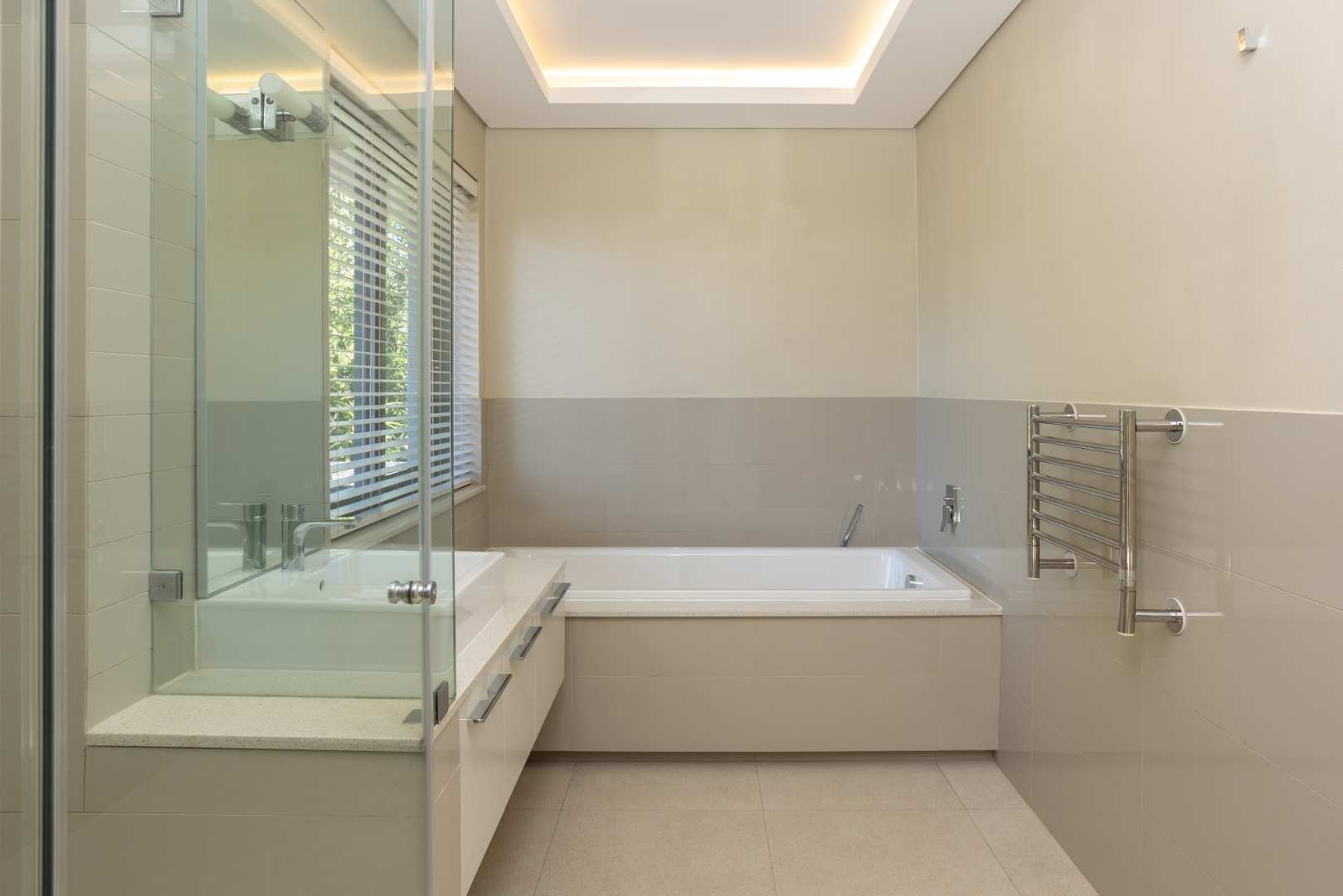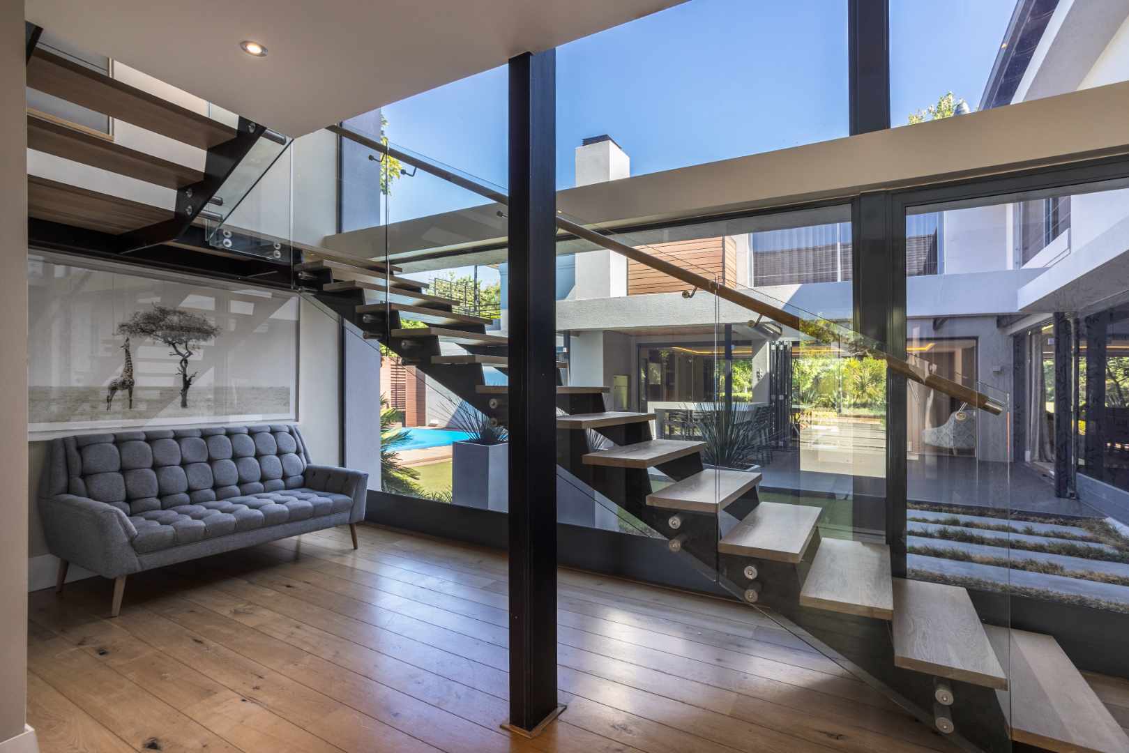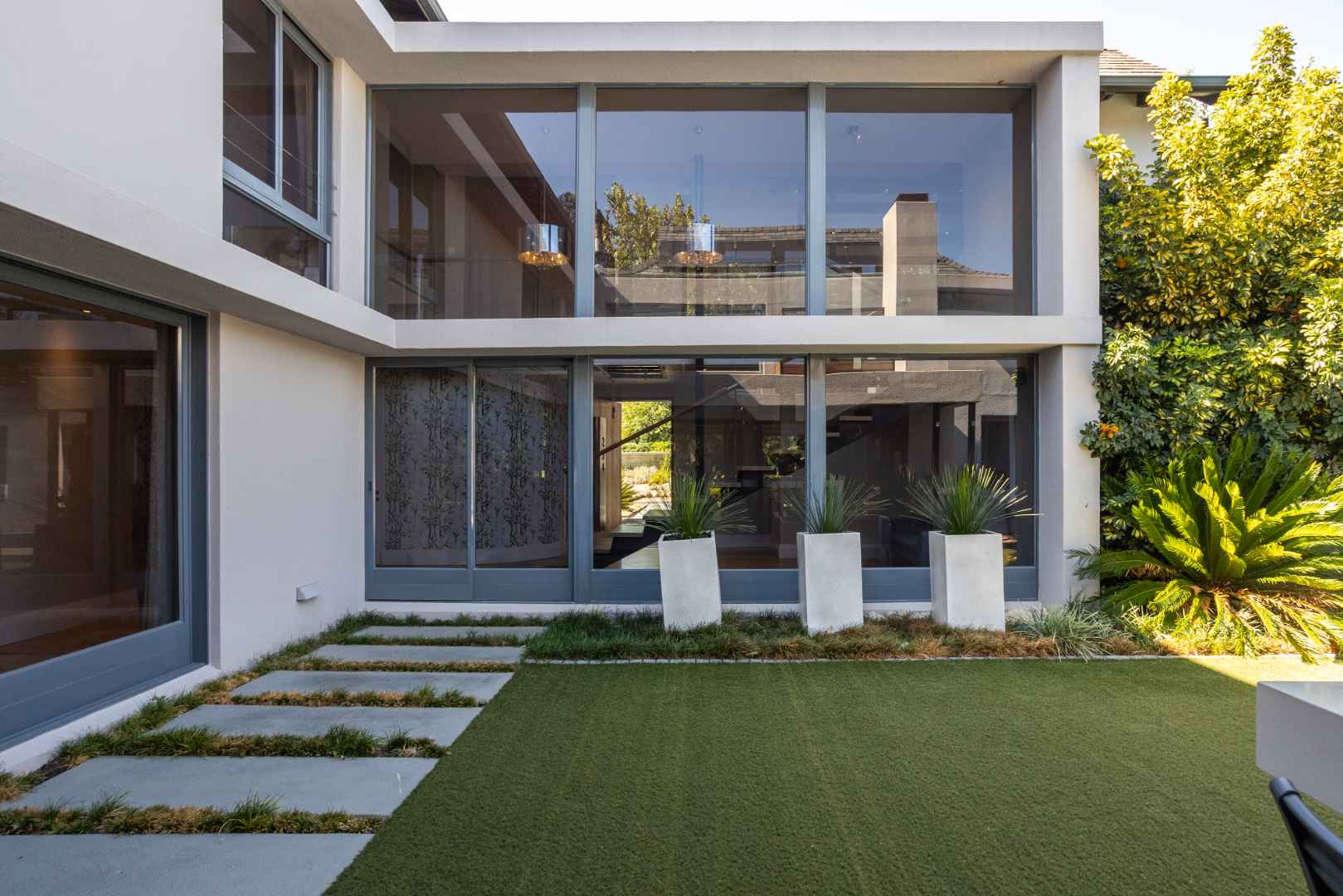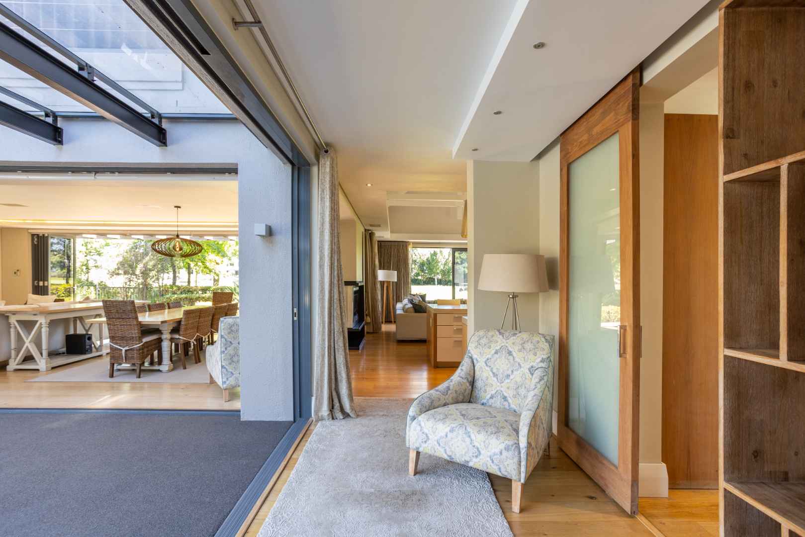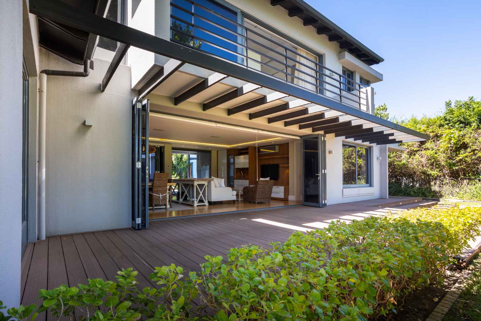 Neutral tones and expansive windows highlight the natural beauty of the surrounding landscape. Sunlit living areas extend into a beautifully landscaped garden, offering a peaceful atmosphere and seamless indoor-outdoor connection.