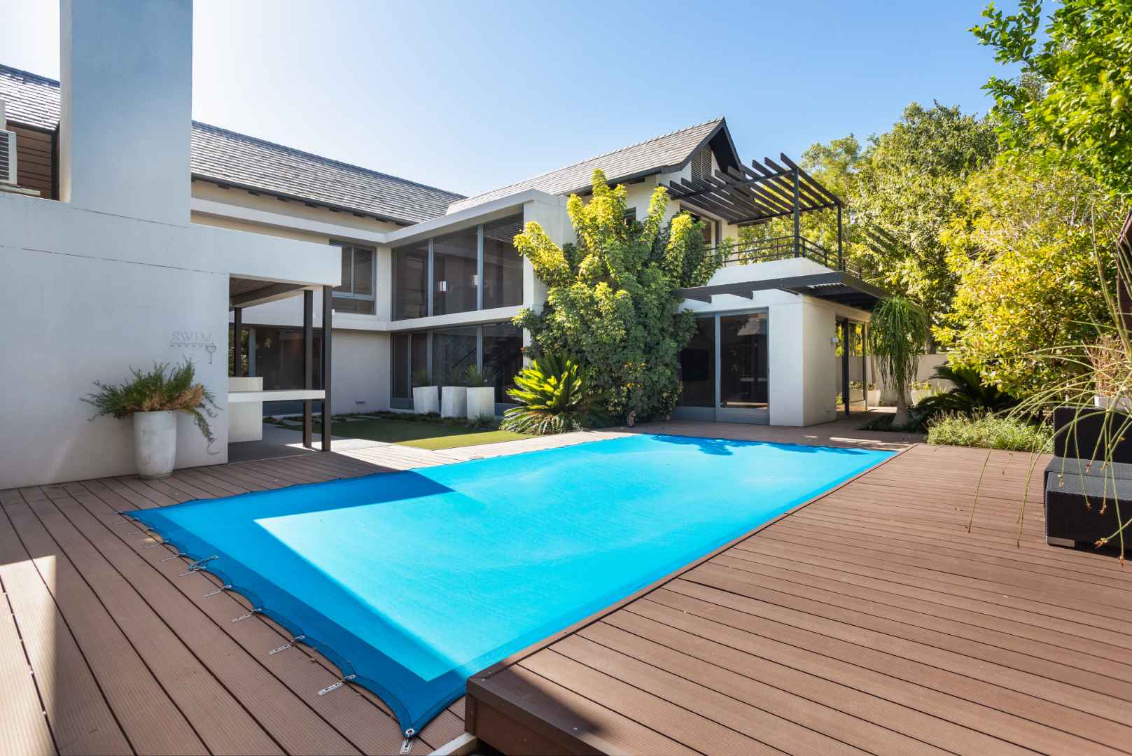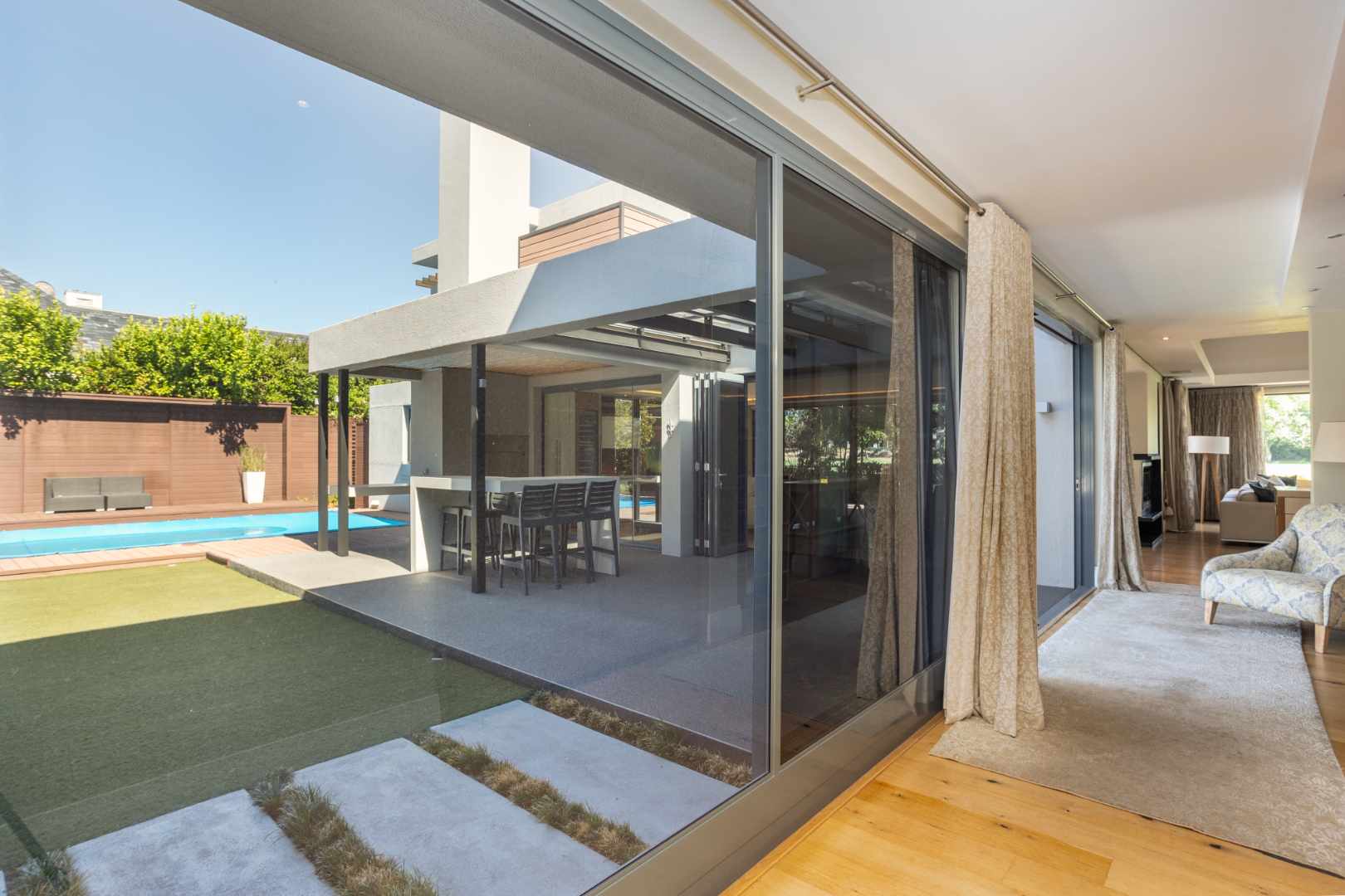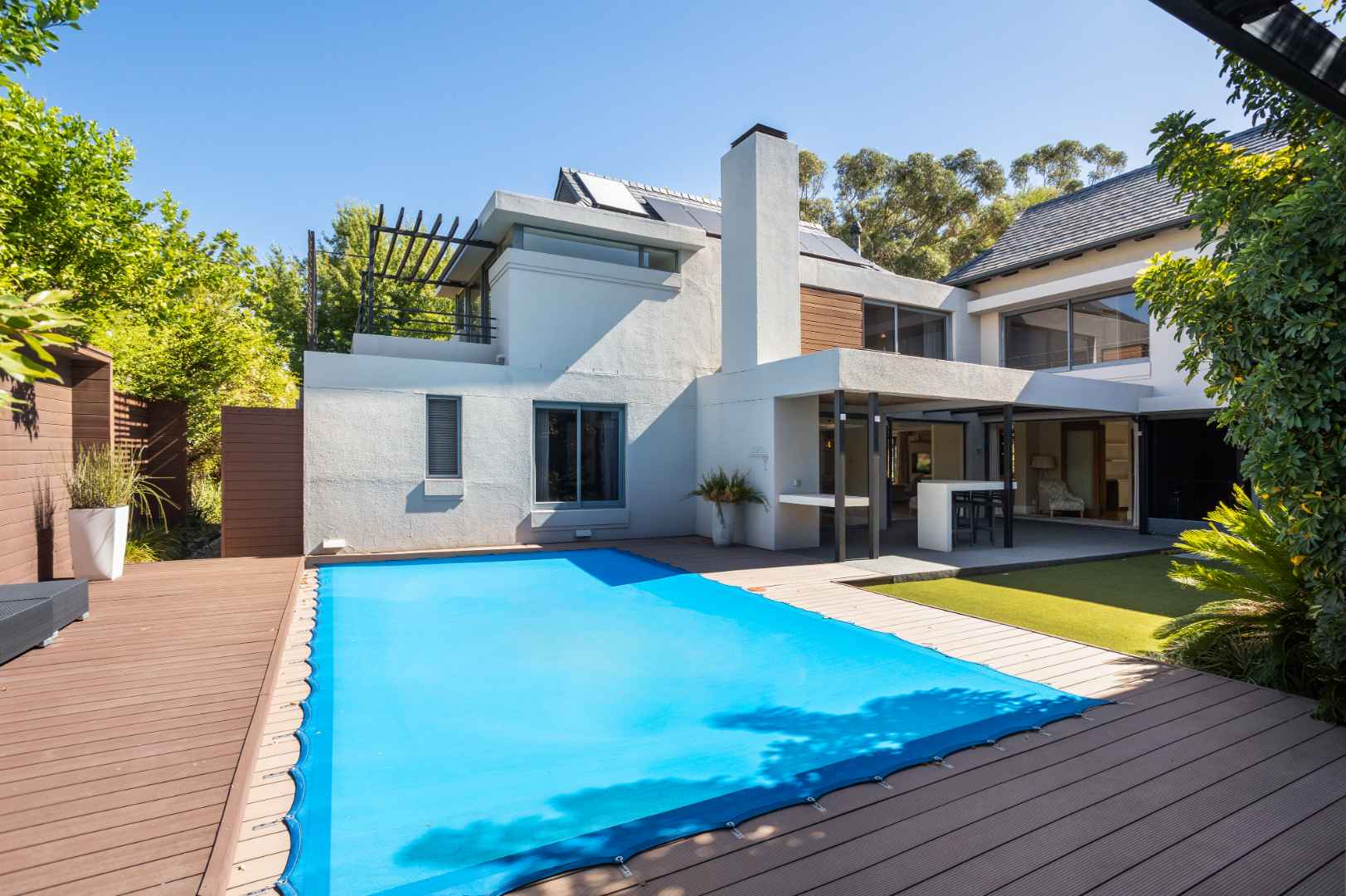 Designed for year-round enjoyment, the outdoor entertainment area includes a sparkling pool, patio and built-in braai, creating a welcoming setting for relaxed gatherings. his well-equipped home also includes staff accommodation, a separate laundry room and three spacious garages.