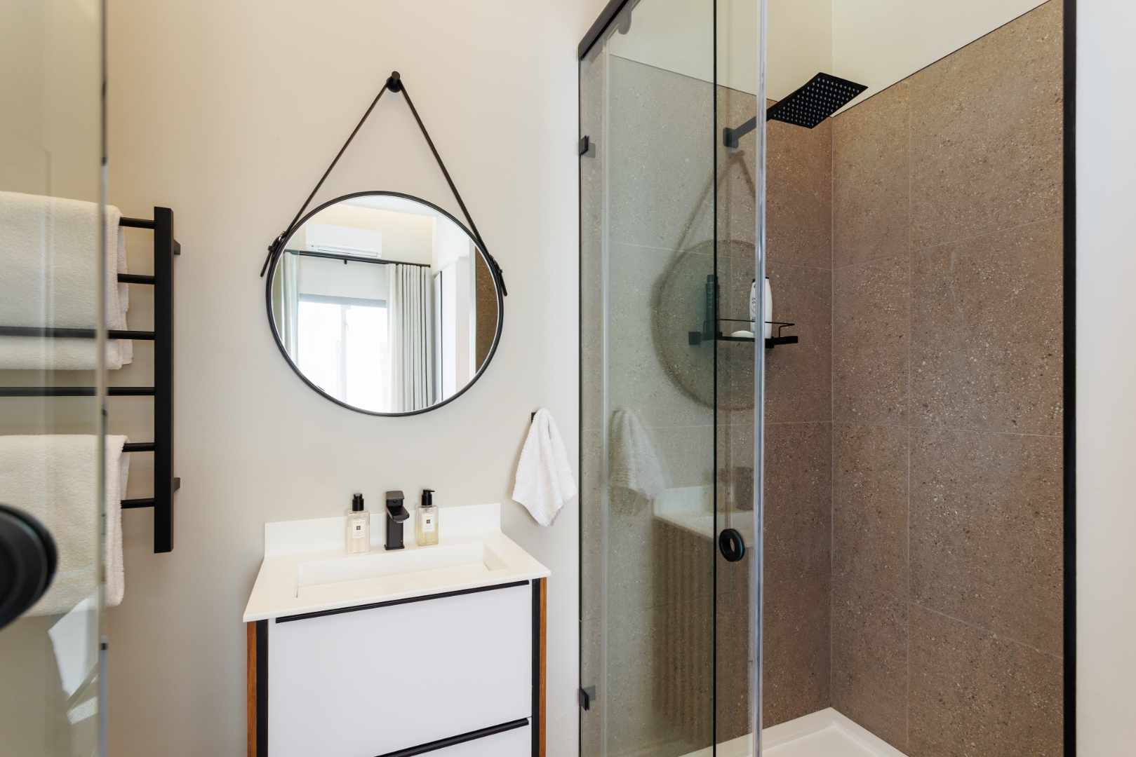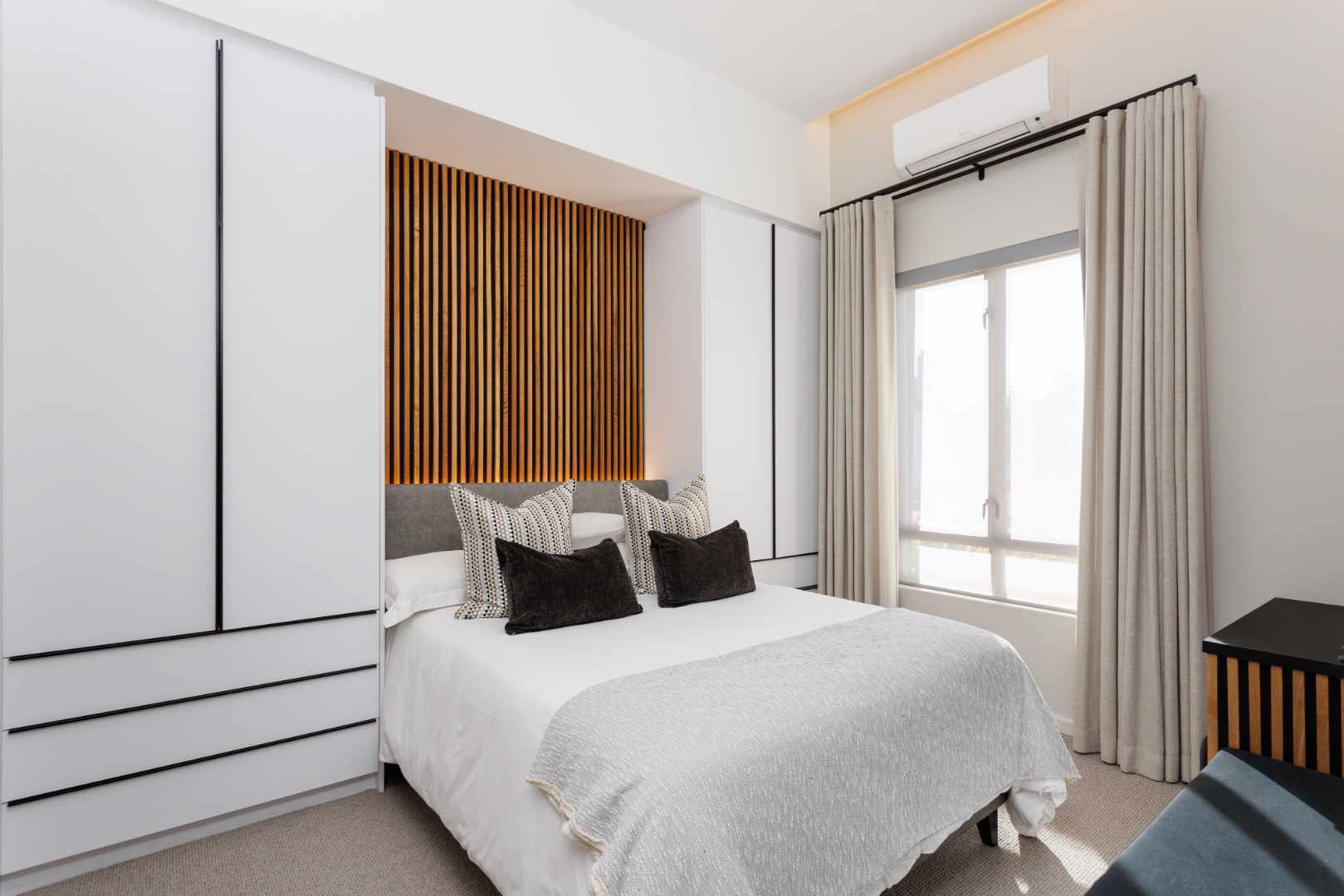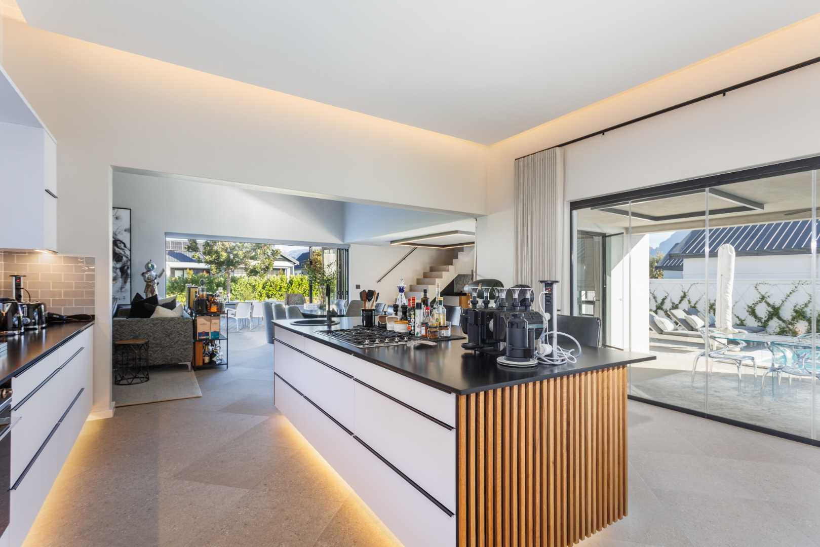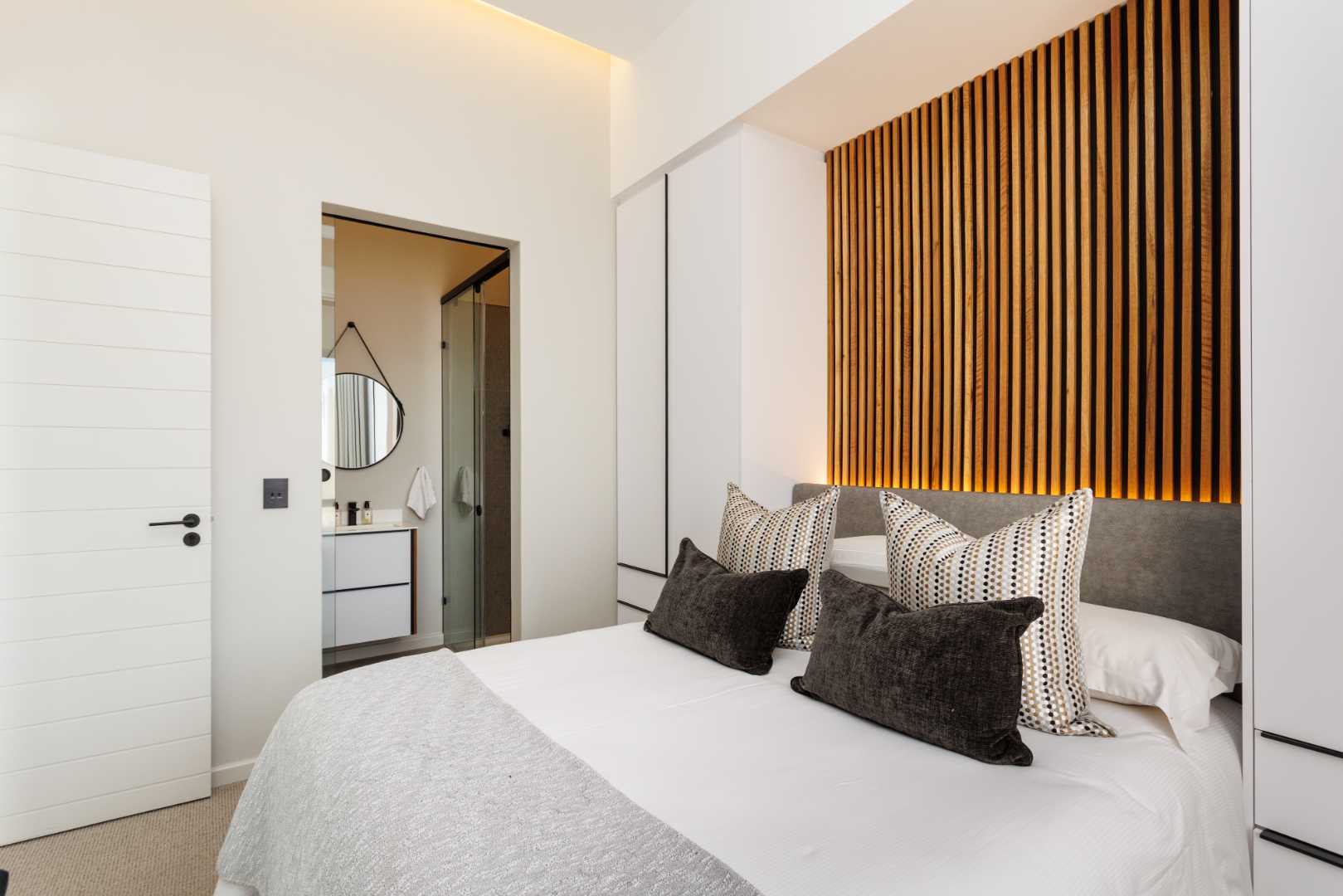 The kitchen features a bespoke centre island with handcrafted wood cabinetry. Granite countertops and integrated appliances, including a gas hob and electric oven, are complemented by a scullery; stylishly separated by an automated glass-fronted sliding door. An integrated wine cooler completes the dining space, where multiple entertainment zones provide the ideal setting for relaxed gatherings. The home offers two en-suite bedrooms, each with bespoke sensor-lit cabinetry, built-in wardrobes, feature walls and accent mirrors. The bathrooms are beautifully fitted with premium fixtures and sleek, modern finishes, complete with heated towel rails for a touch of luxury.