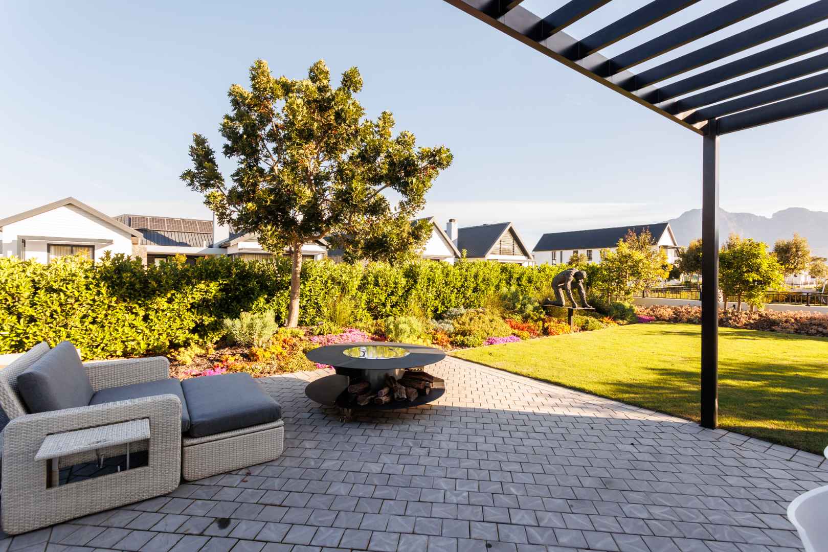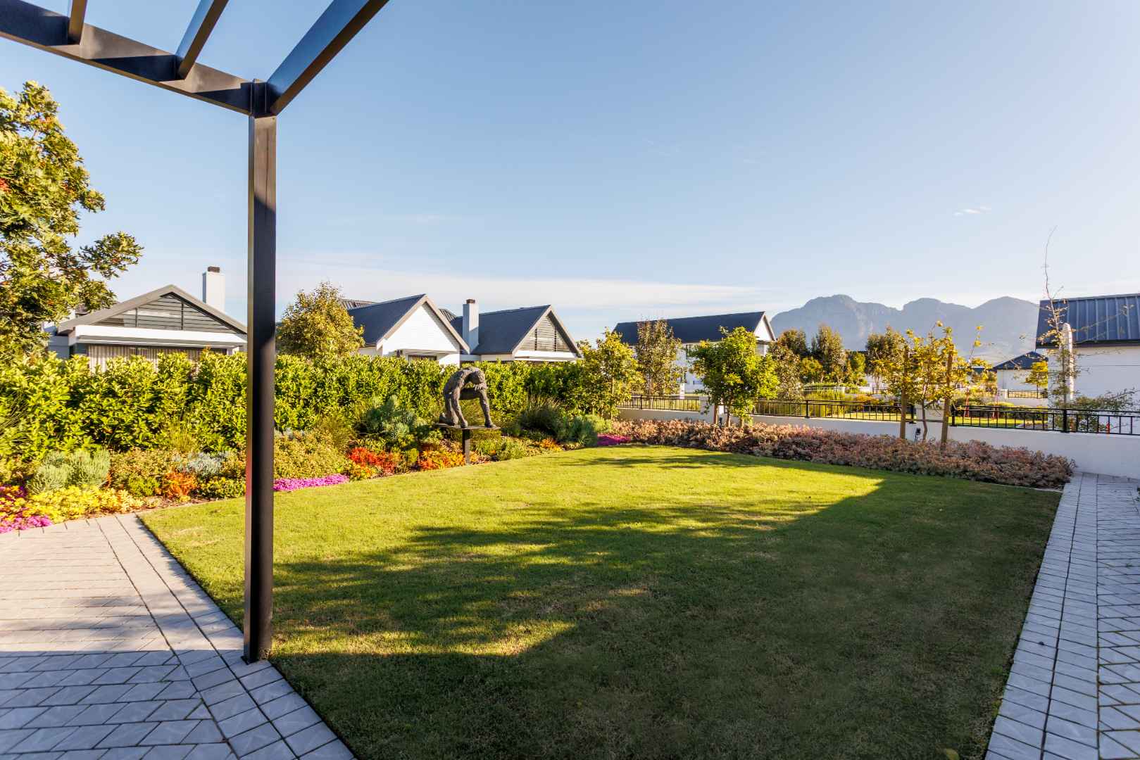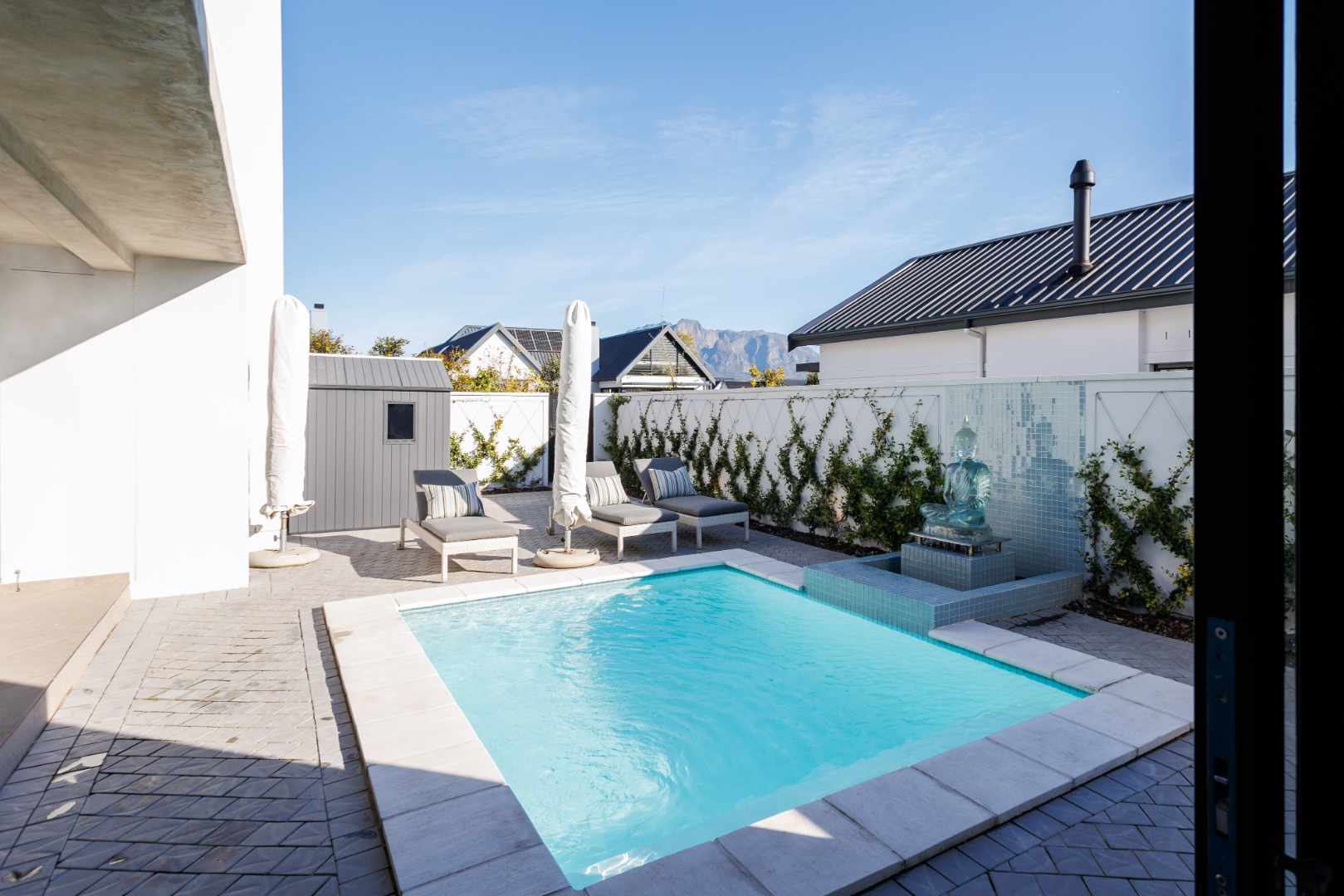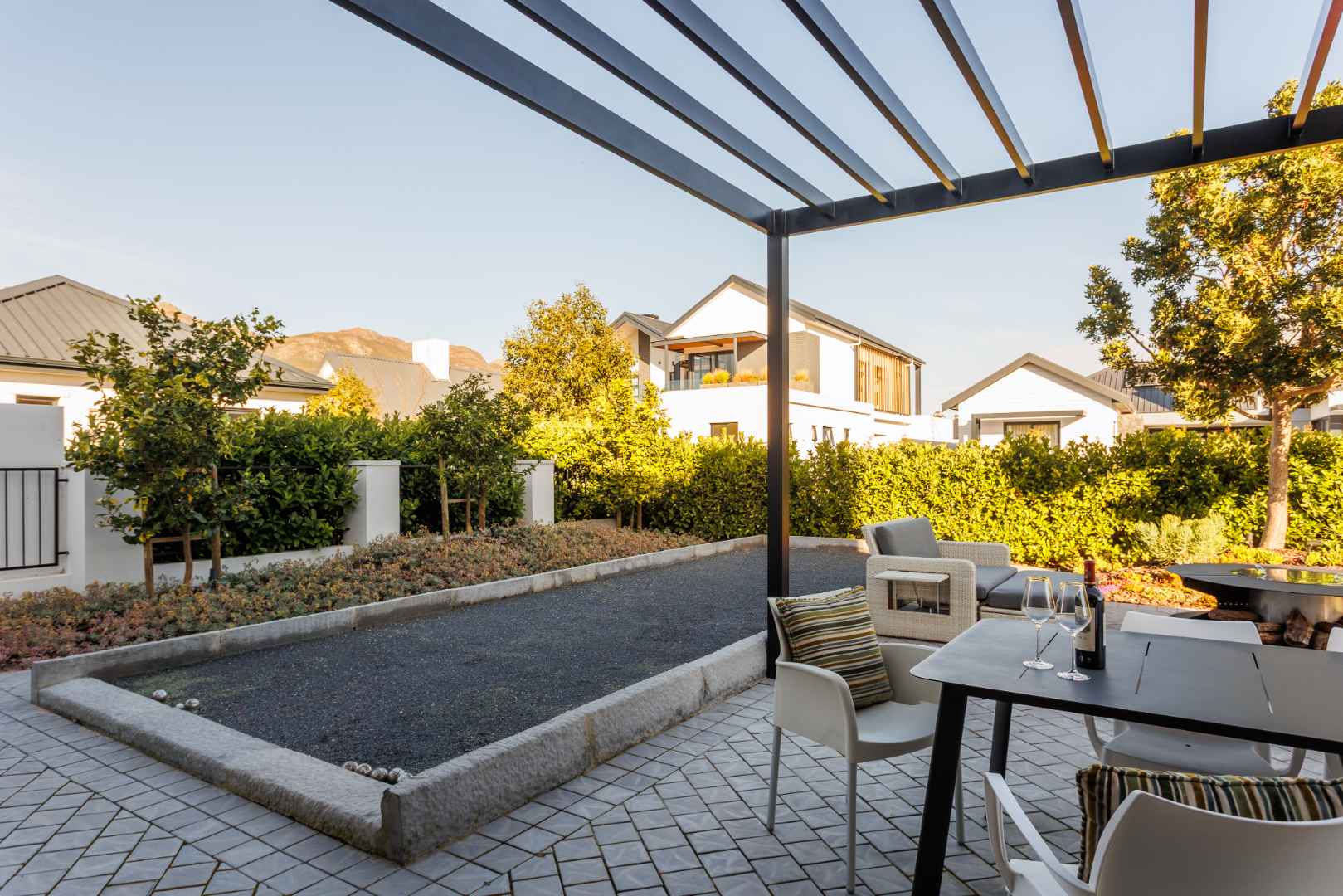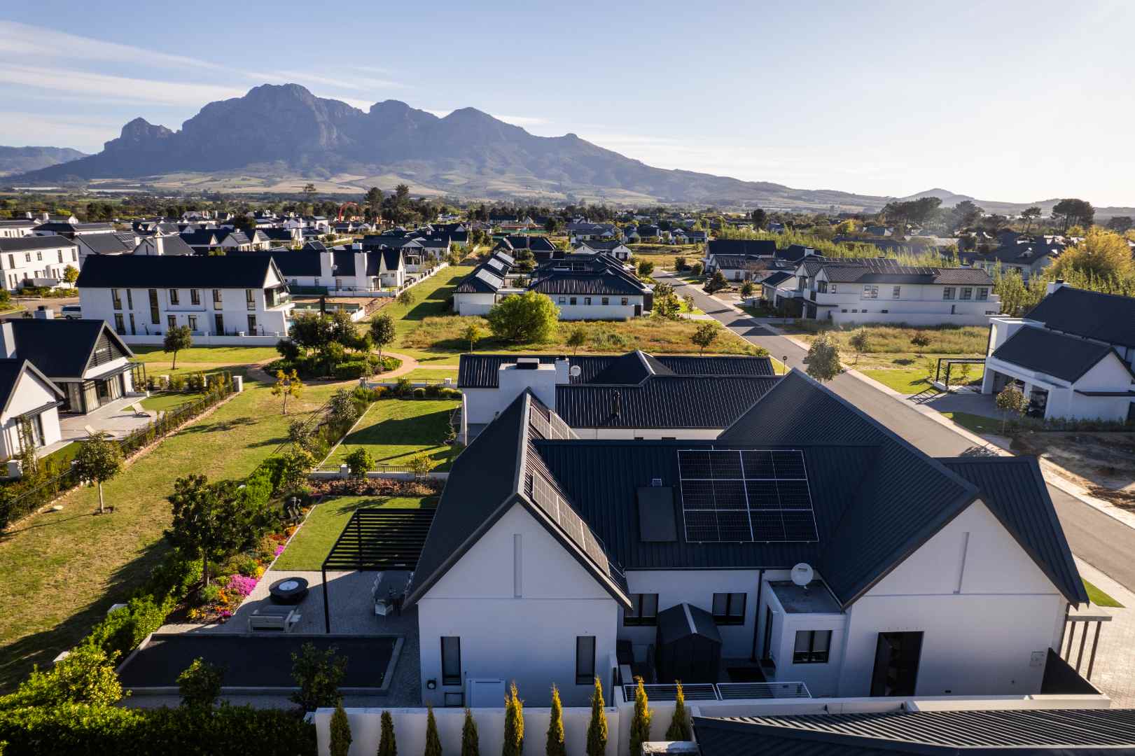 Welcome to a home where modern design meets understated luxury, set within the Acres at Pearl Valley Golf & Country Estate. This architect-designed home offers a rare opportunity for sophisticated living in one of South Africa’s most sought-after regions. Thoughtfully arranged in a U-shaped layout, the home features a sleek design that provides privacy and an abundance of natural light. Majestic mountain views and landscaped green spaces overlooking a green belt and scenic walking trails create an inviting environment.