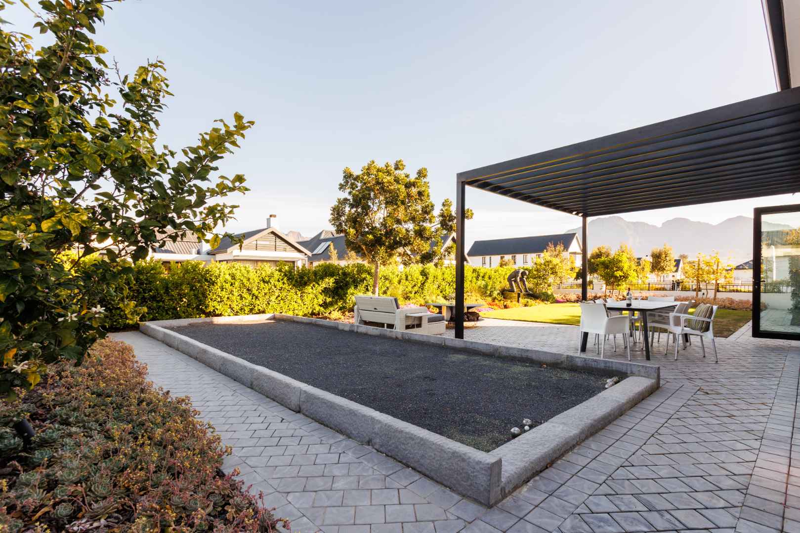 Expansive open-plan interiors flow seamlessly to a covered entertainment terrace. A sparkling pool and a generous landscaped garden featuring a pétanque court, complete the area and is perfect for entertaining. A vaulted ceiling and spacious mezzanine study overlook the main lounge and can be used as a private guest suite, enhancing the home’s versatility.