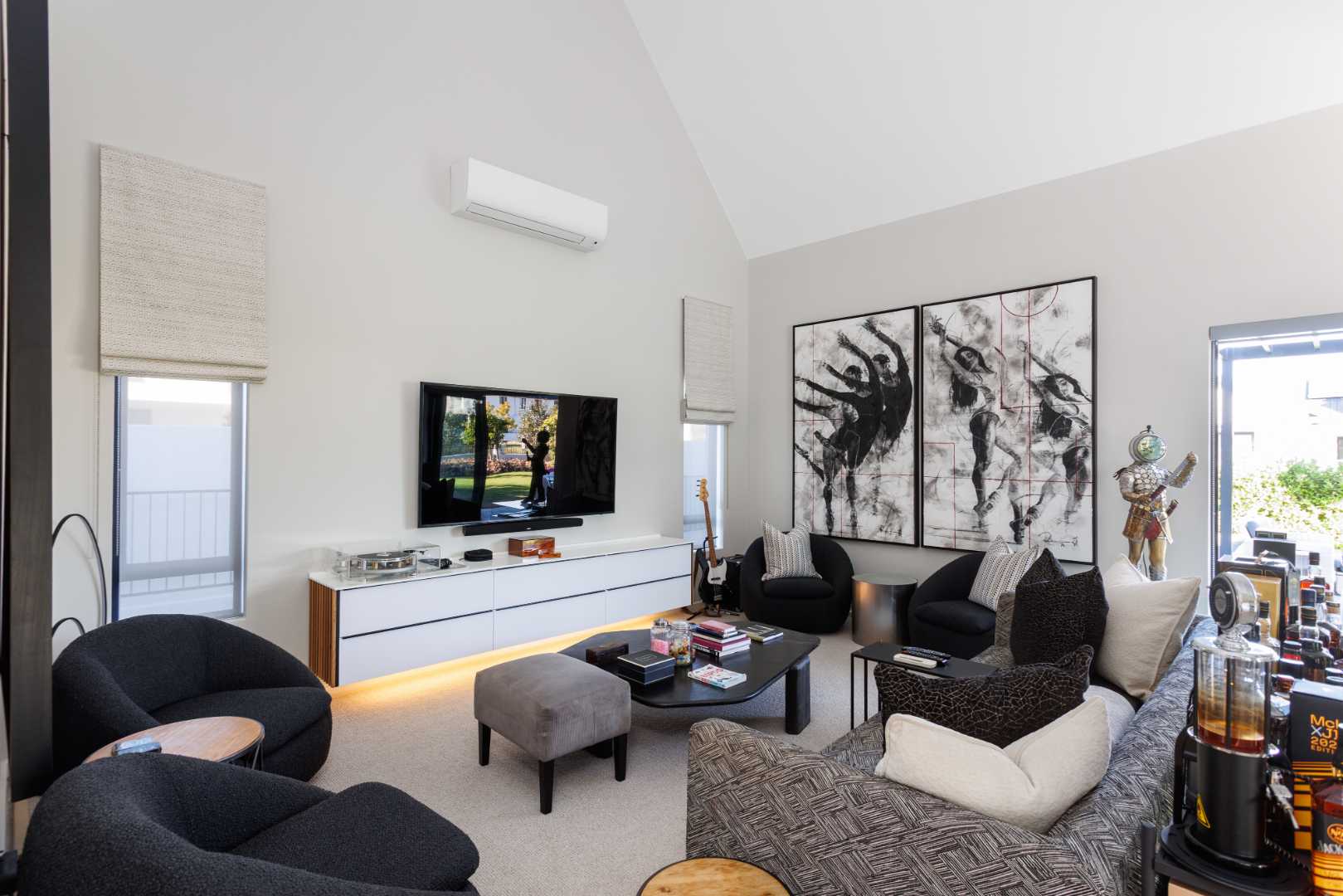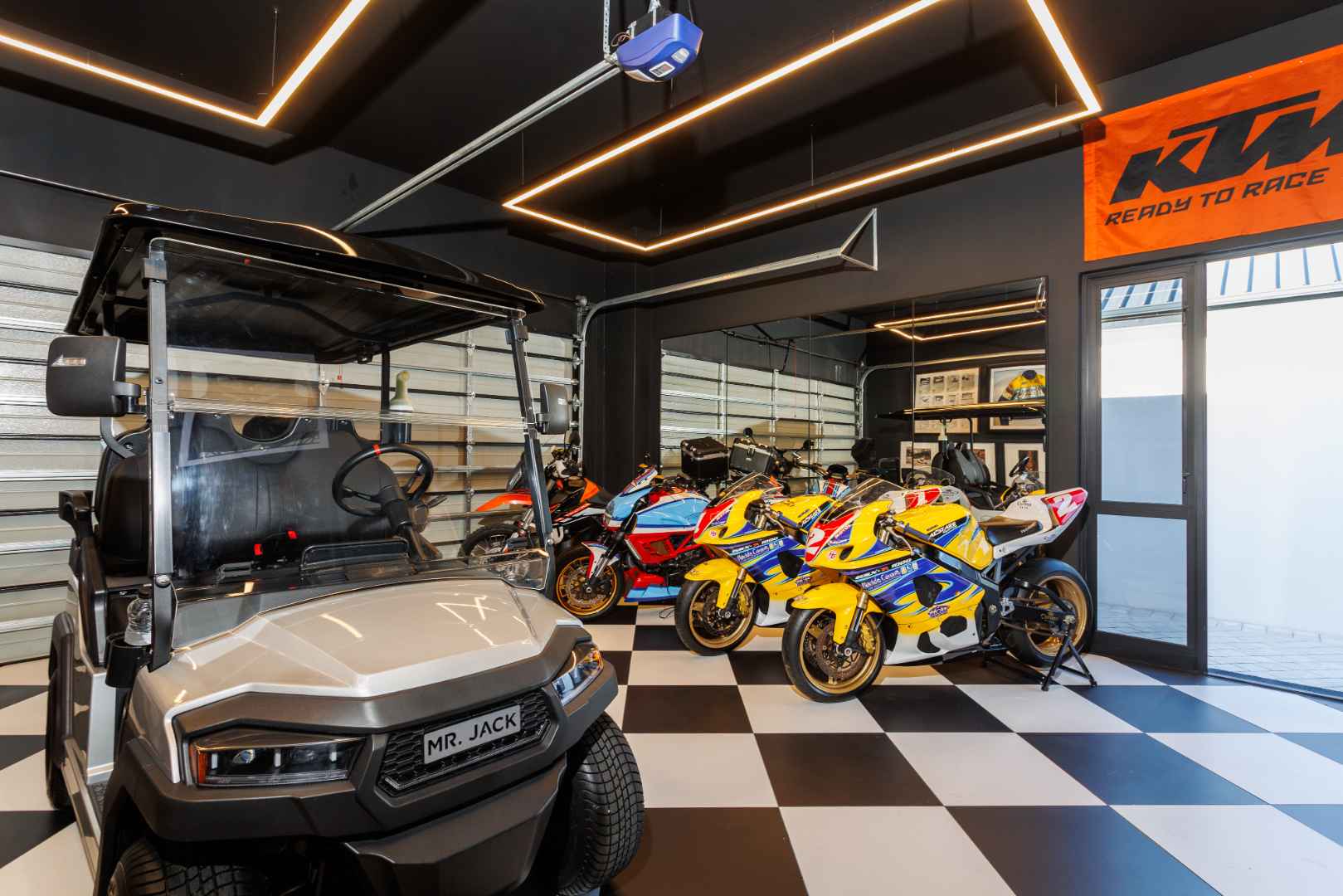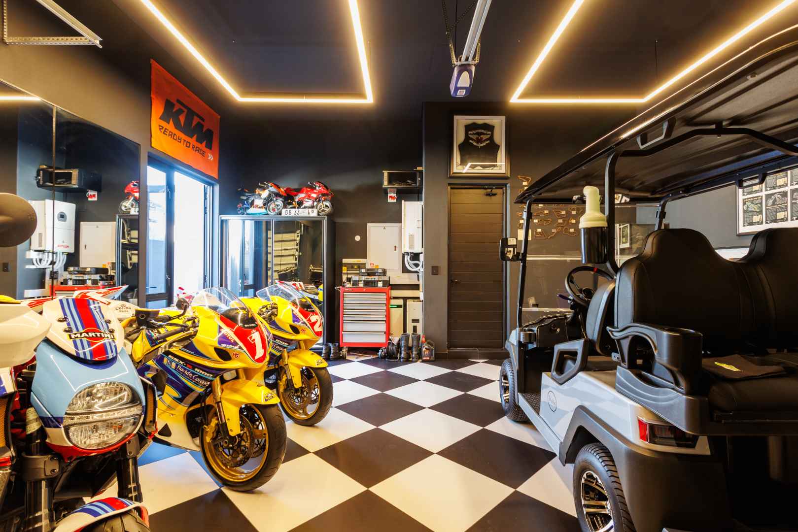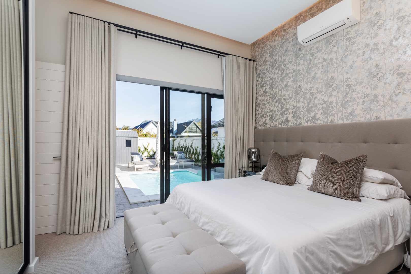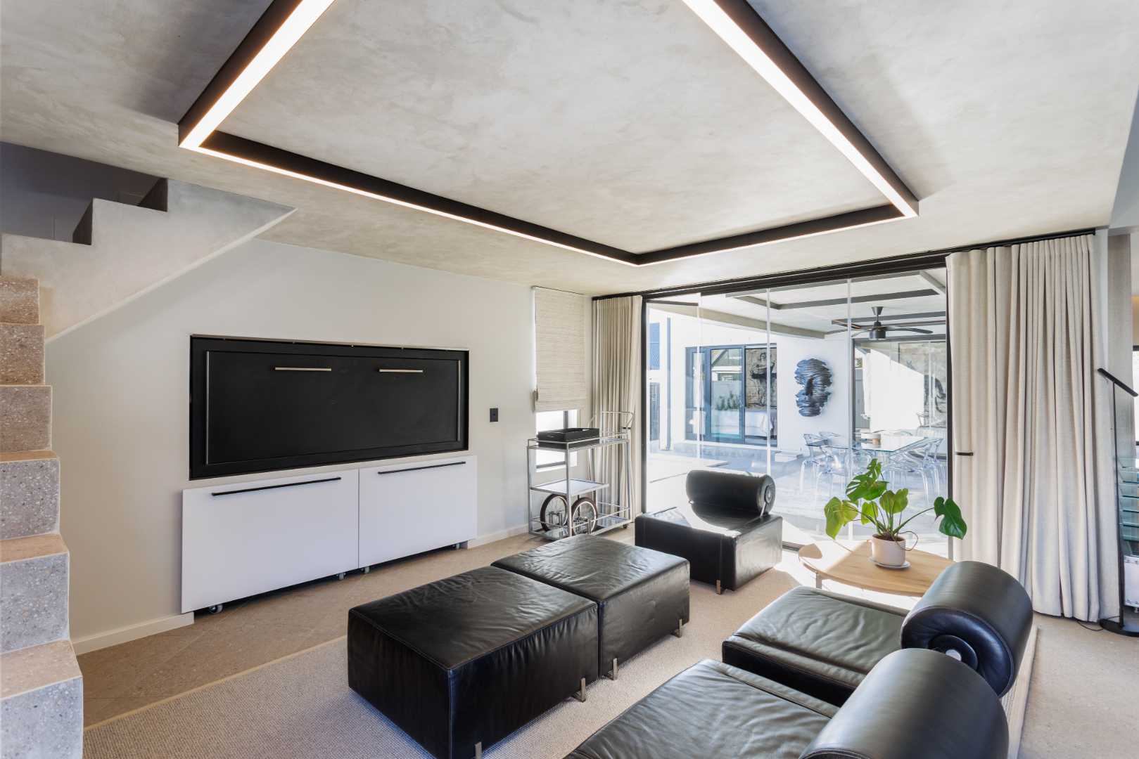 Custom-designed mirrors, blinds and curtains are included, as well as a built-in TV and sound system in the living area. An underground irrigation system supports the fully irrigated garden. The enlarged double garage with built-in cupboards provides direct access to the scullery, complemented by two additional off-street parking bays. Multiple entertainment areas offer year-round enjoyment, while the primary bedroom features a TV discreetly housed in cabinetry.