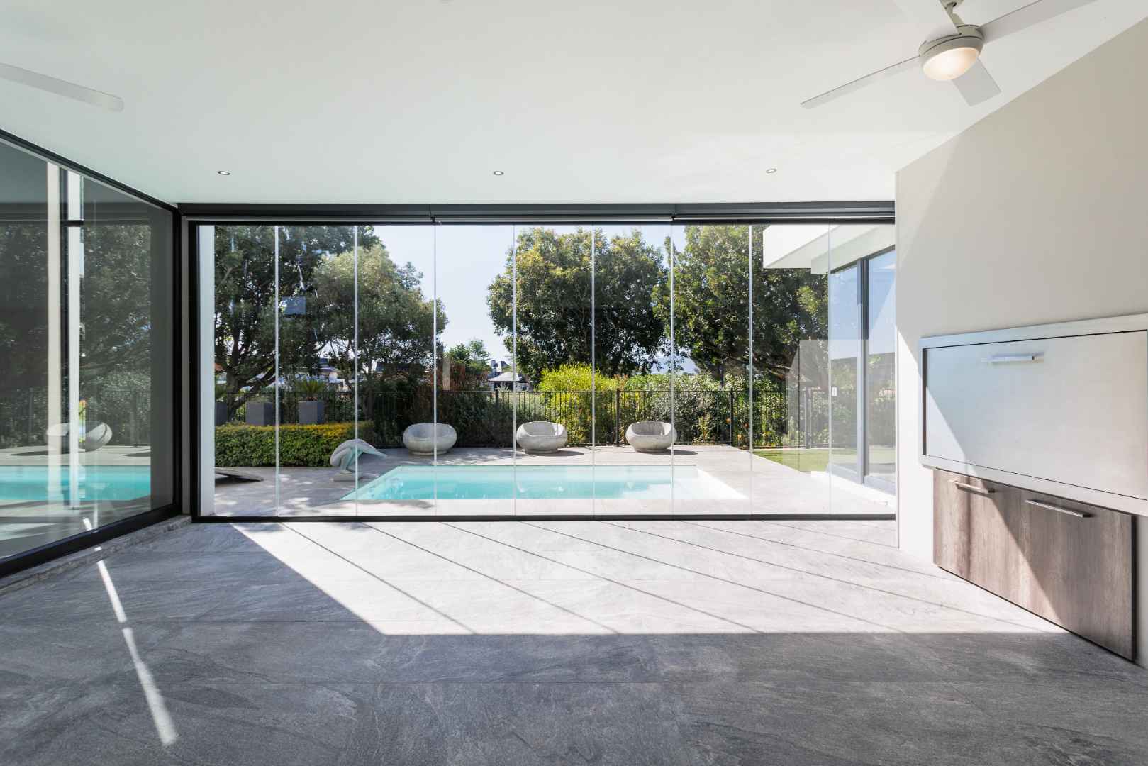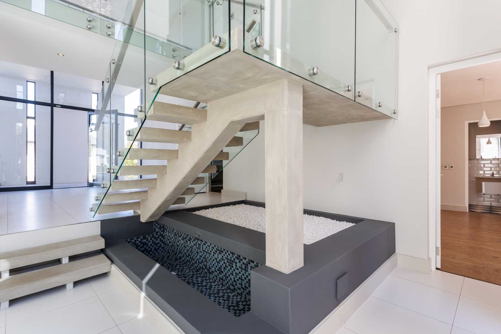 Upon entering, a sculptural water feature and statement chandelier set an immediate tone of elegance. The double-volume glass entrance is anchored by a sweeping glass staircase, allowing sunlight to pour through the open space. The design seamlessly connects the indoor and outdoor living areas, reflecting the natural flow of the home.