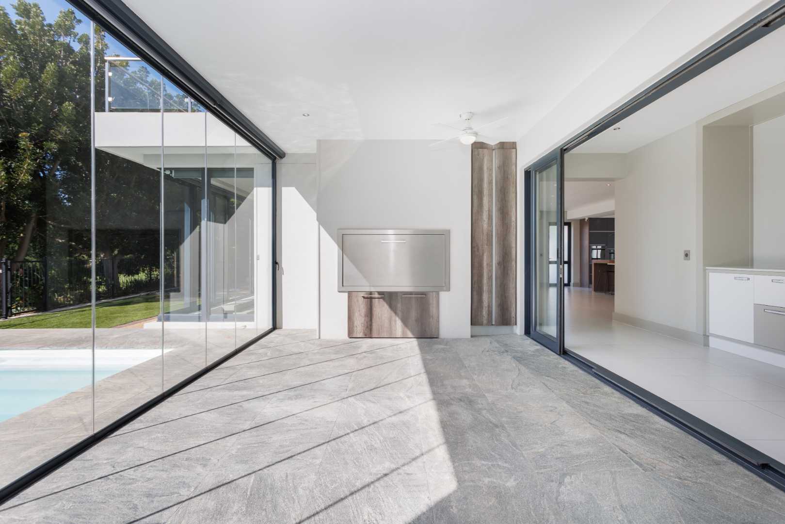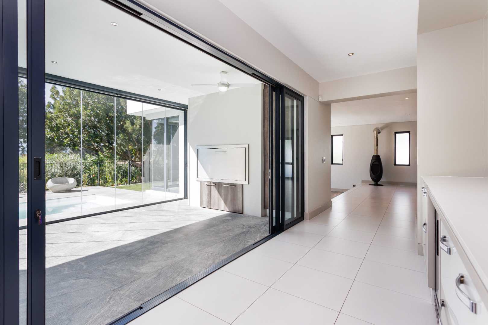 The hosting experience continues in the dedicated braai room, a space designed for enjoyment and connection. A fitted bar, television point, and built-in steel braai make it perfect for visiting guests, while stacking glass doors open entirely to the terrace, creating a seamless transition to the outdoors. From here, the view extends over the lake and golf course, providing a picturesque setting for al fresco dining and sundowners.