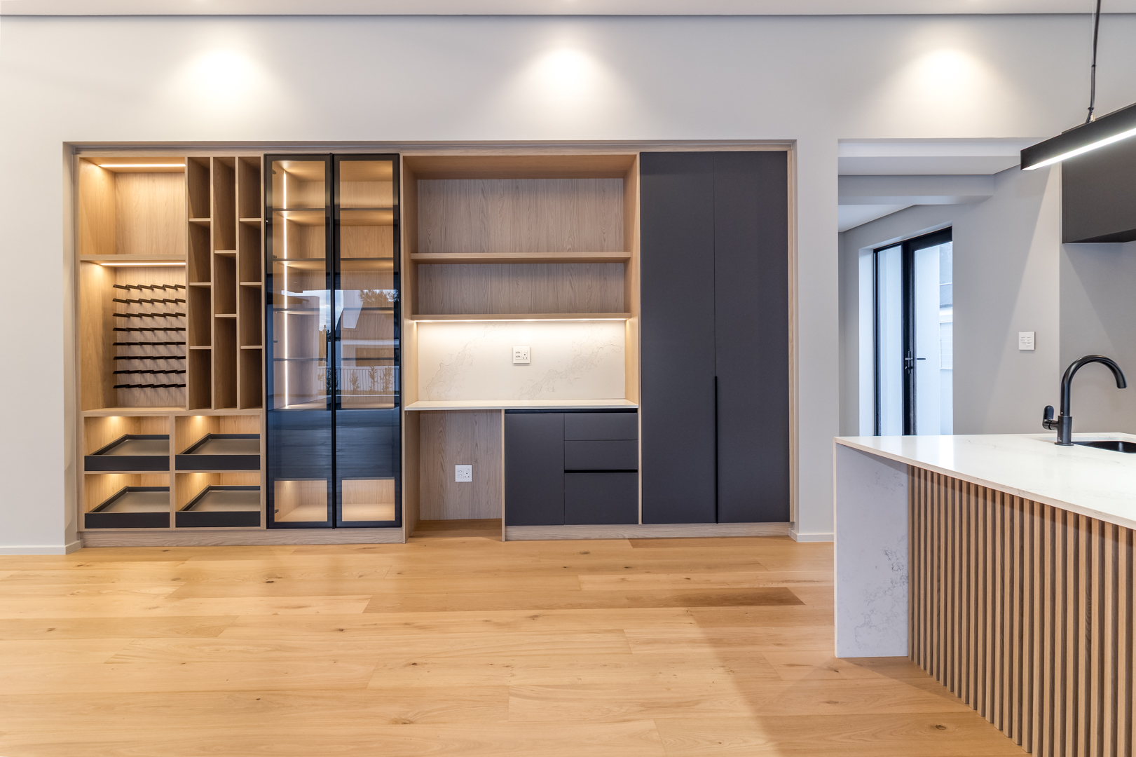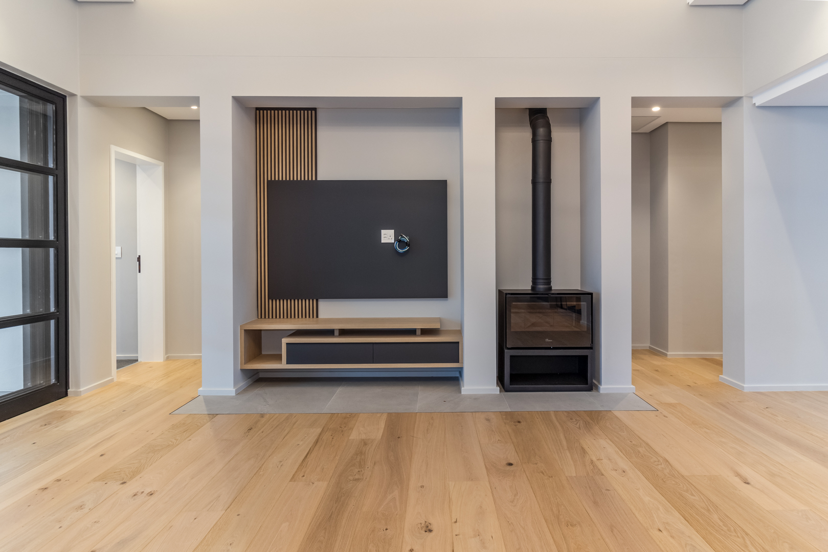 A welcoming lounge with a log-burning fireplace and a high-spec Blum designer kitchen—equipped with a full wine bar display, drinks fridge, and coffee station form the heart of the home.