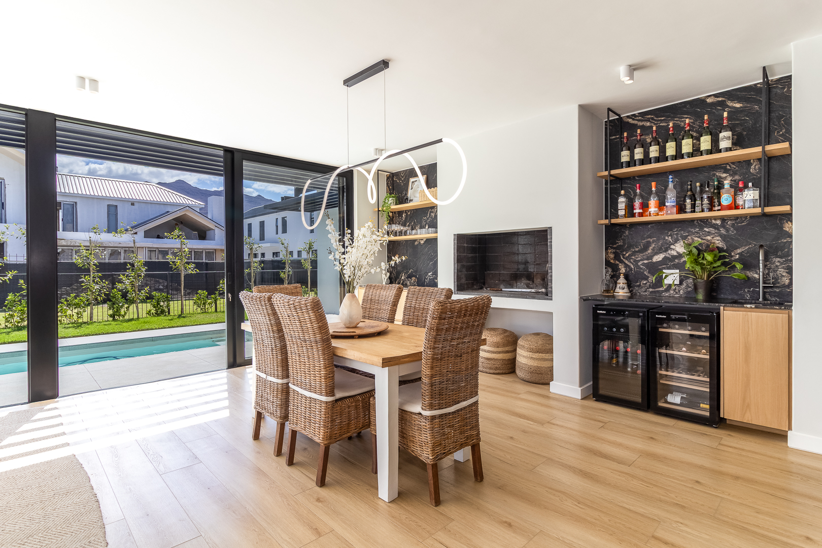 The indoor braai and fireplace anchor relaxed gatherings, while the sparkling swimming pool and lush garden become the backdrop for sun-drenched afternoons, children at play, and evenings spent around the table as the light softens.