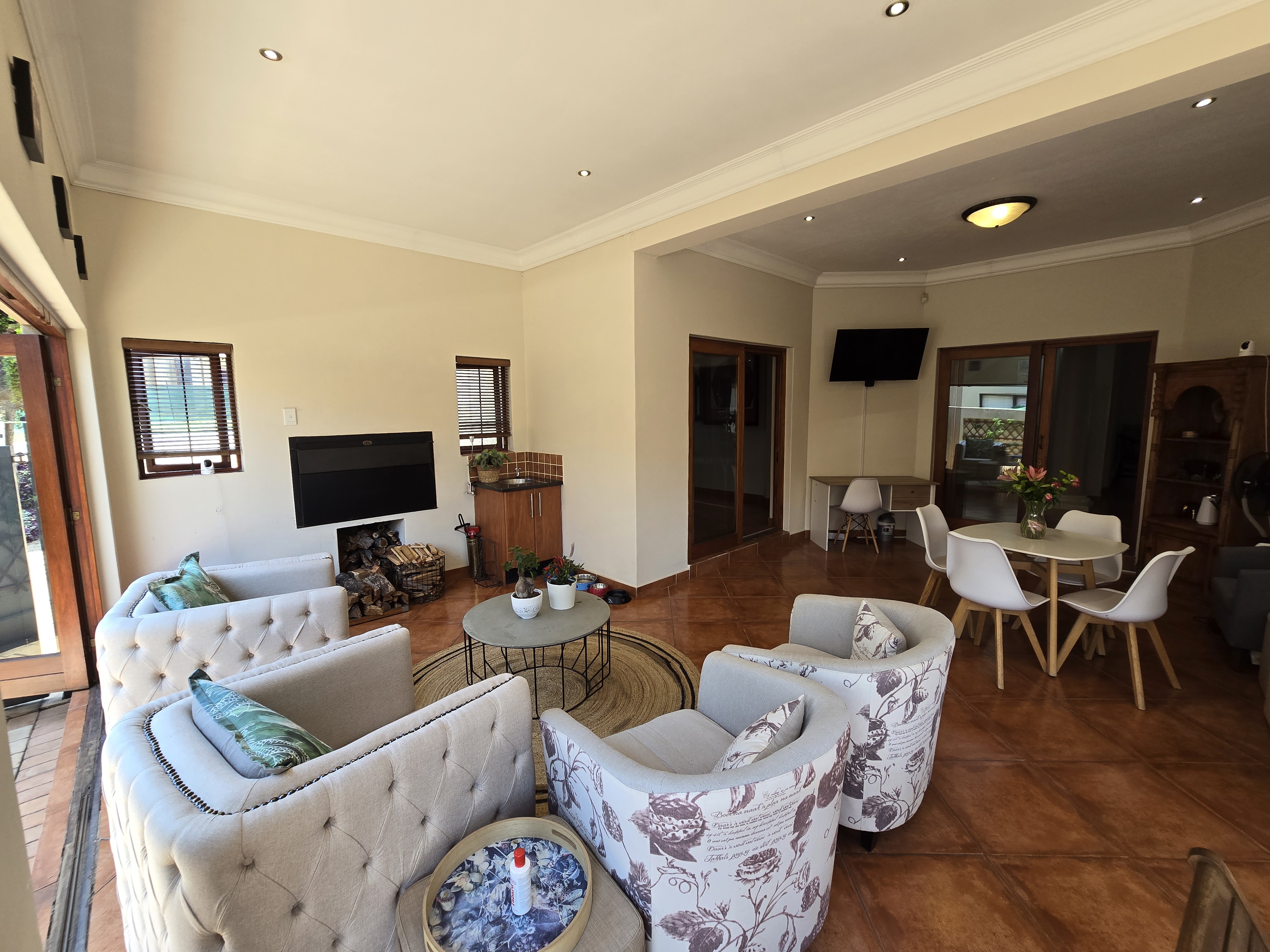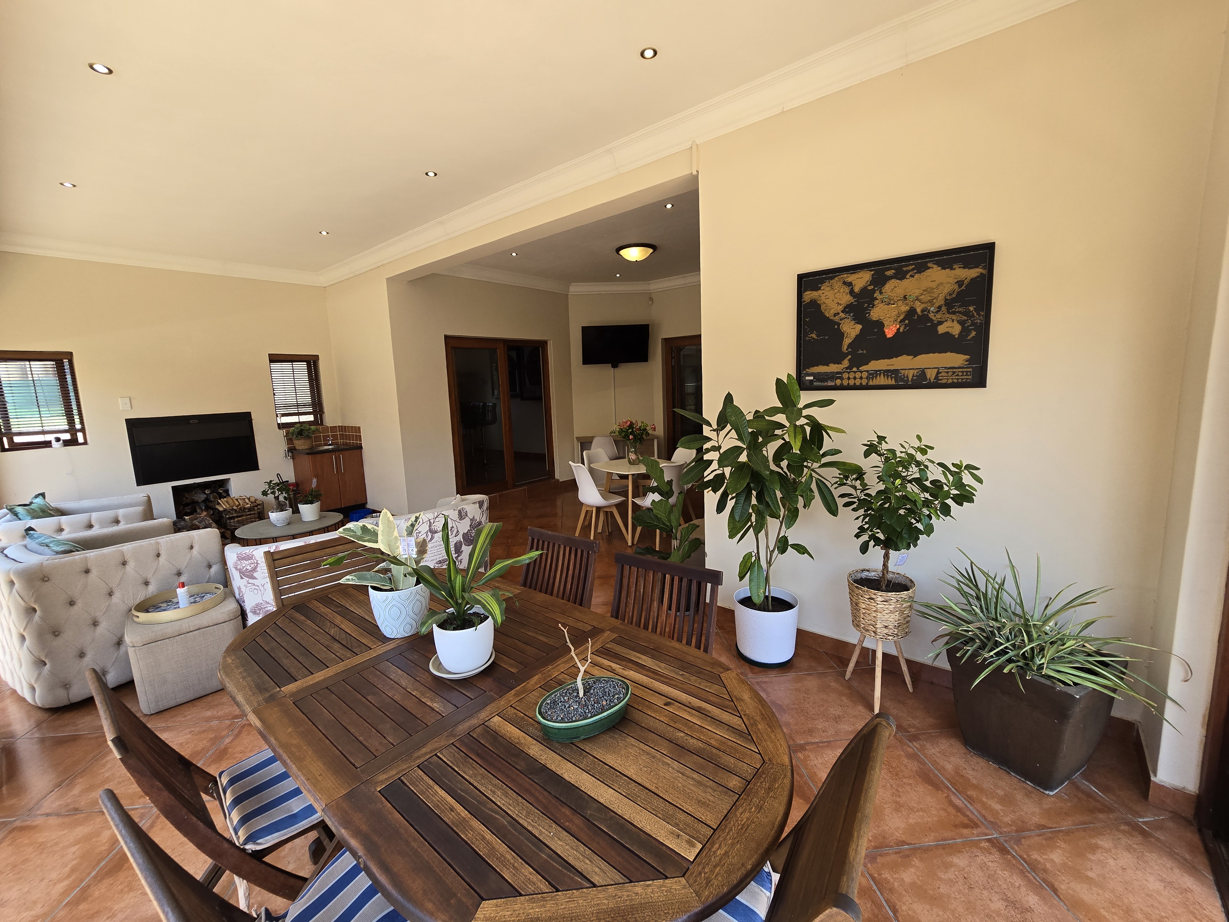 Inside, the home welcomes you with a generous open-plan lounge and dining area that flows seamlessly into a well-sized kitchen, designed for both practicality and everyday living. An enclosed braai room with a built-in bar adds to the home’s entertainment appeal, making it suitable for all seasons.