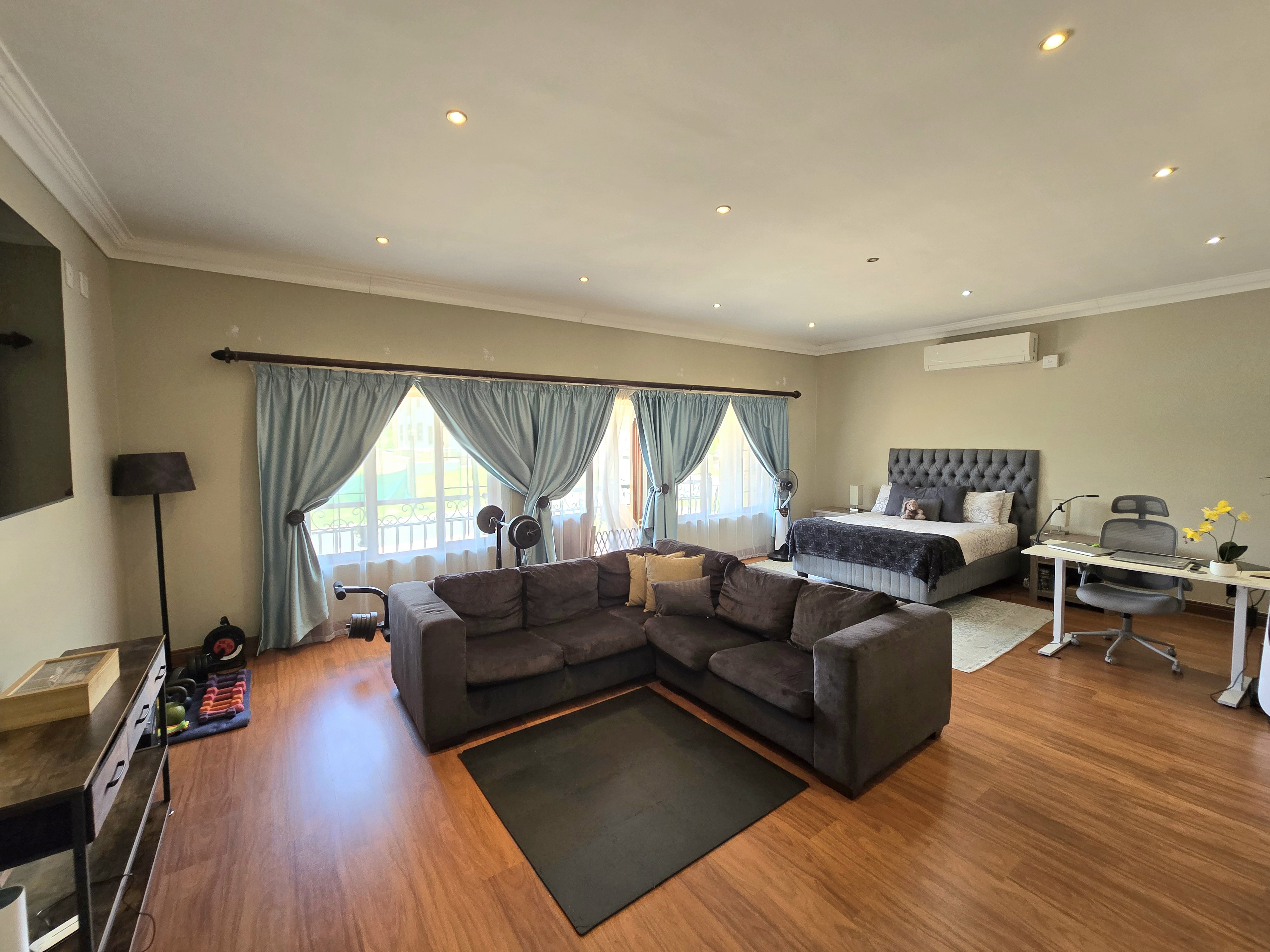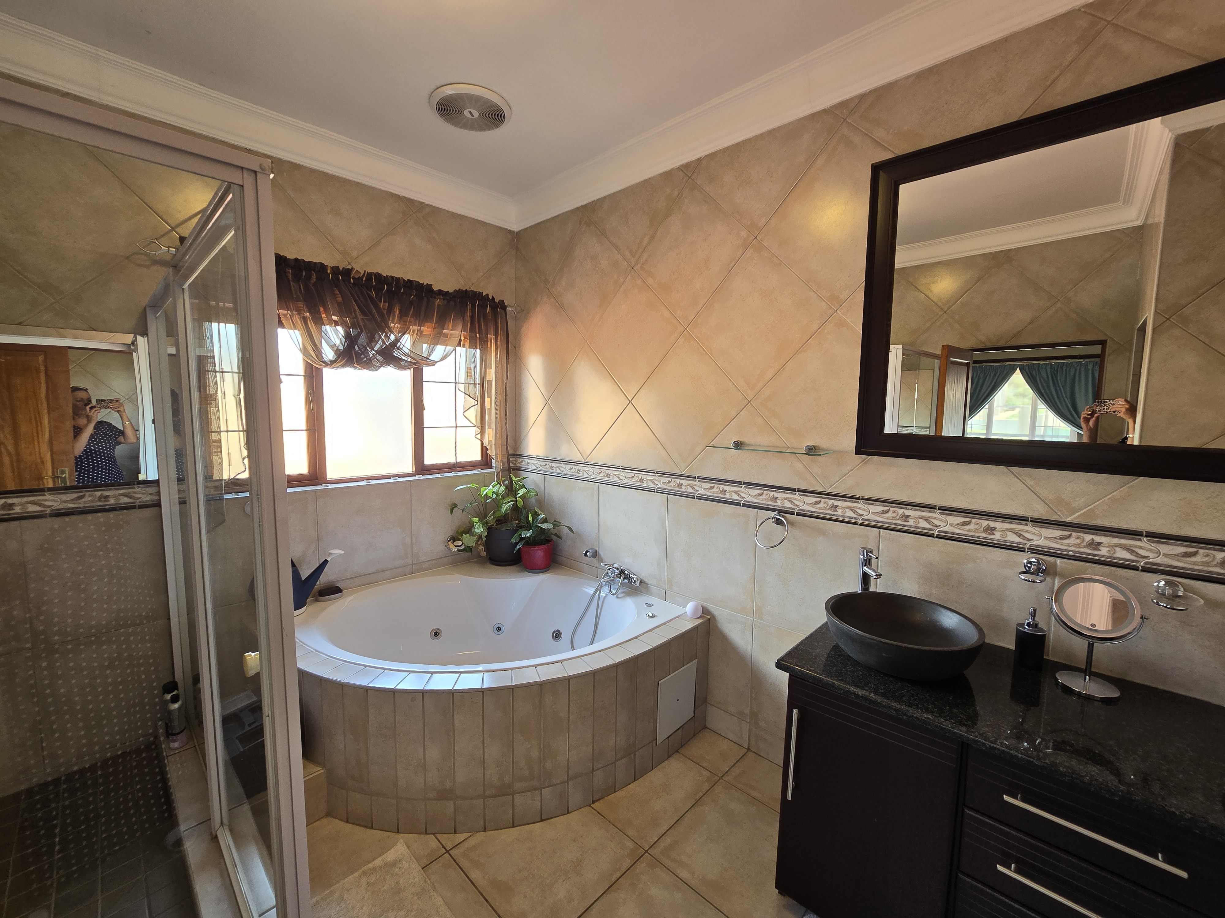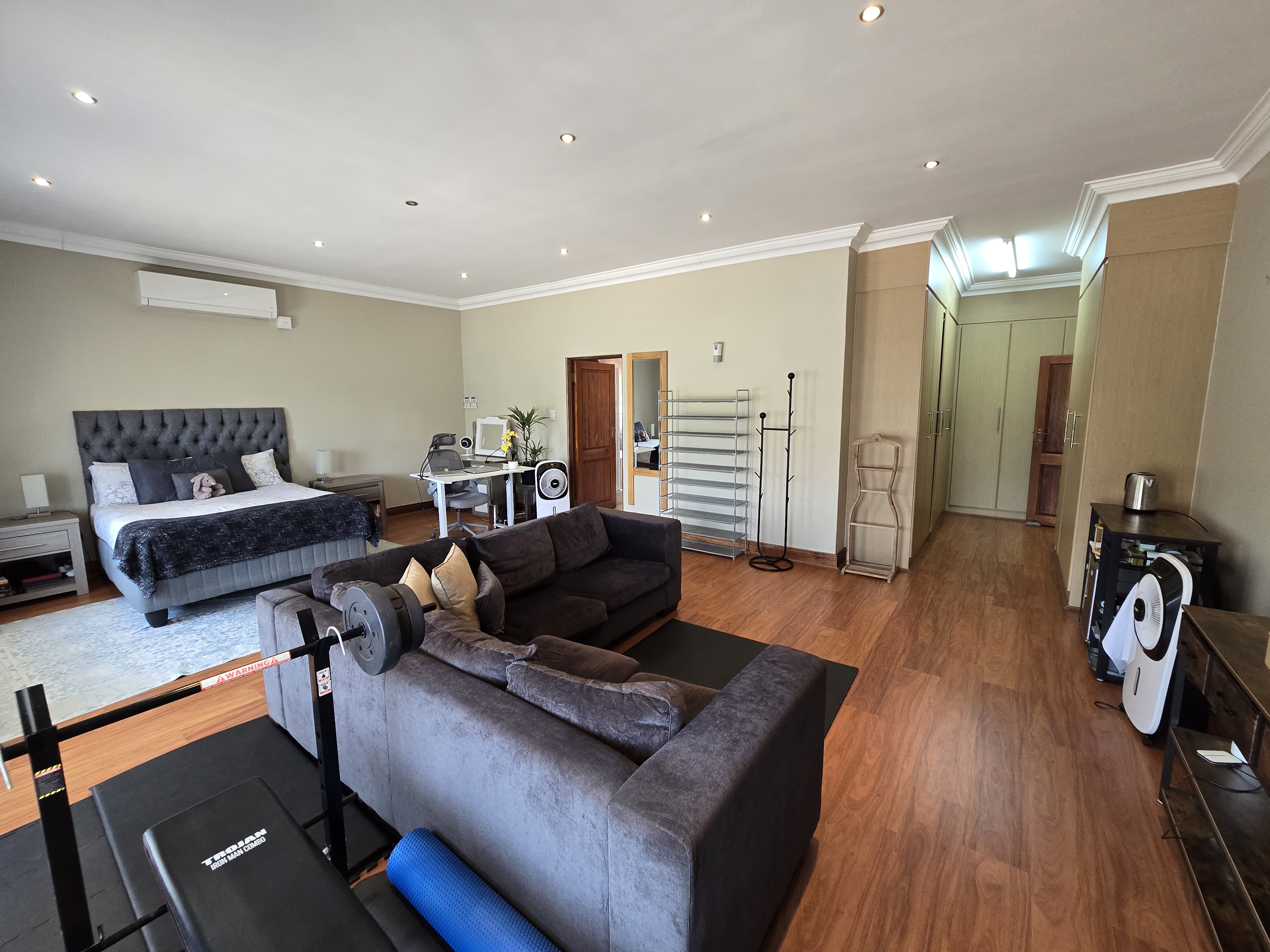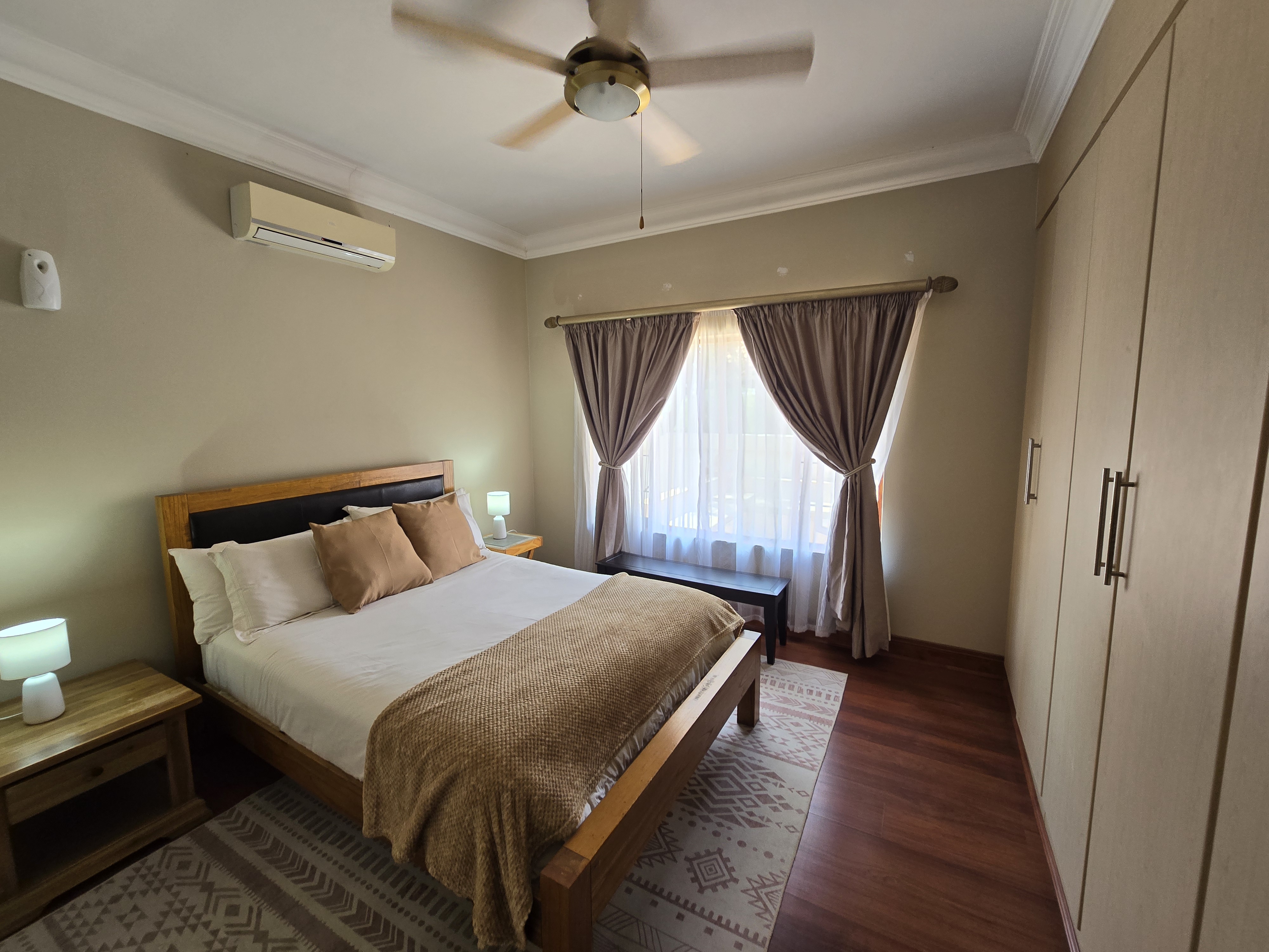 Accommodation includes four well-appointed bedrooms. Downstairs features a guest bedroom with an en-suite bathroom, ideal for visitors or extended family. Upstairs offers three additional bedrooms, including a spacious main bedroom complete with an en-suite bathroom, ample built-in cupboard space, and its own private balcony. All bedrooms are fitted with air conditioning, ensuring year-round comfort.