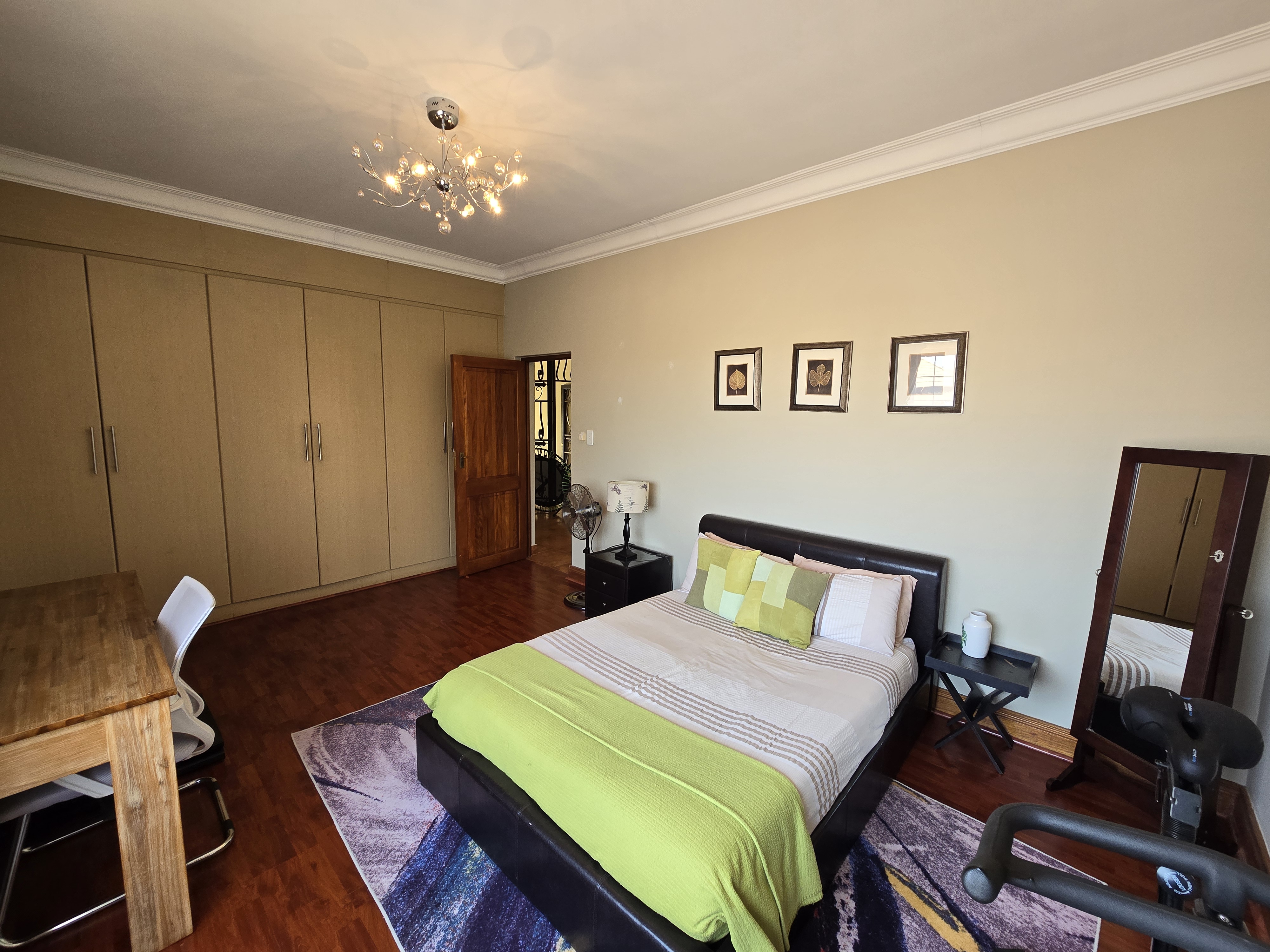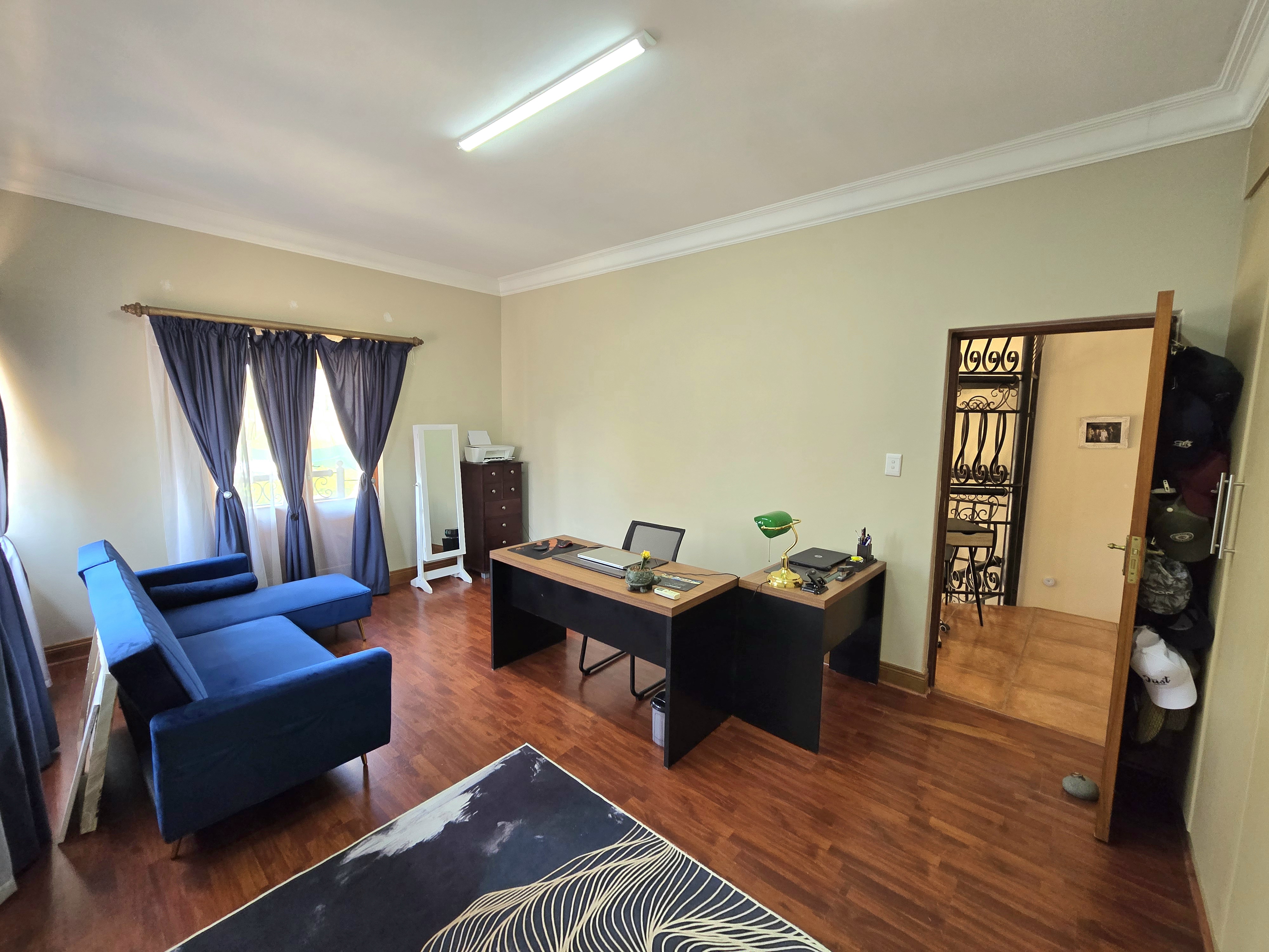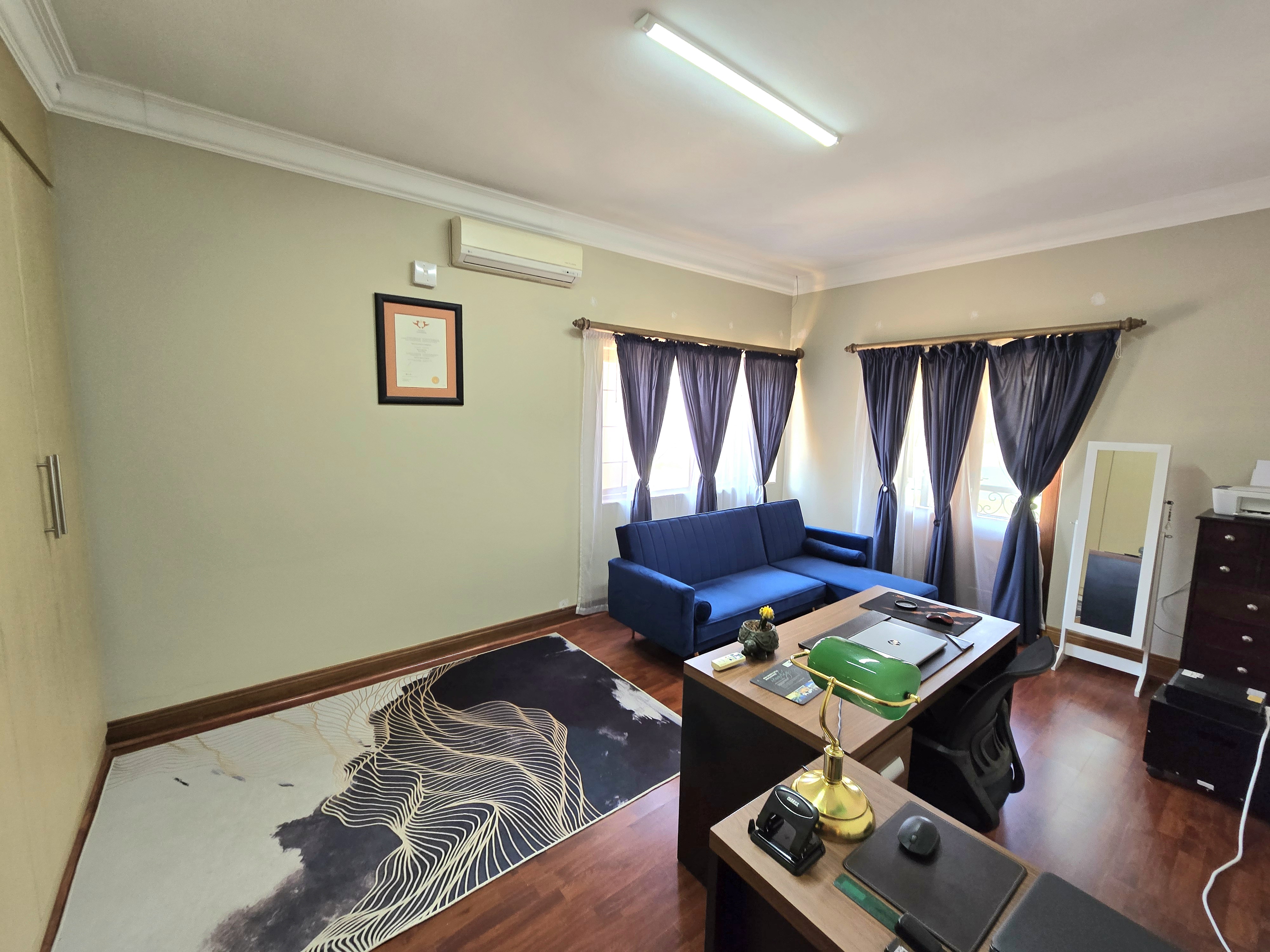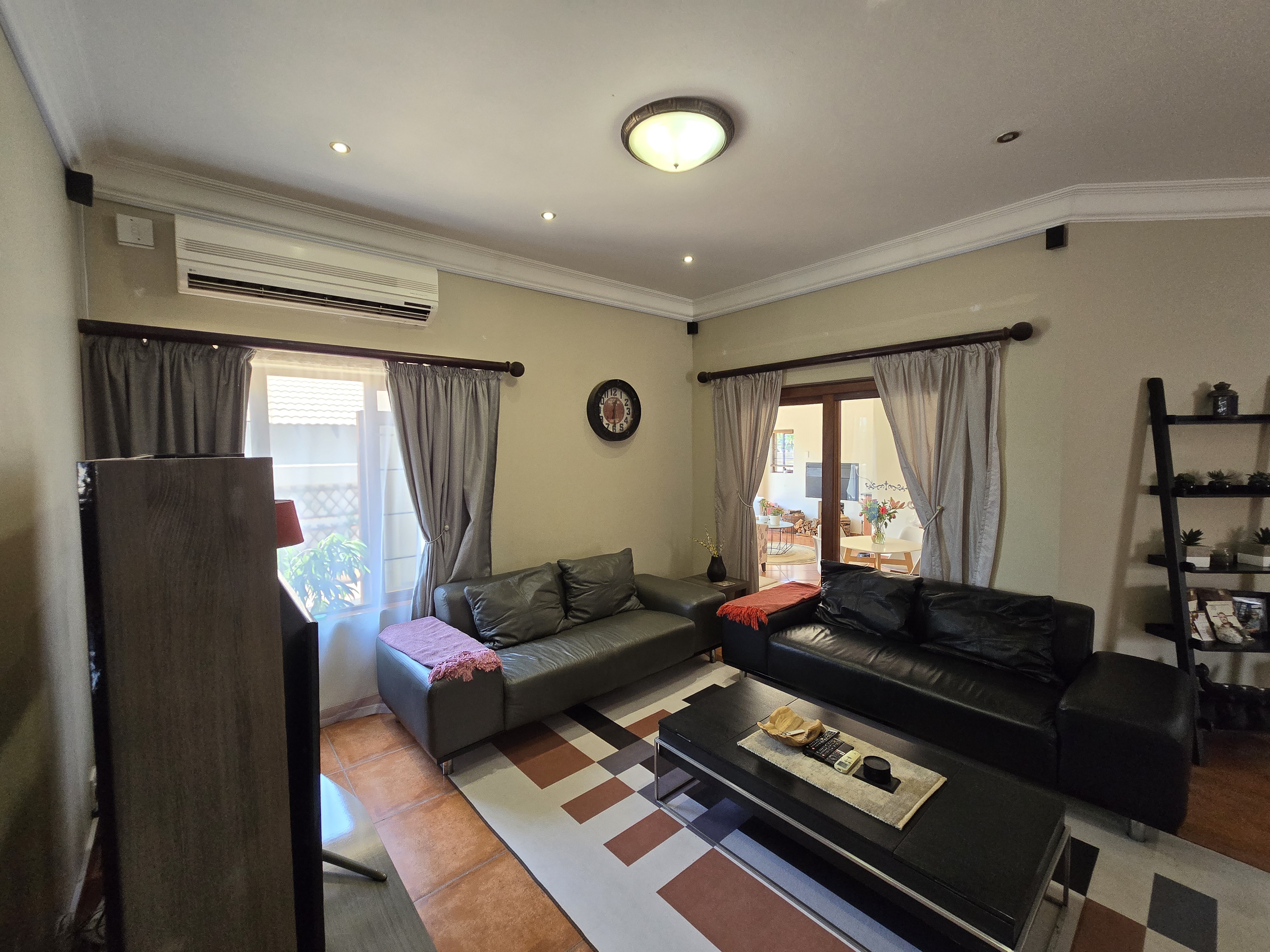 Accommodation includes four well-appointed bedrooms. Downstairs features a guest bedroom with an en-suite bathroom, ideal for visitors or extended family. Upstairs offers three additional bedrooms, including a spacious main bedroom complete with an en-suite bathroom, ample built-in cupboard space, and its own private balcony. All bedrooms are fitted with air conditioning, ensuring year-round comfort.