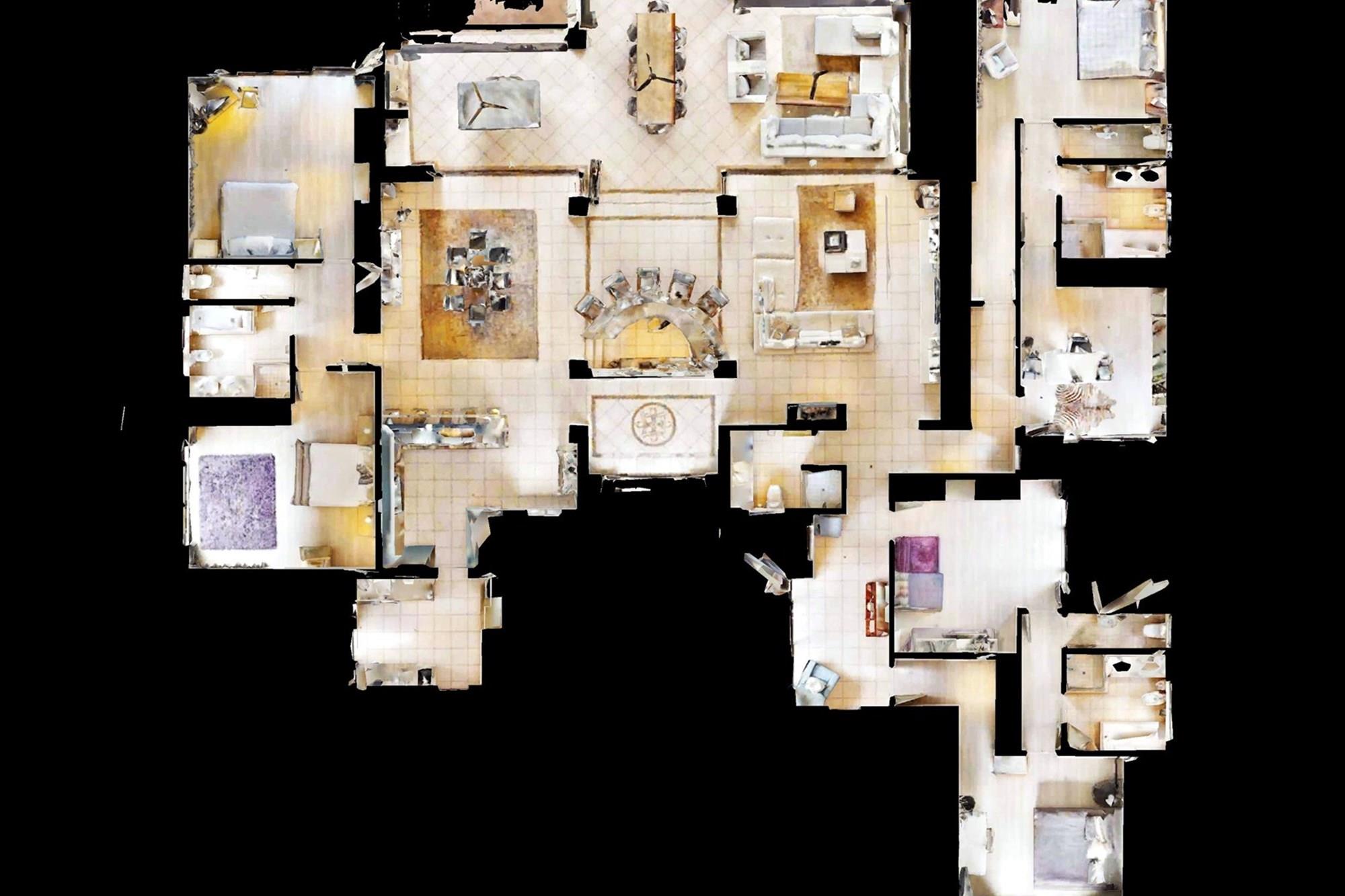 On the east wing, two more bedrooms share a full bathroom, offering comfortable accommodation for family or guests. An outside bedroom, with its own separate entrance and full bathroom, could also serve as staff quarters.