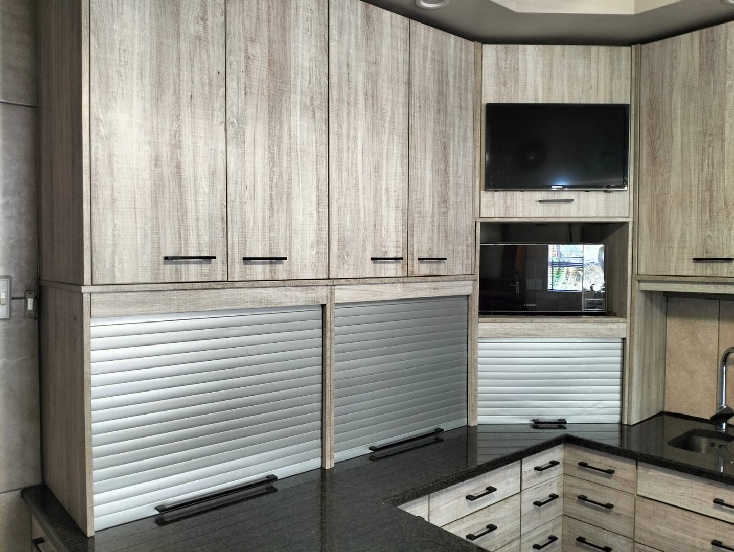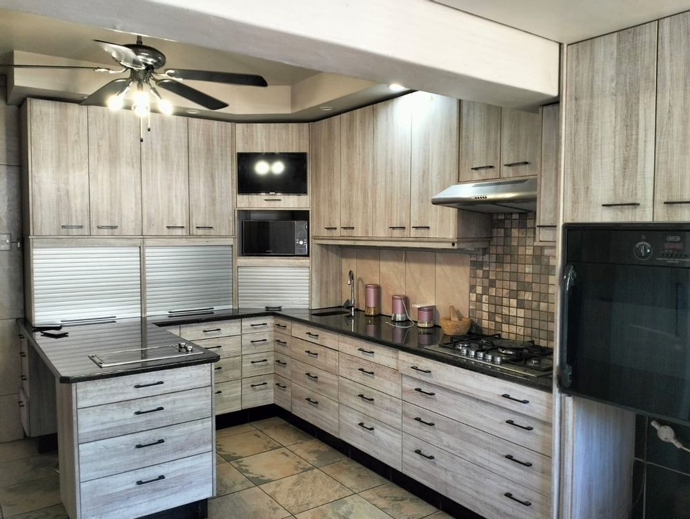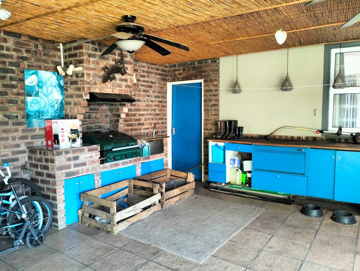 At the heart of this home lies the expansive, modern kitchen, meticulously designed with sleek built-in cabinetry, a gas hob, and an eye-level electric oven. Thoughtfully equipped with a dishwasher connection, this kitchen makes meal preparation effortless. The generously sized dining area flows seamlessly into the kitchen, creating the perfect space for family meals, and leads out to a covered braai area—ideal for entertaining guests.
