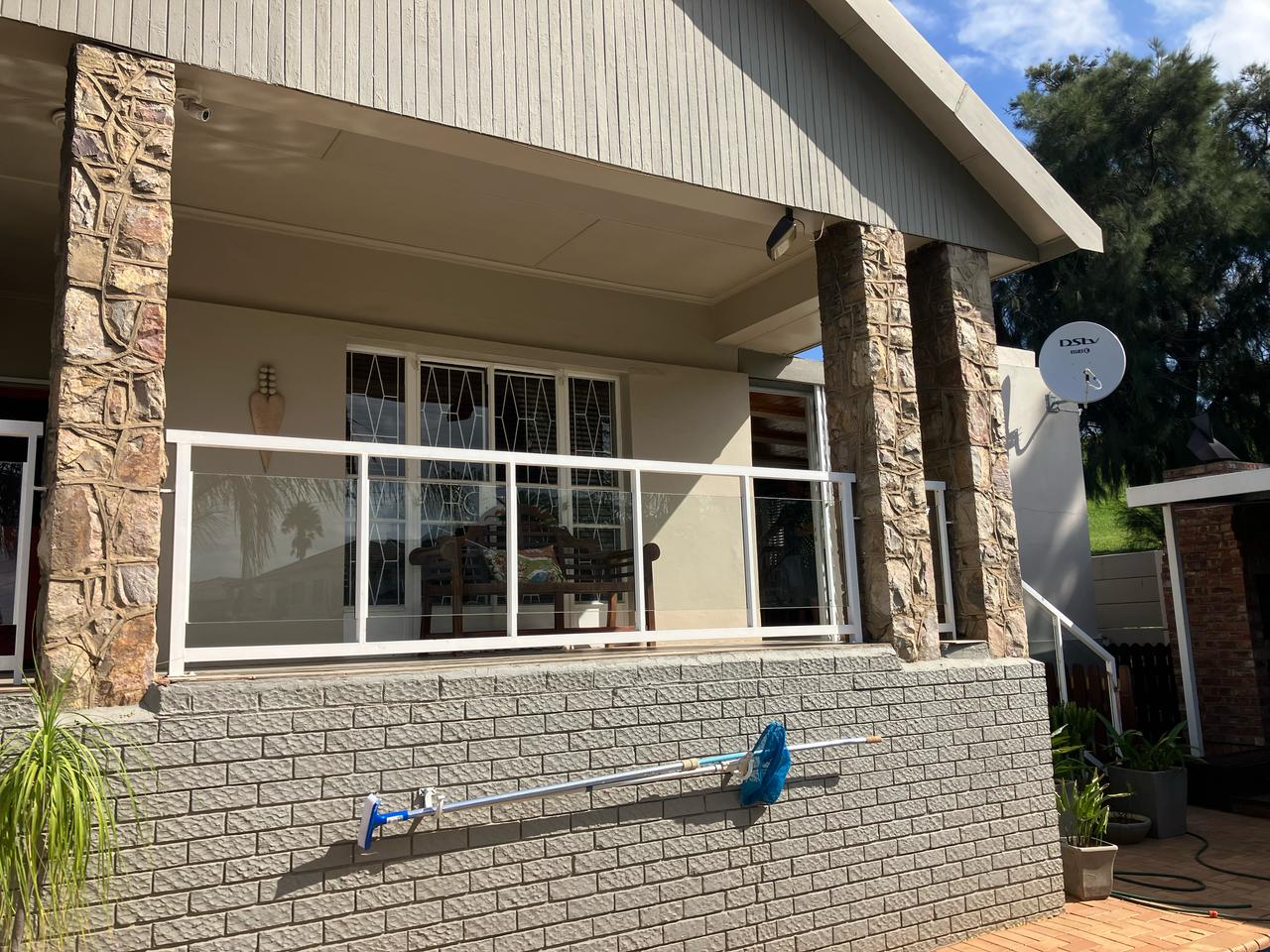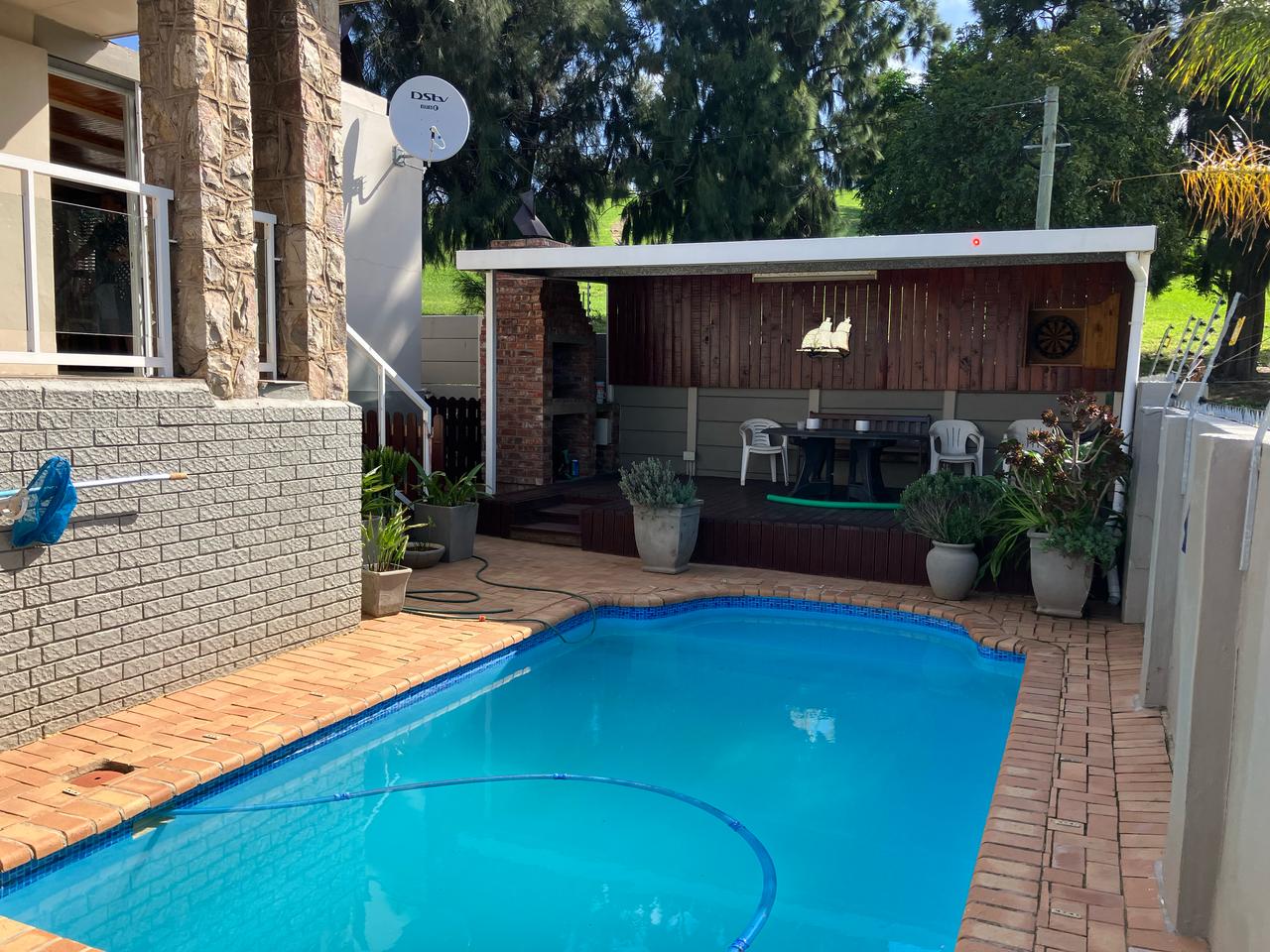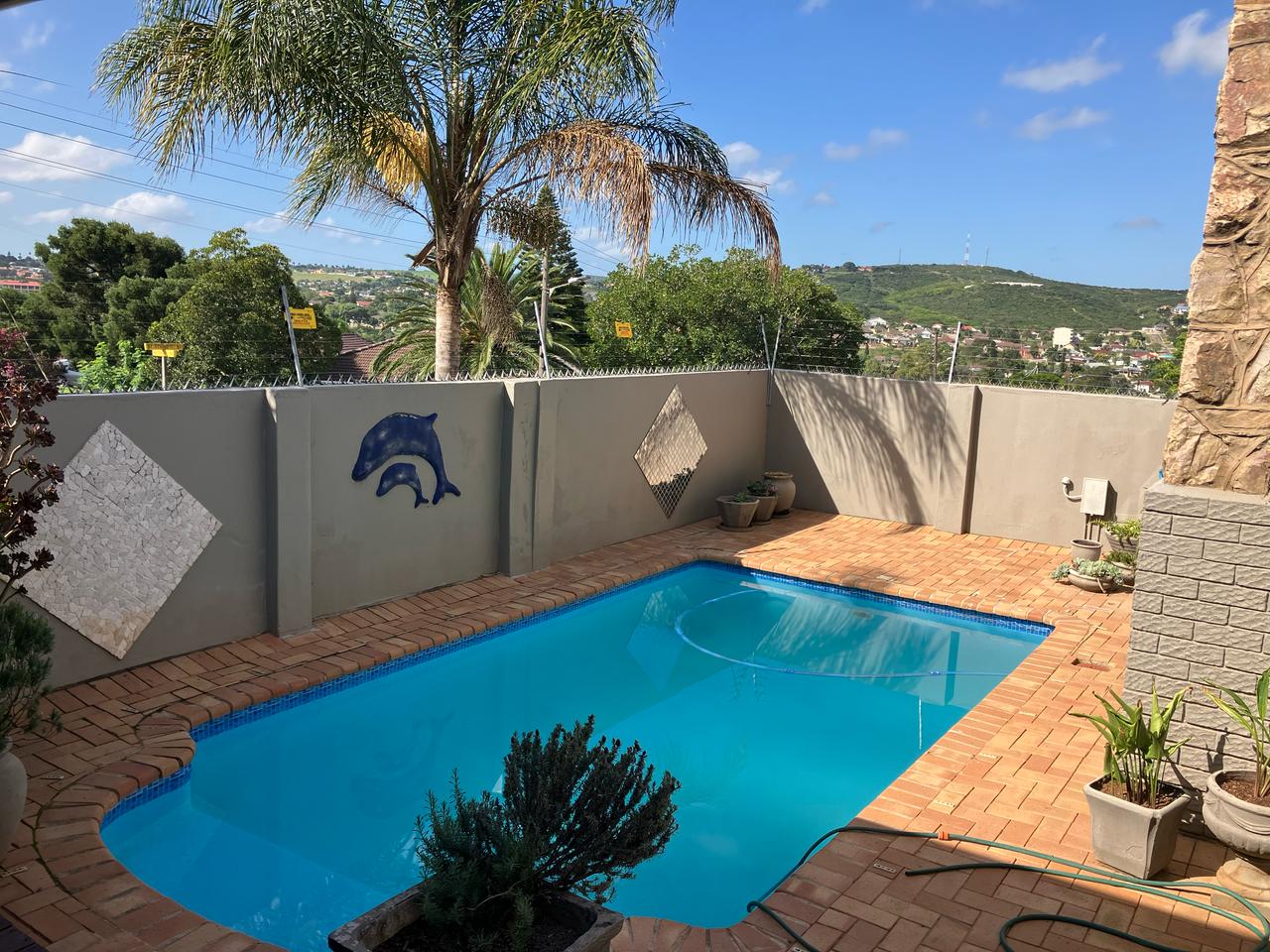 Patio overlooks sparkling pool and beautiful views over Uitenhage. Added CCTV, Alarm system and electric Fencing. Invertor plus battery. Tandem garage on remote and double carport with driveway gate.