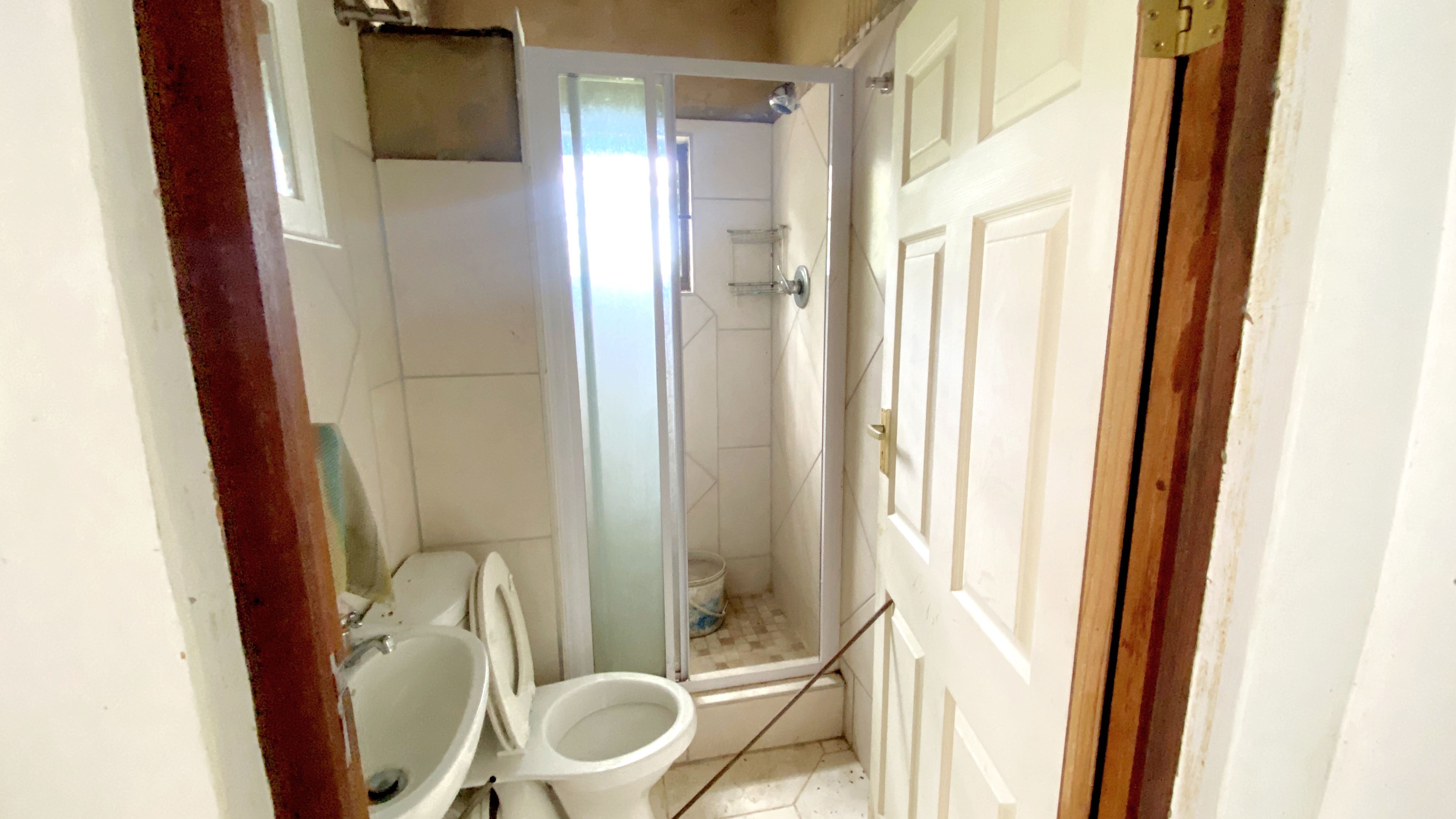 The home features an open plan living area, a partially fitted kitchen, and a bedroom. The bathroom includes a shower, basin, and toilet. With a bit of TLC and creative vision, this space can easily be transformed into a cozy cottage or extended into a larger family home.