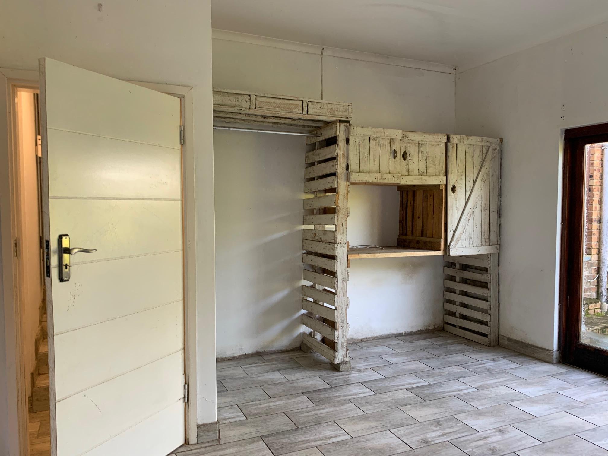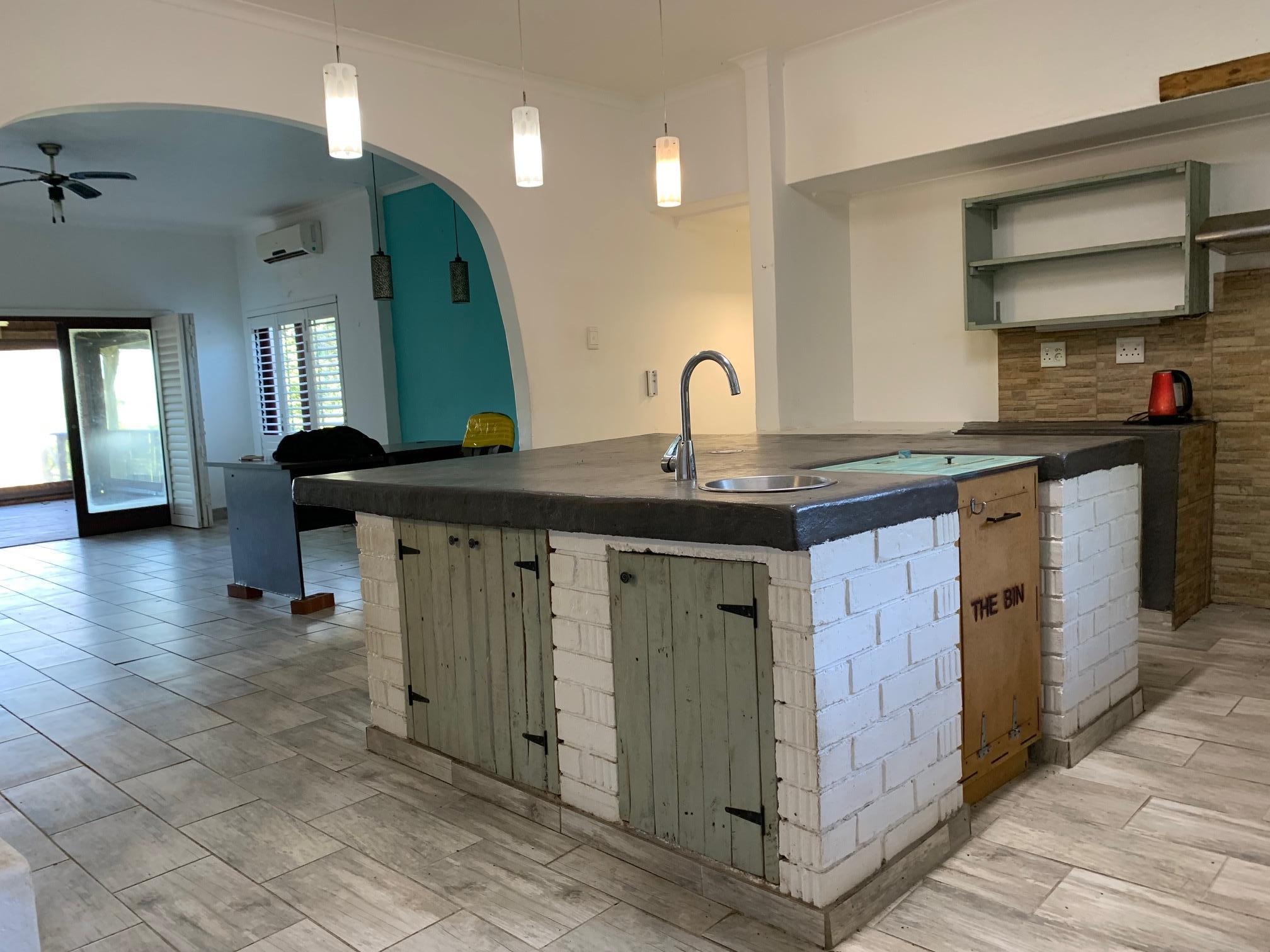 The kitchen with a large, solid centre island, space for appliances and cupboard space.