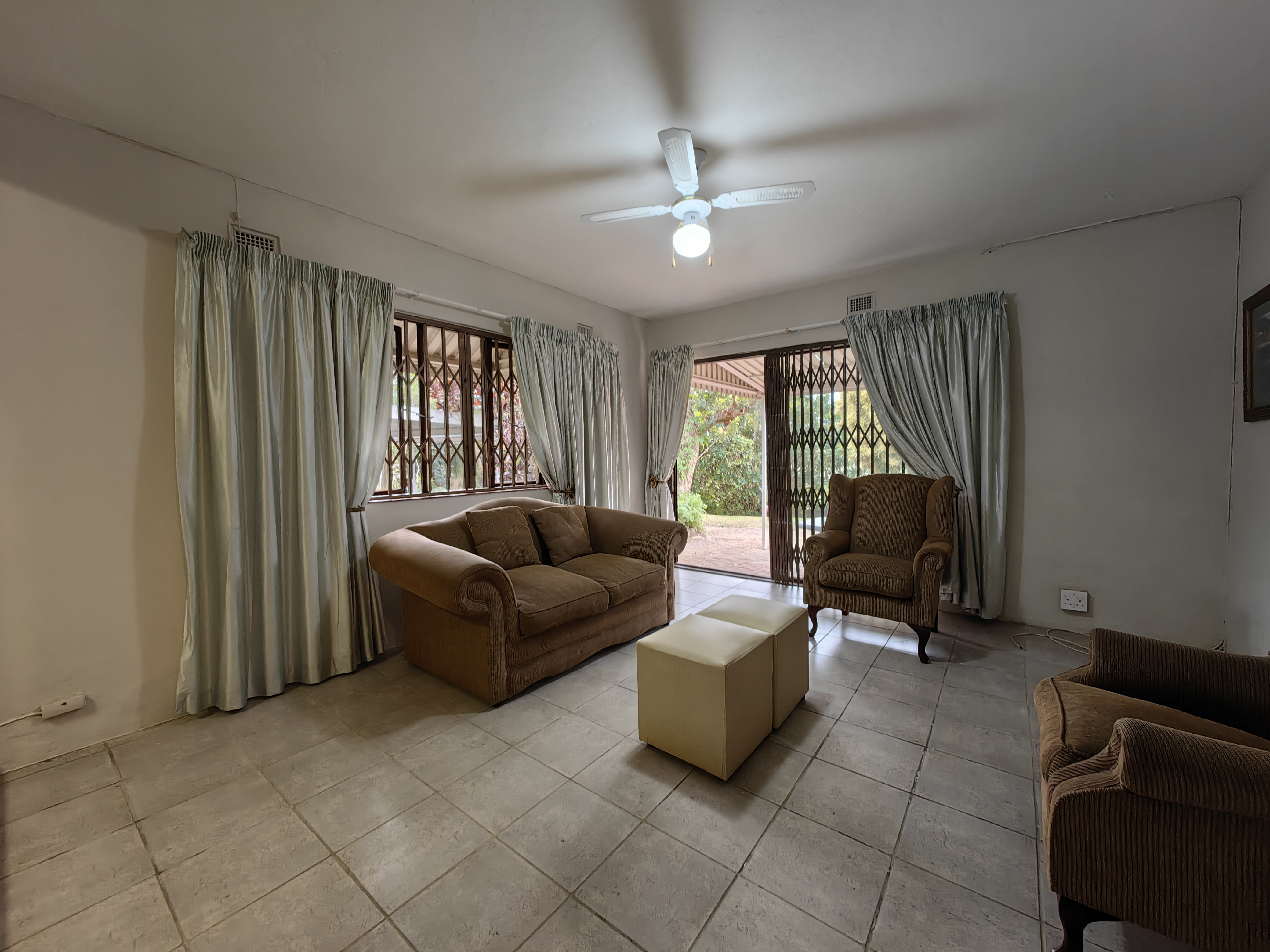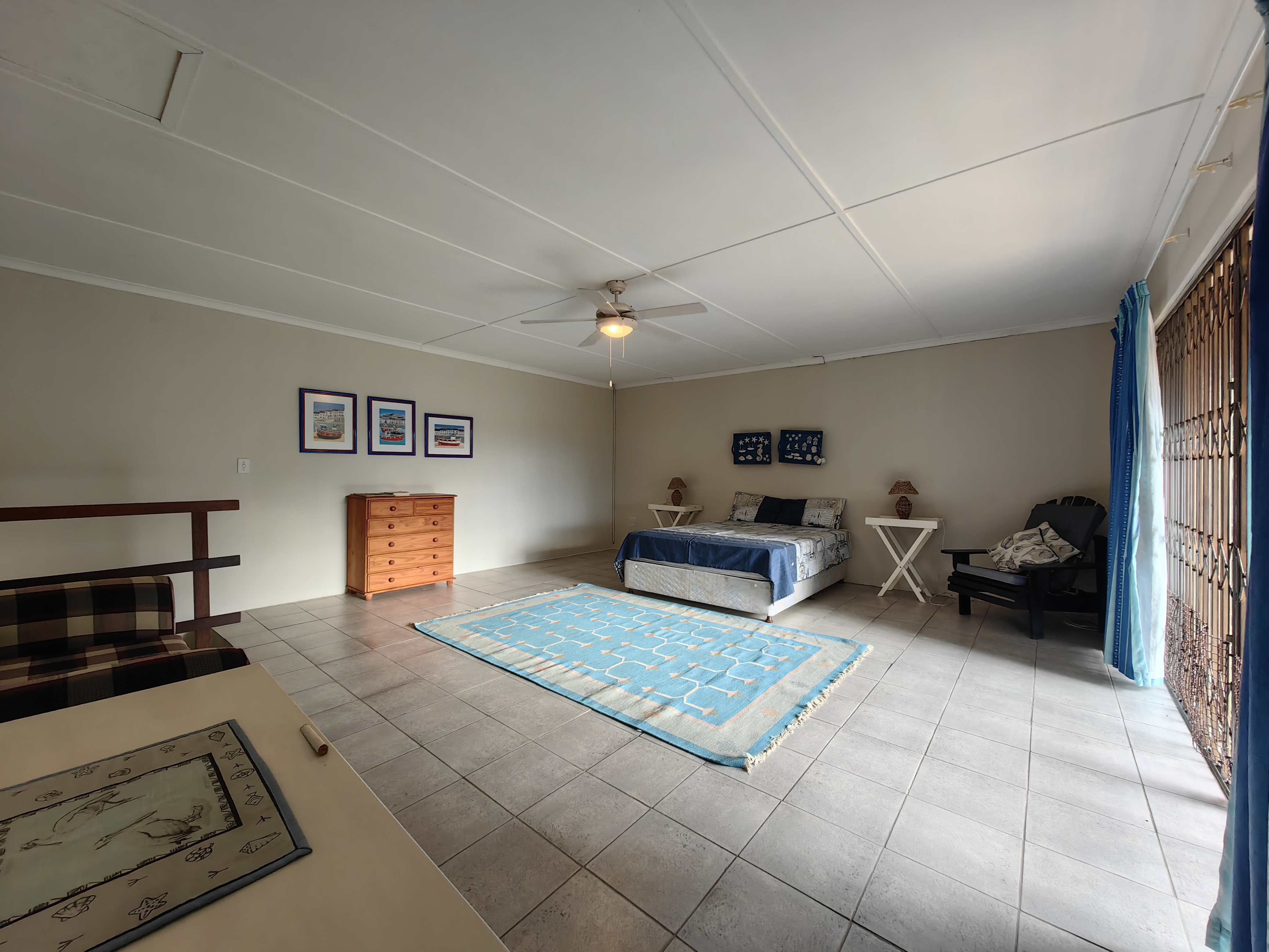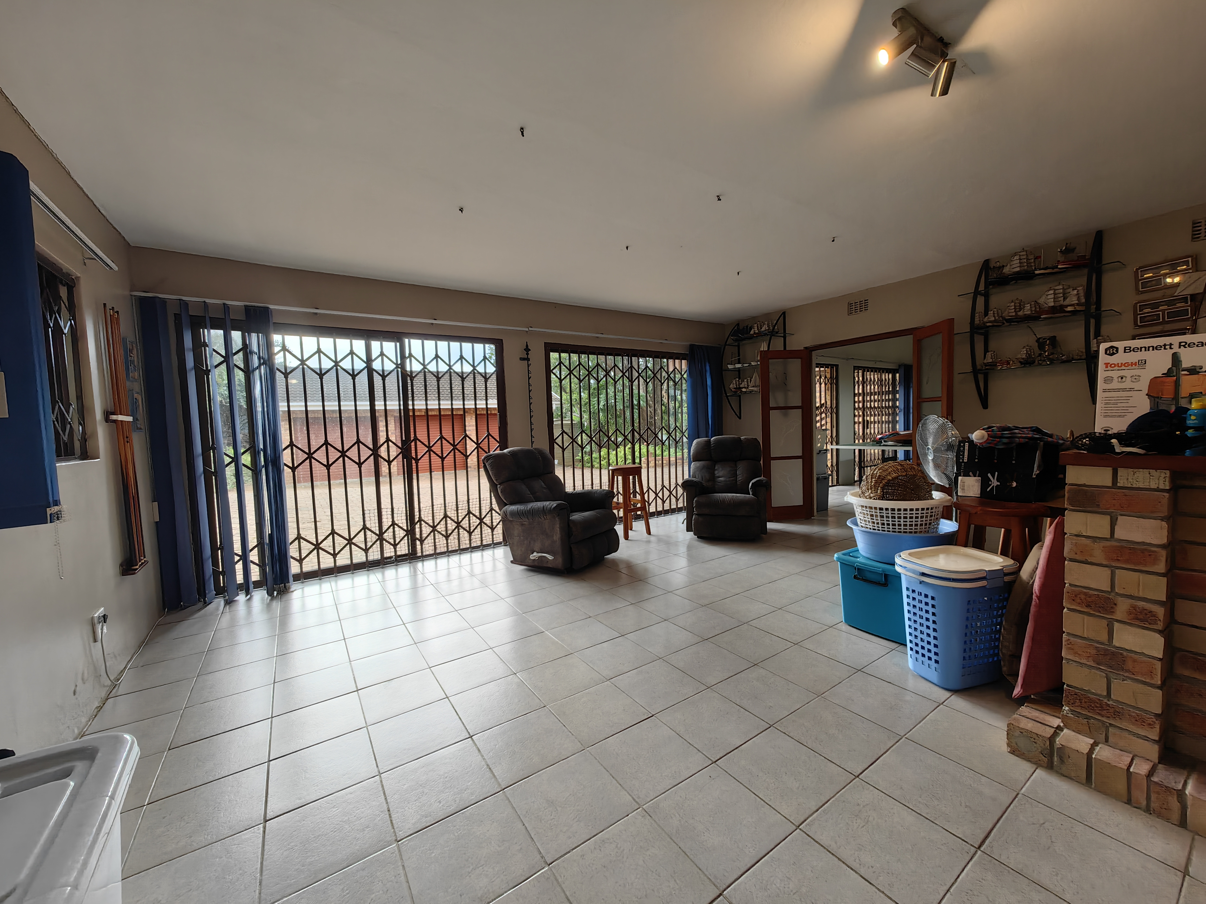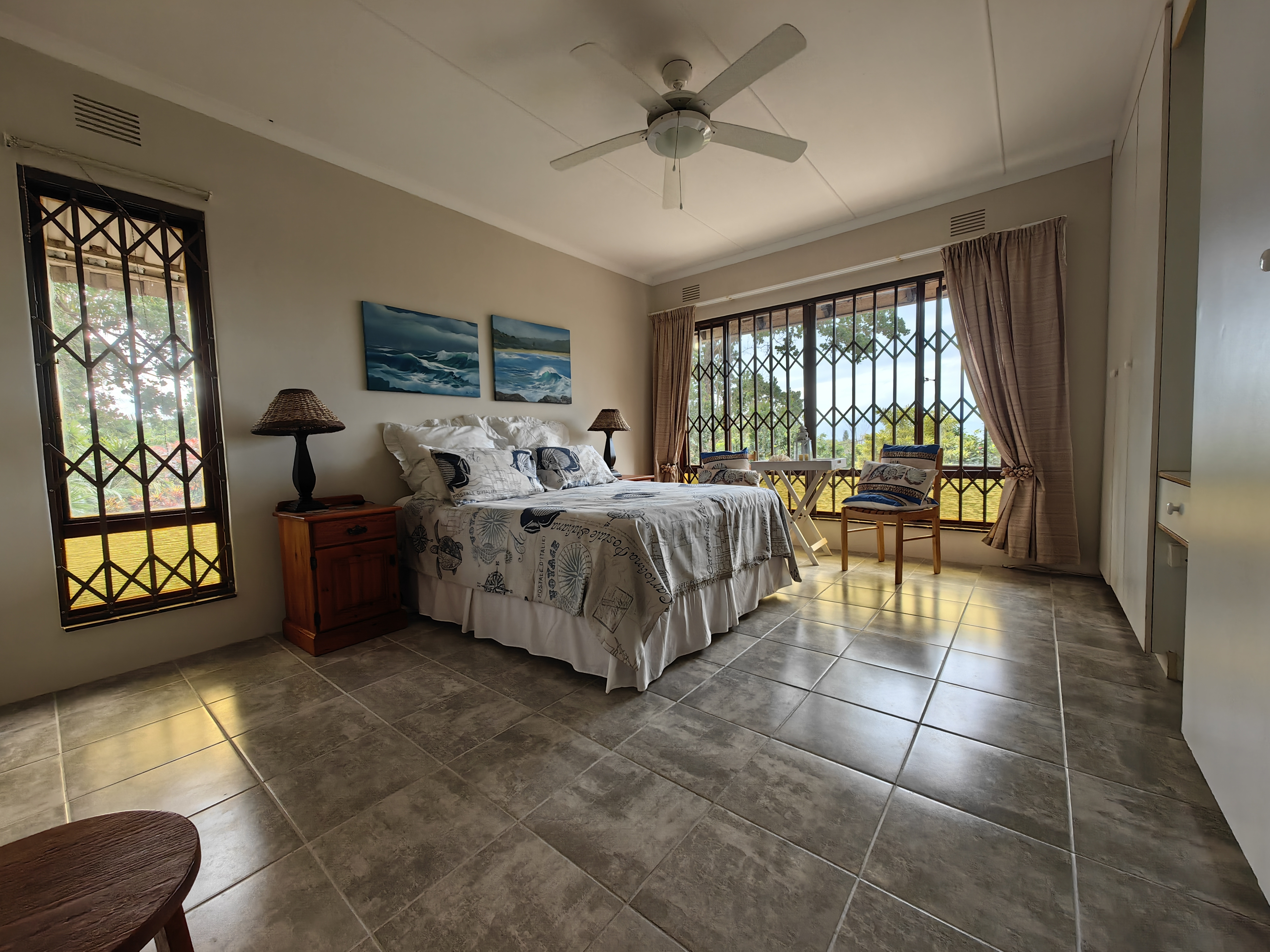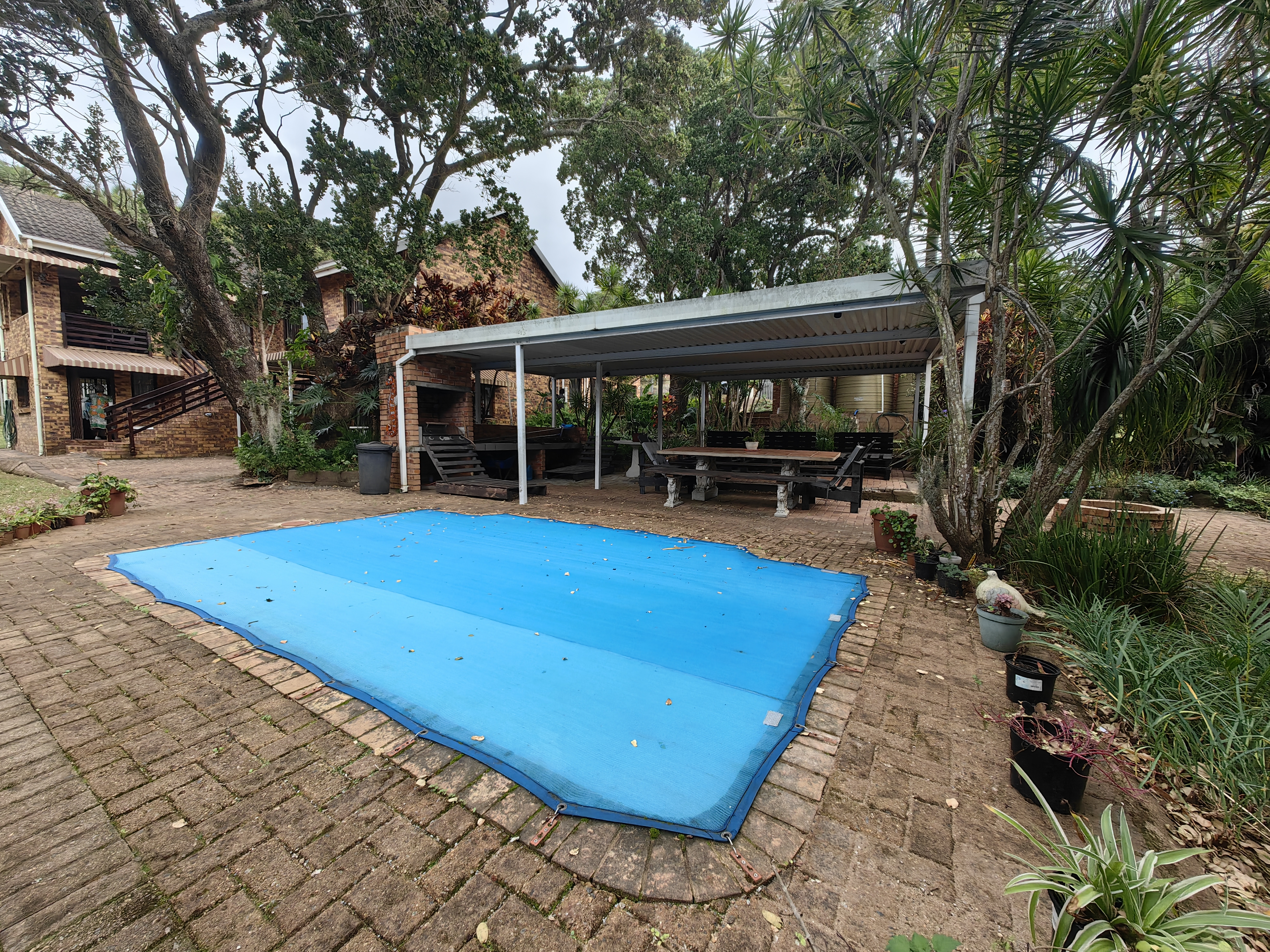 The main home boasts four bedrooms, with two situated on the “entertainment side” of the house for easy access to the large games and playroom that flows seamlessly outdoors. Here, the party continues in style — a beautiful level garden frames a generous lapa and braai area, overlooking a sparkling swimming pool and set within a lush, well-established garden with distant sea views.